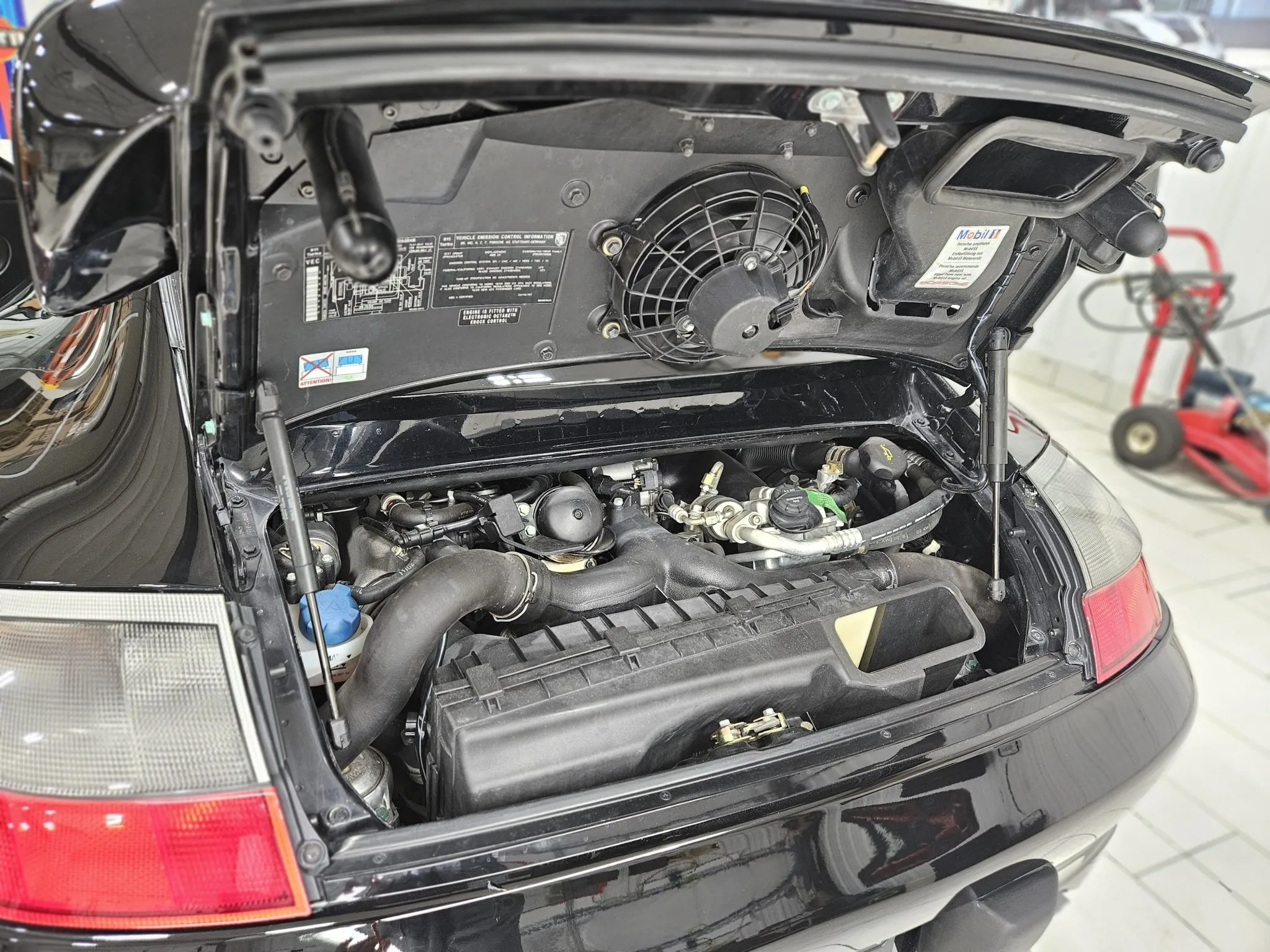 The car was specified with a carbon-fiber three-spoke steering wheel, shift knob, and handbrake lever, and additional equipment includes a speed-activated rear spoiler, a sunroof, xenon headlights, integrated fog lights, 18″ Turbo Twist wheels, a Becker-Porsche CDR-220 stereo, and automatic climate control.