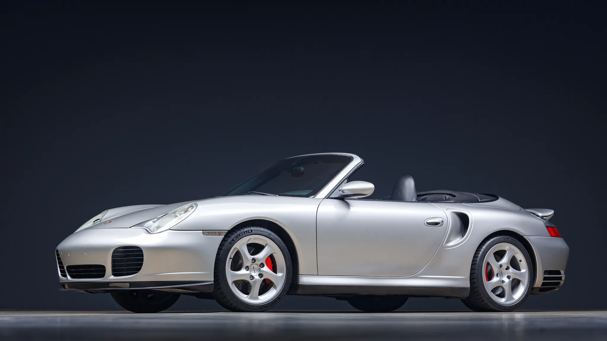 This 2004 Porsche 911 Turbo cabriolet has 65k miles following registration history in Missouri, California, and Oregon, and it was purchased by its current owner in August 2021. The car is finished in Arctic Silver Metallic over black leather and is powered by a twin-turbocharged 3.6L flat-six that drives all four wheels via a six-speed manual transaxle.