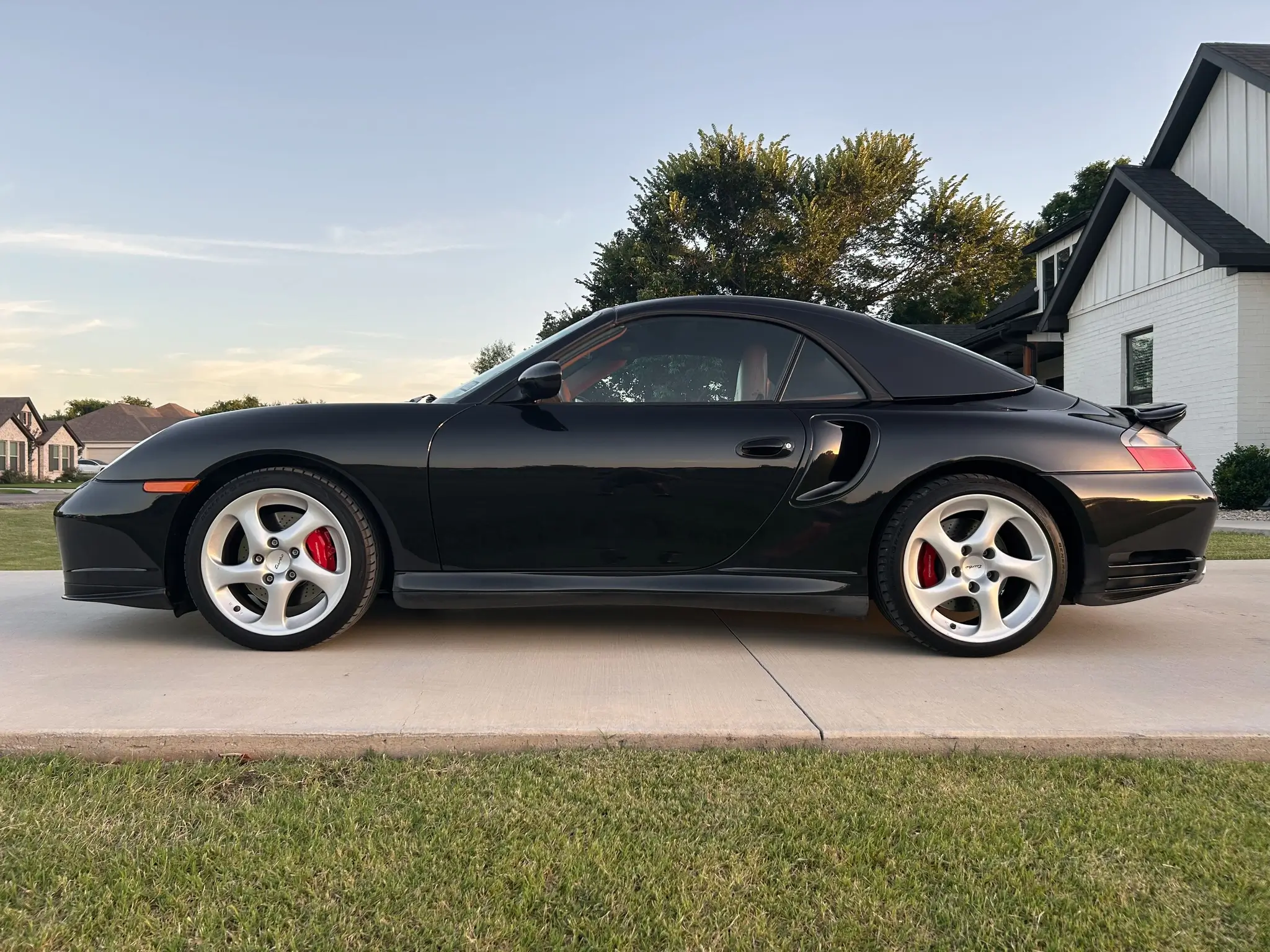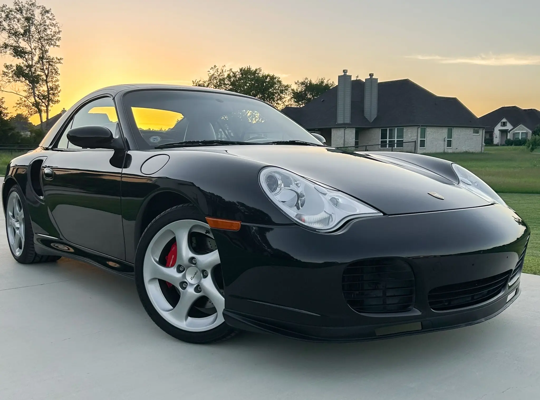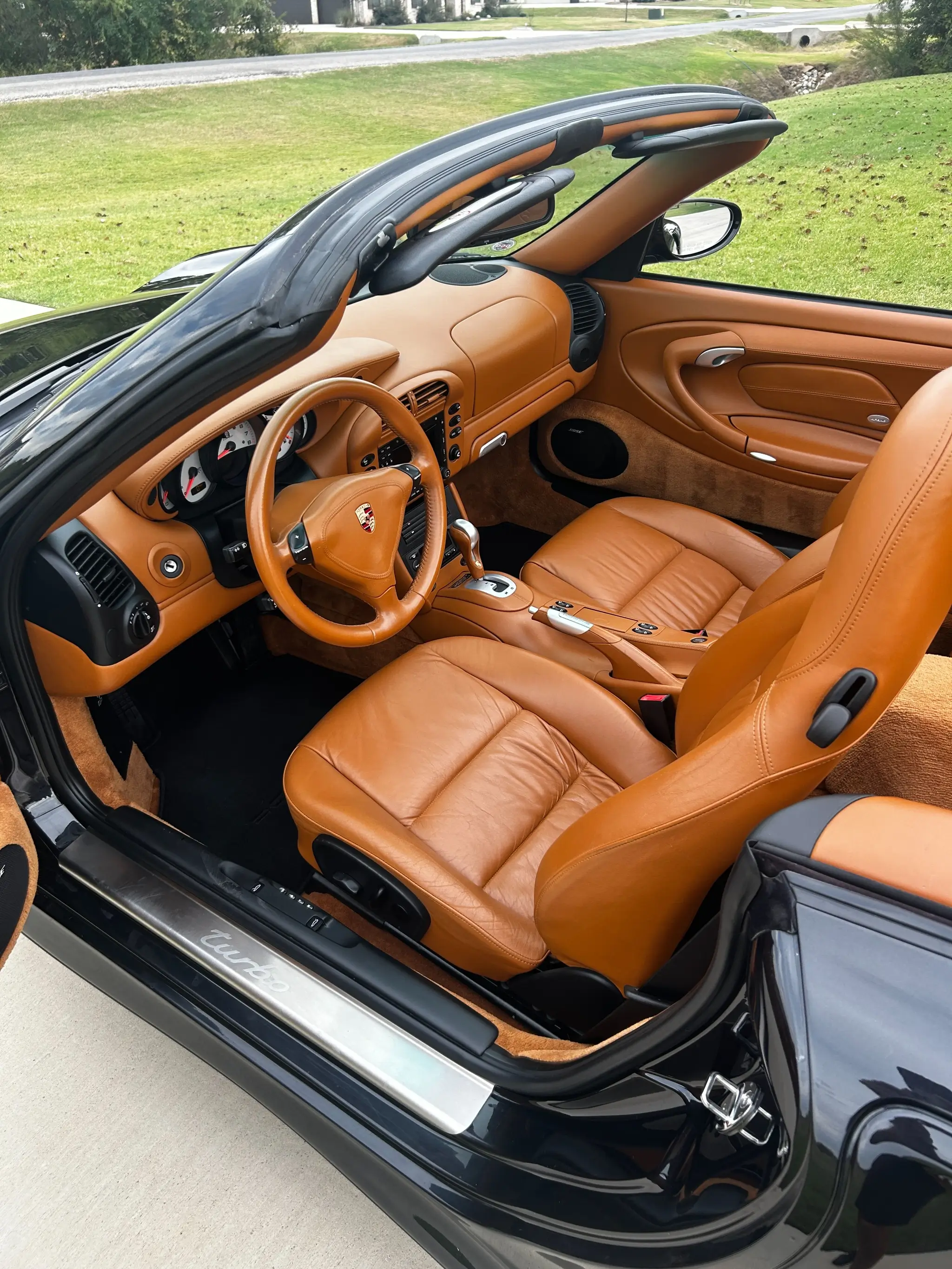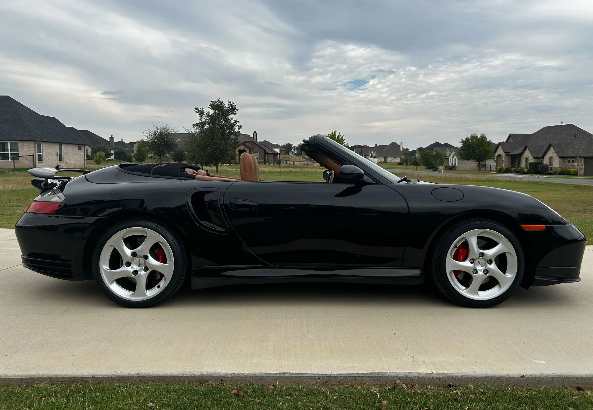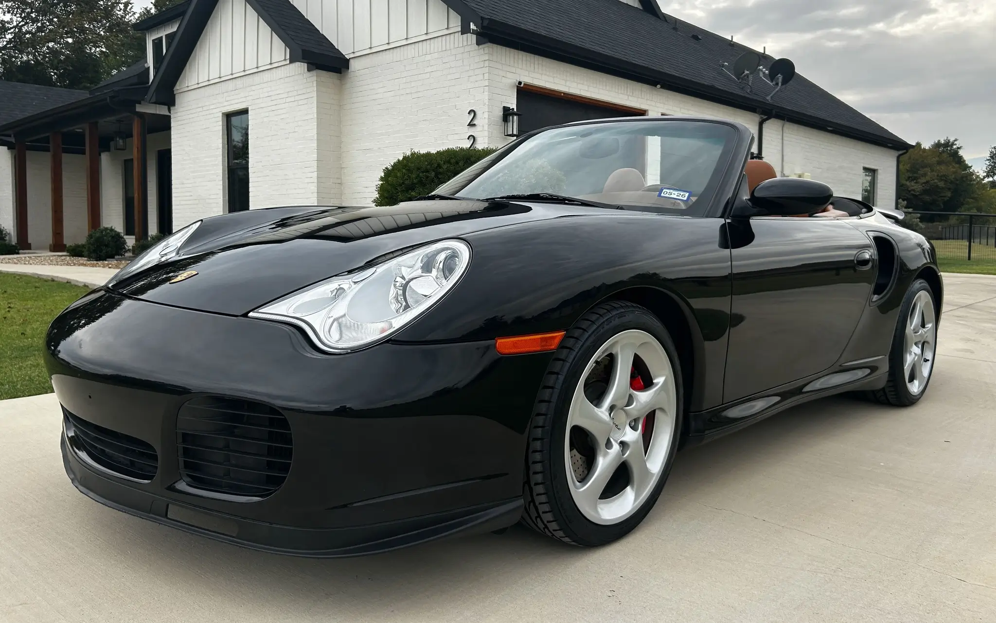 Presented in Basalt Black Metallic over premium Brown Natural Leather upholstery, this 2004 Porsche 996 Turbo Cabriolet is equipped with a twin-turbocharged 3.6-liter Mezger flat-six engine driving all four wheels through a 5-speed Tiptronic S automatic transmission.