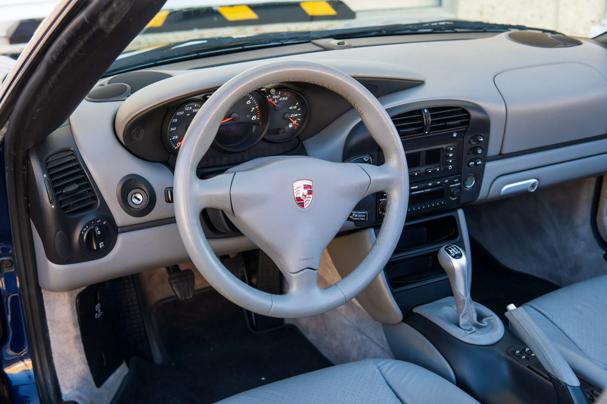 Equipment includes a black soft top, a speed-activated rear spoiler, 17″ Boxster S II wheels, power-adjustable seats, automatic climate control, cruise control, a Porsche CDR23 stereo, and power windows.