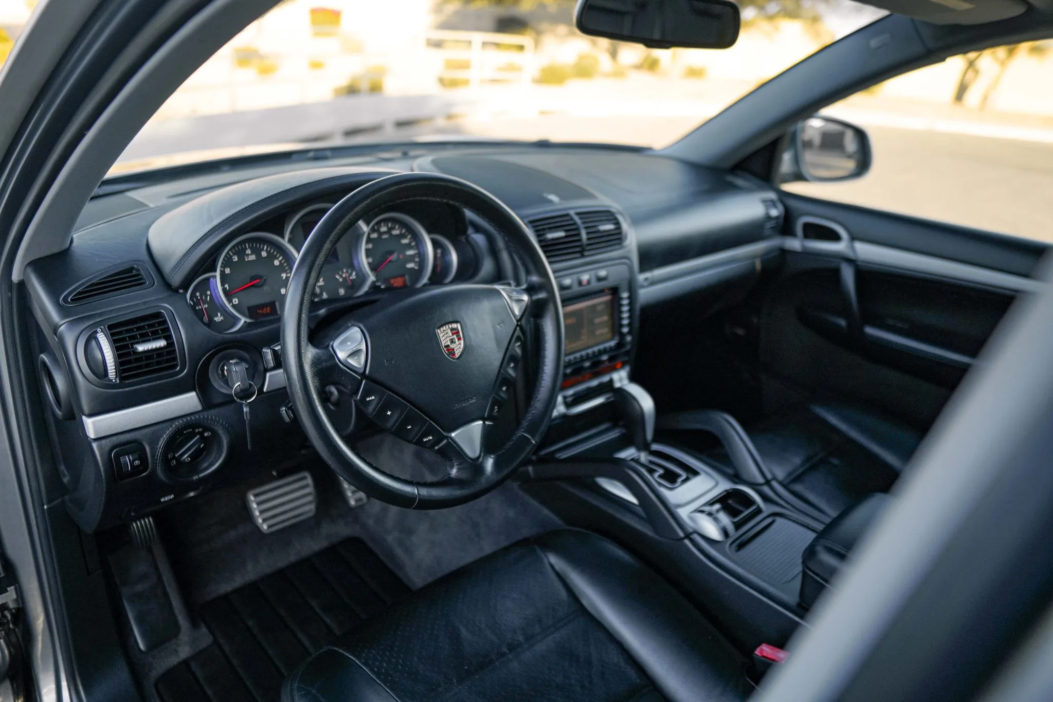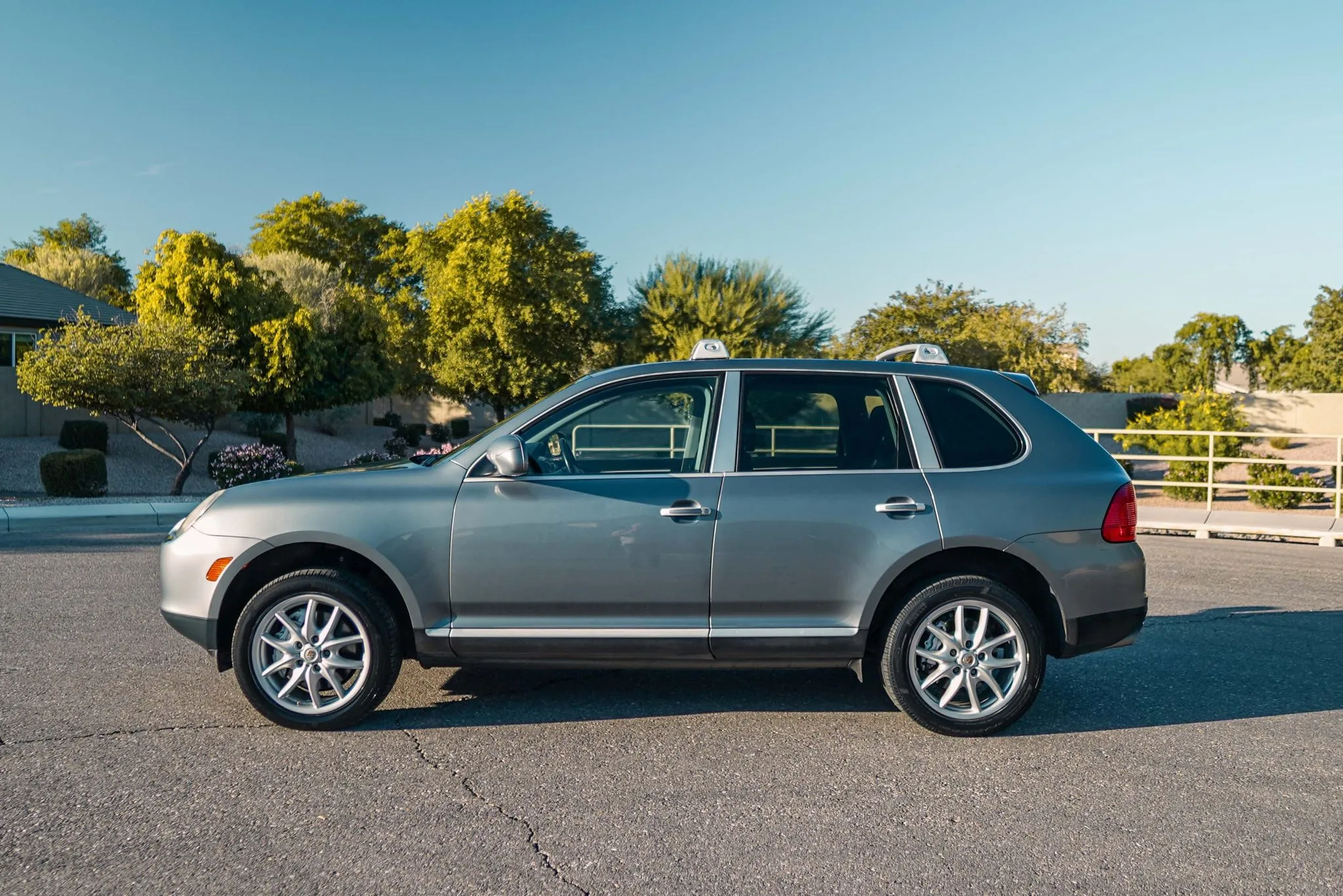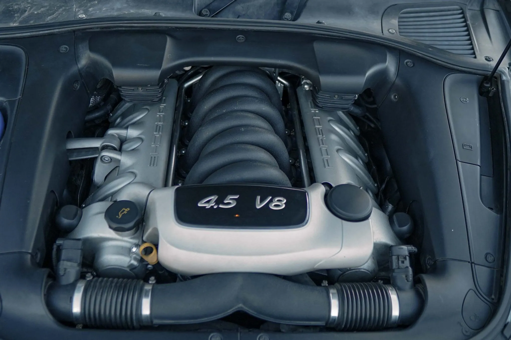 The truck was specified in Titanium Metallic over Black smooth leather and is powered by a 4.5-liter V8 paired with a six-speed Tiptronic S automatic transmission. Equipment includes all-wheel drive, a variable center differential, a sunroof, a receiver hitch, bi-xenon headlights, roof crossbars, 19″ Cayenne Design alloy wheels, a Bose sound system, dual-zone automatic climate control, and Porsche Communication Management with navigation.