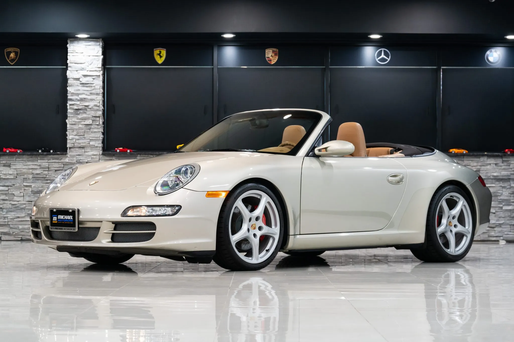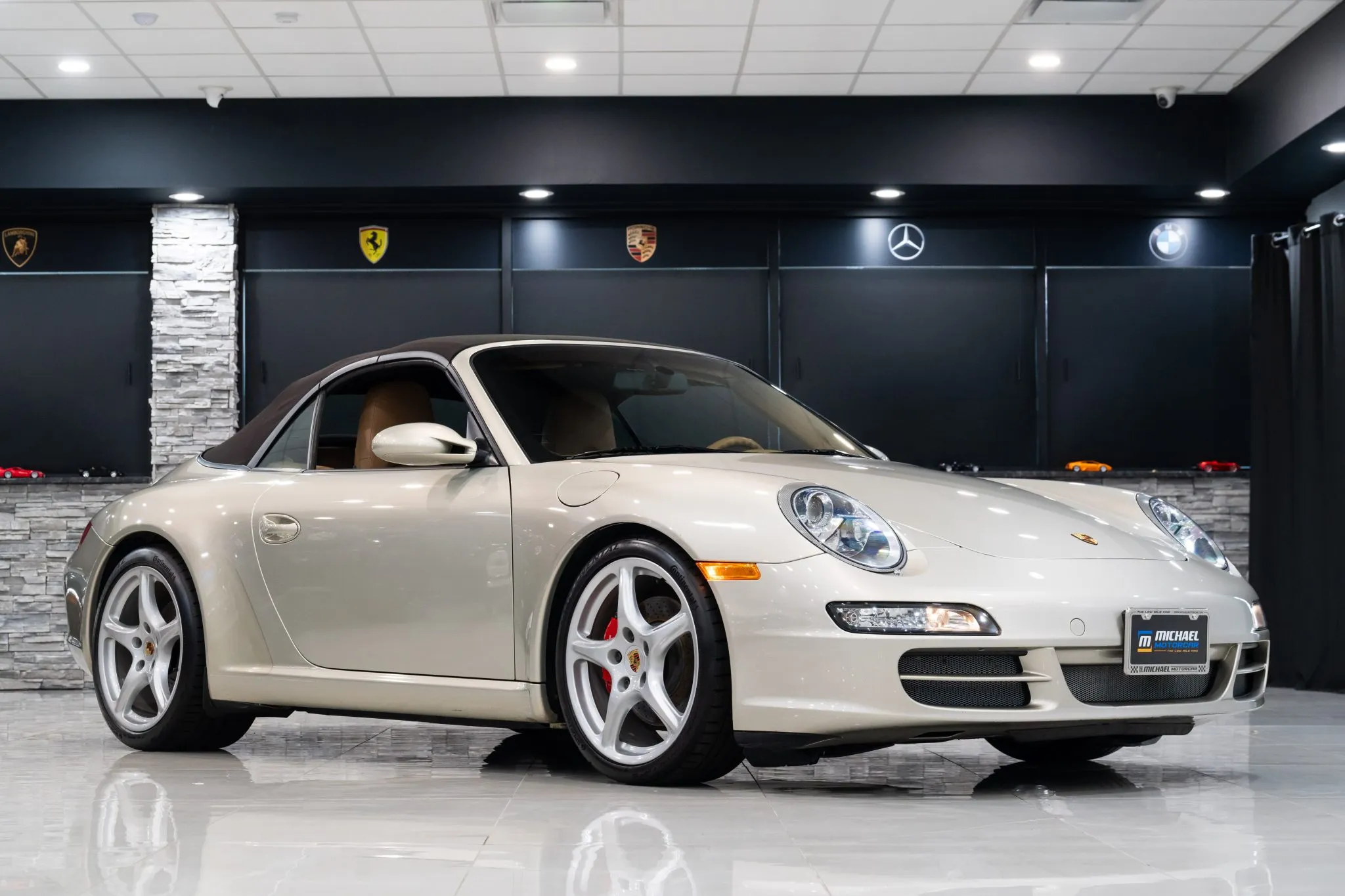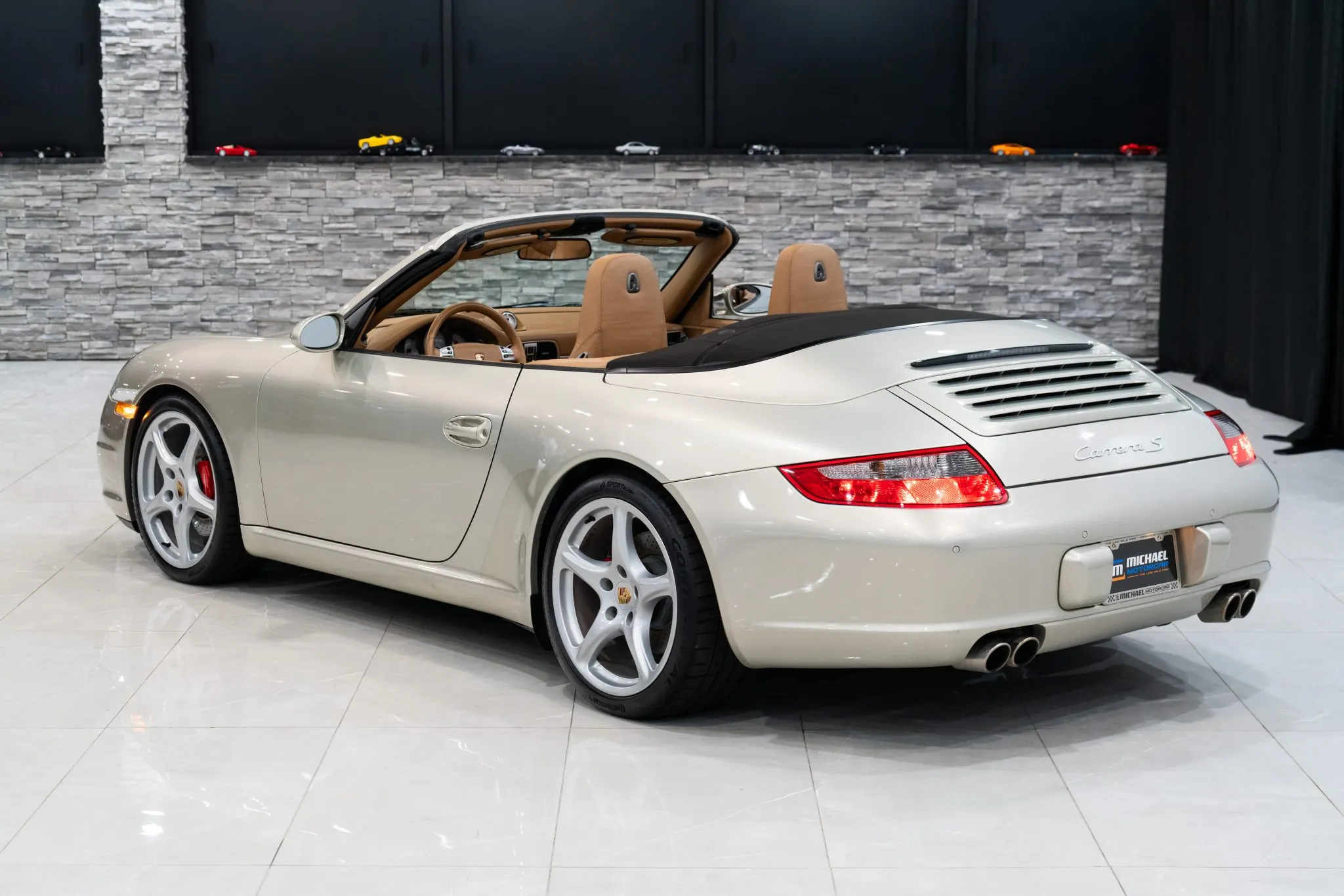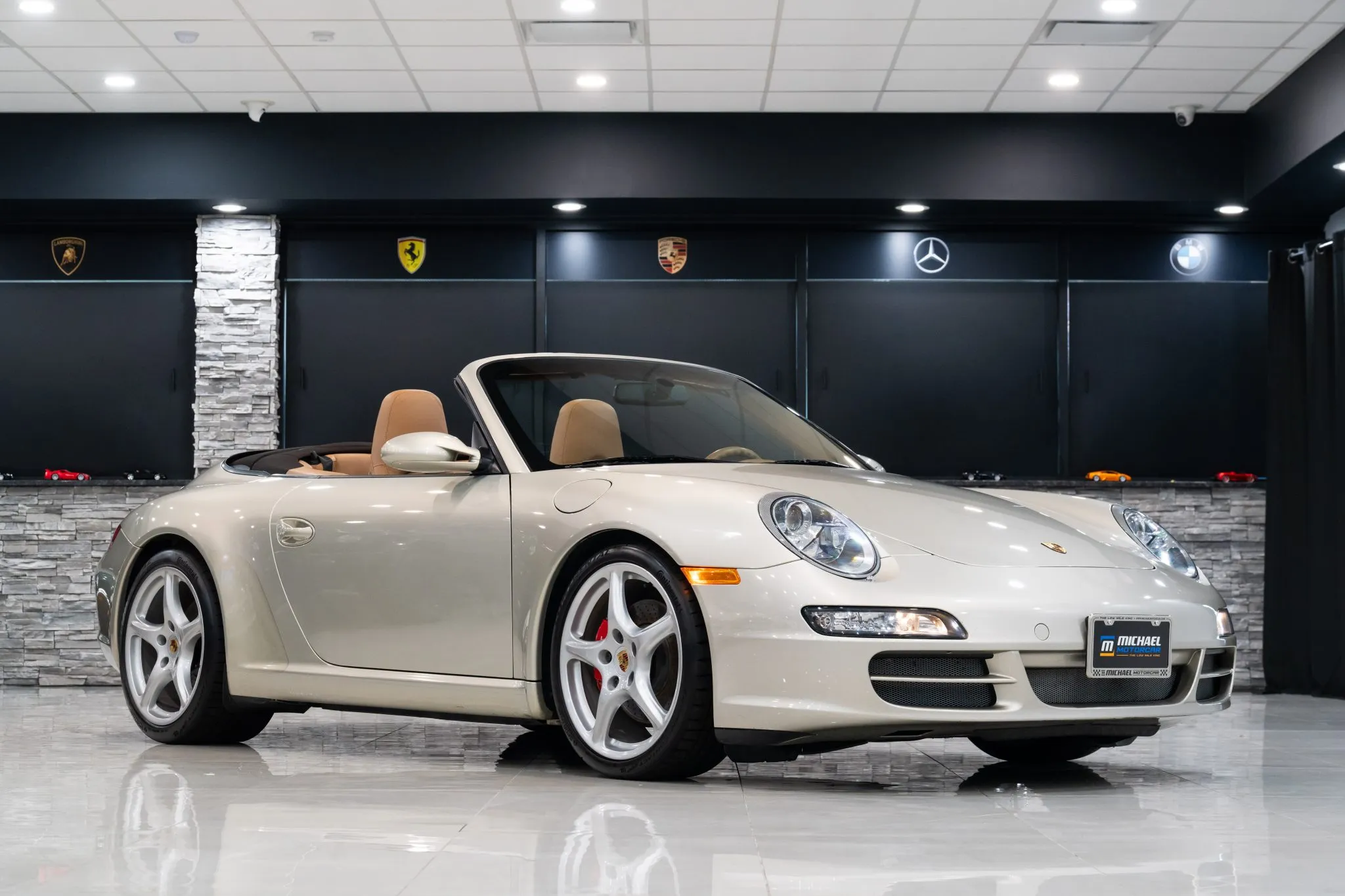 This 2005 Porsche 911 Carrera S cabriolet is finished in paint-to-sample Prosecco Metallic over Sand Beige Full Supple leather and has 59k miles following history in Virginia, Arkansas, Michigan, and Ontario, Canada.
