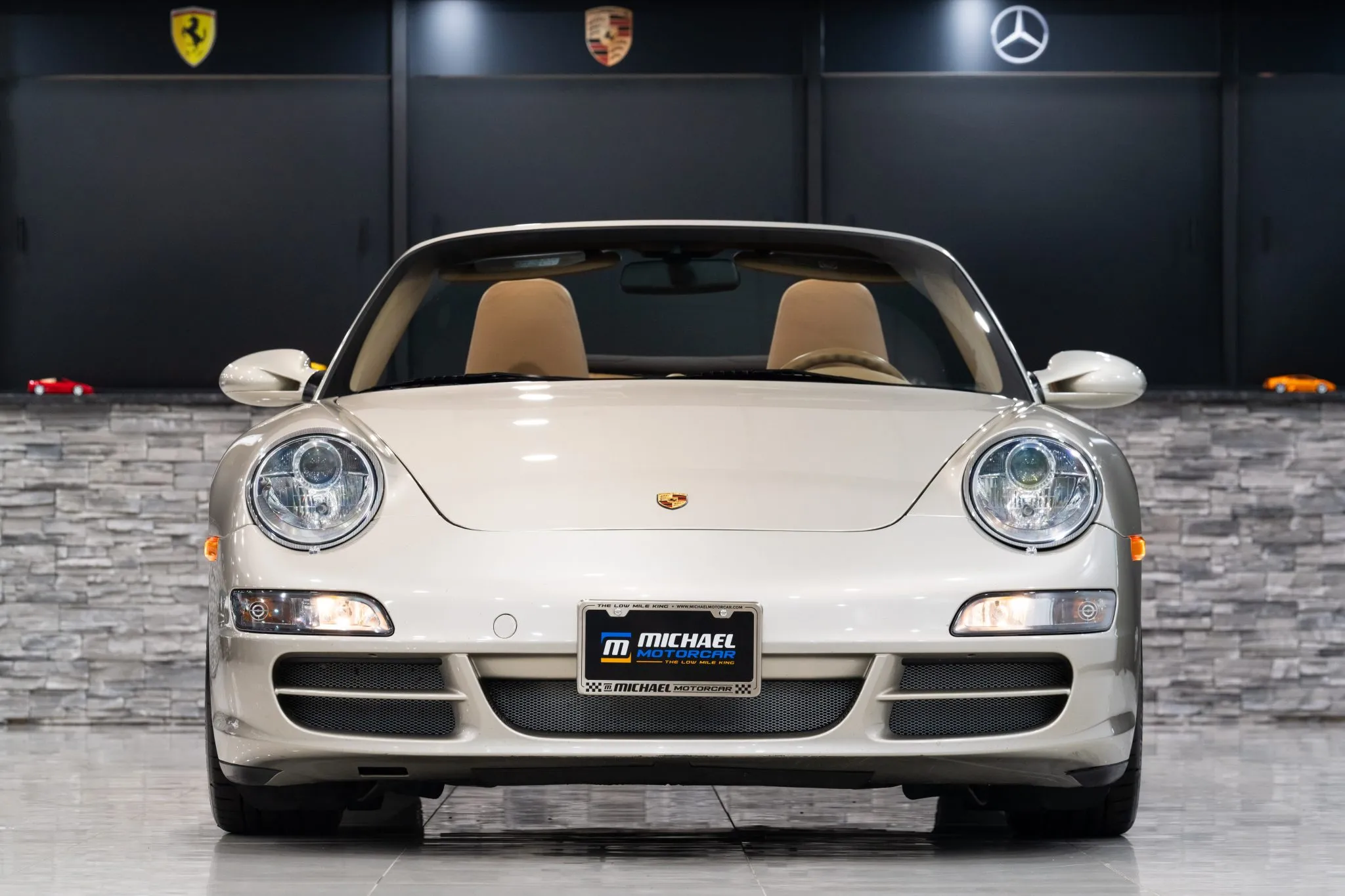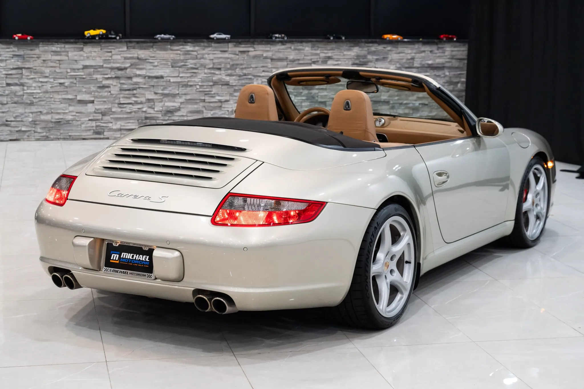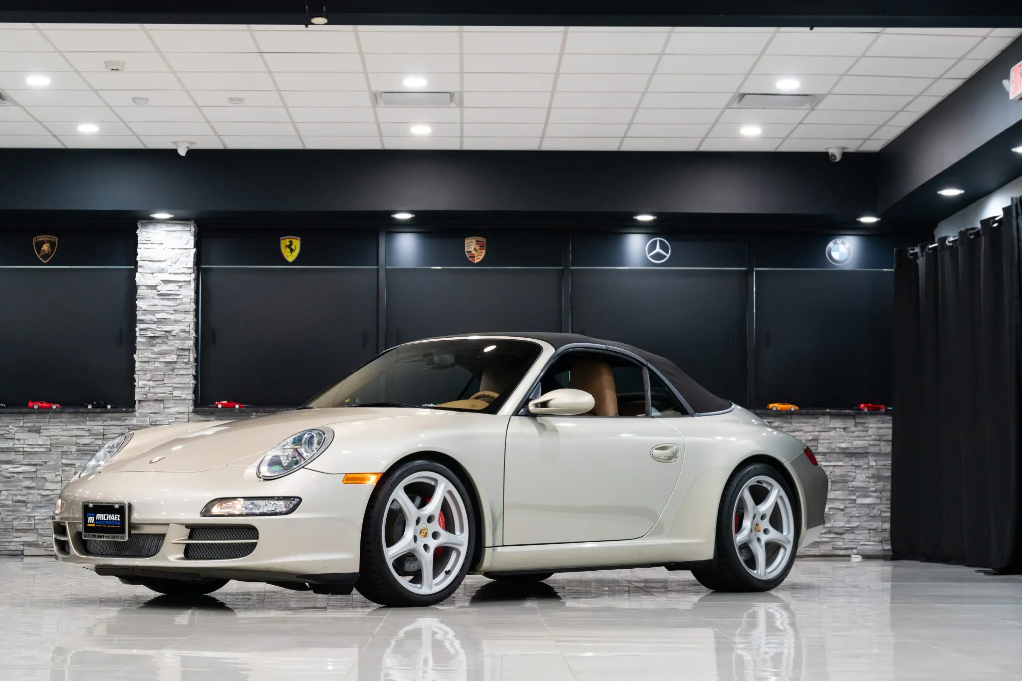 This 2005 Porsche 911 Carrera S cabriolet is finished in paint-to-sample Prosecco Metallic over Sand Beige Full Supple leather and has 59k miles following history in Virginia, Arkansas, Michigan, and Ontario, Canada.