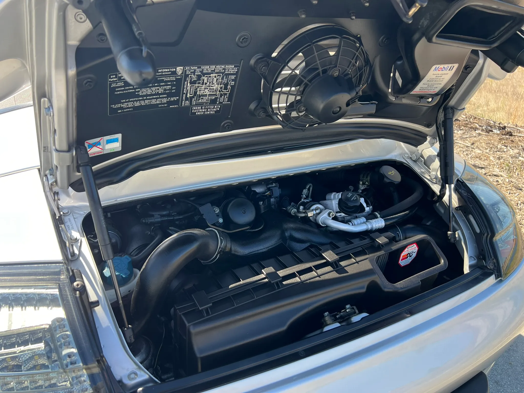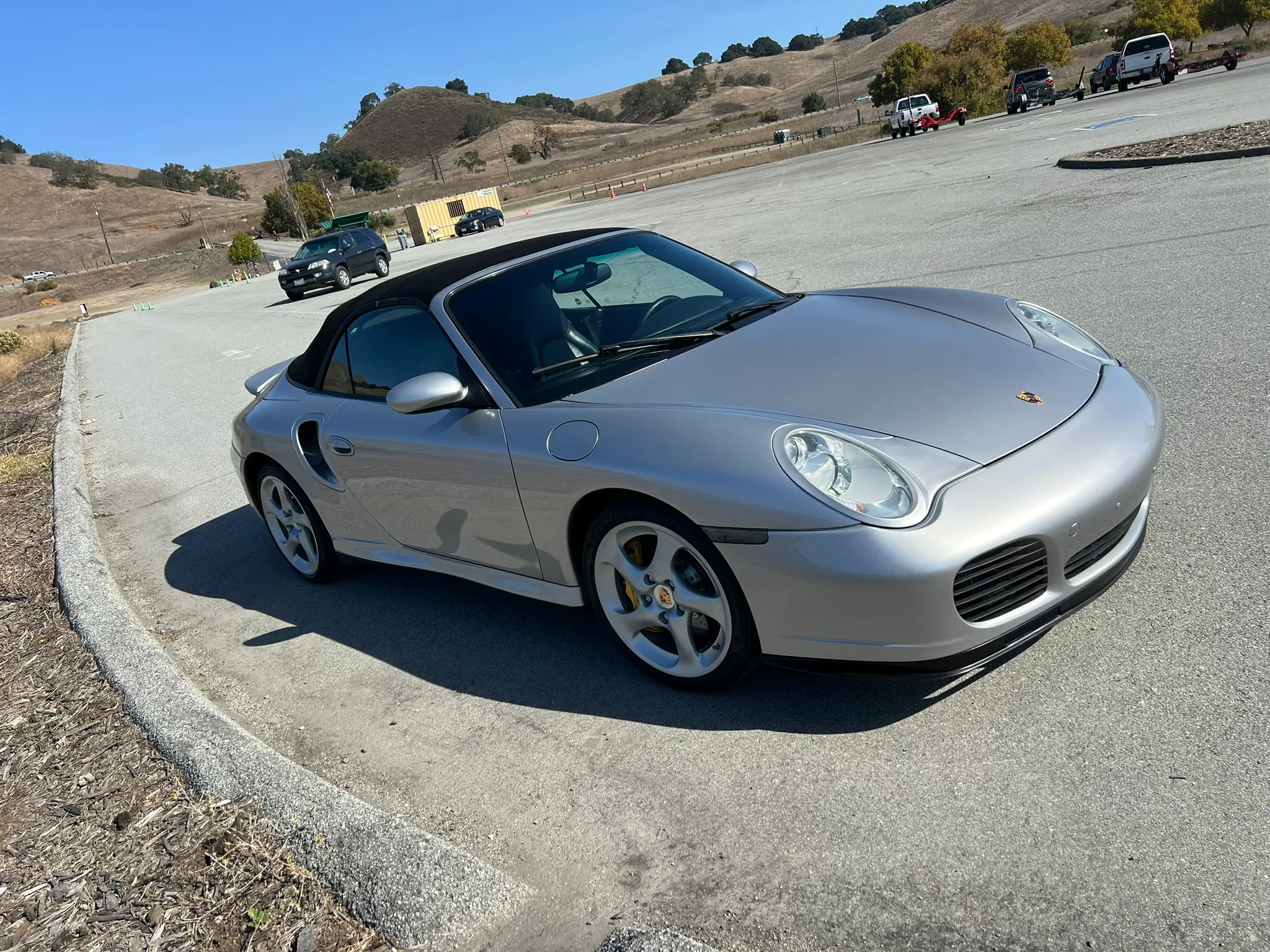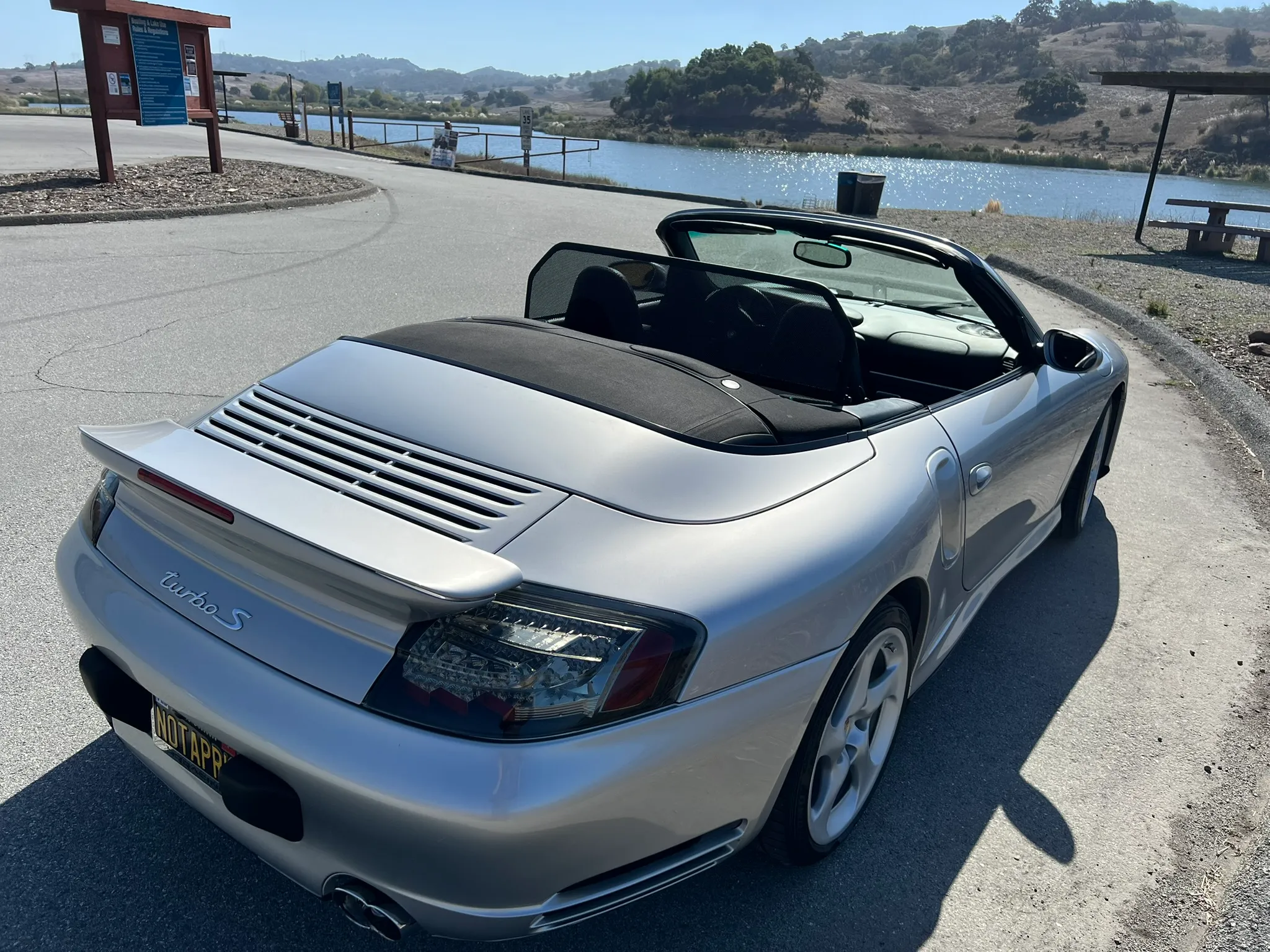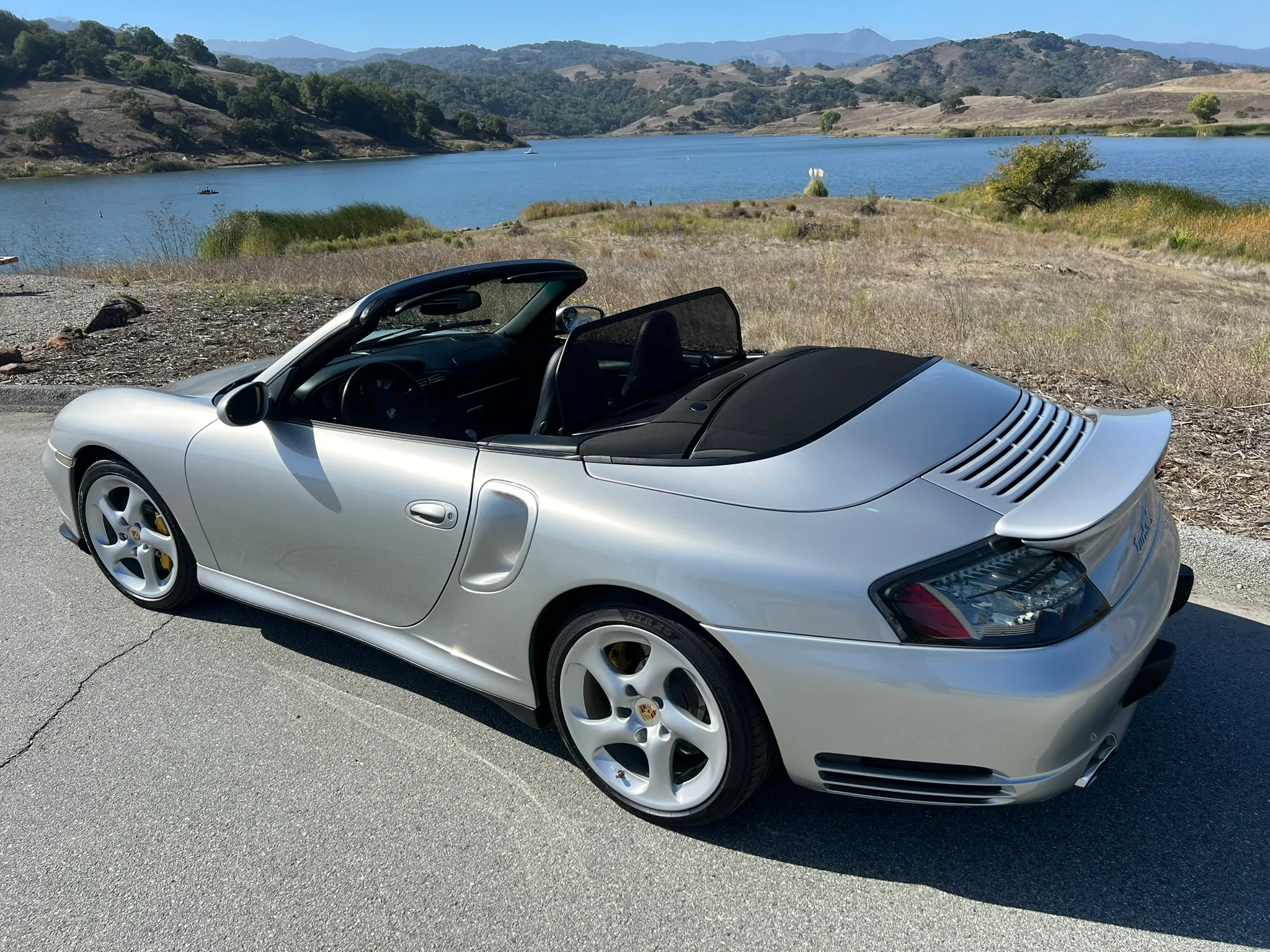 This 2005 Porsche 911 Turbo S cabriolet has remained registered in California since new, and it is finished in Arctic Silver Metallic over black full leather and powered by a twin-turbocharged 3.6L flat-six that drives all four wheels via a six-speed manual transaxle.