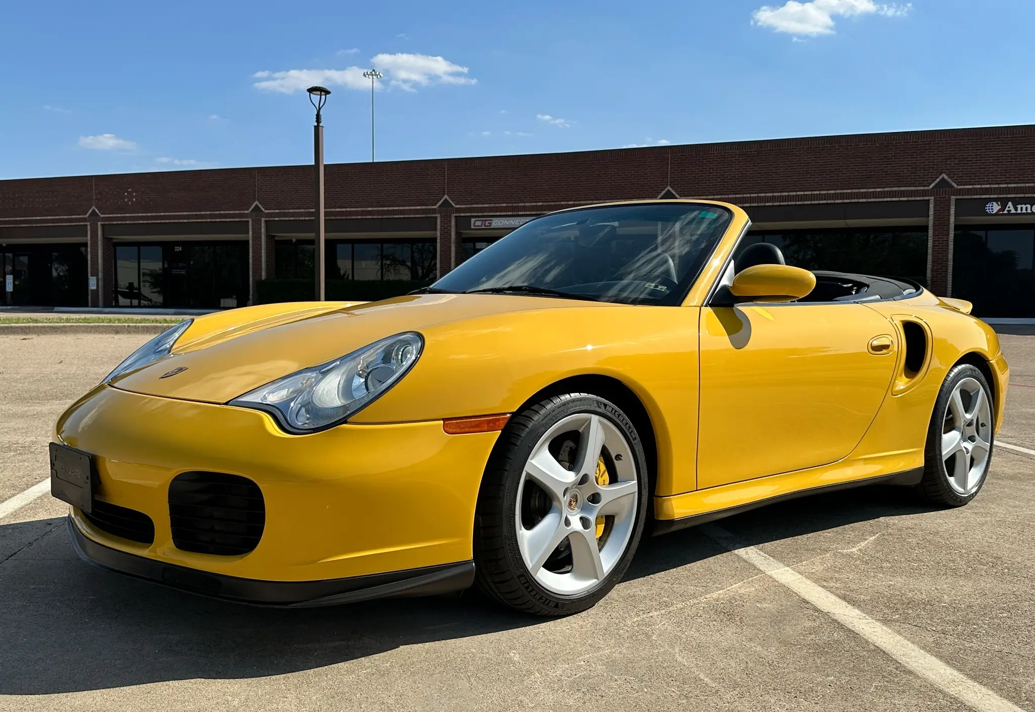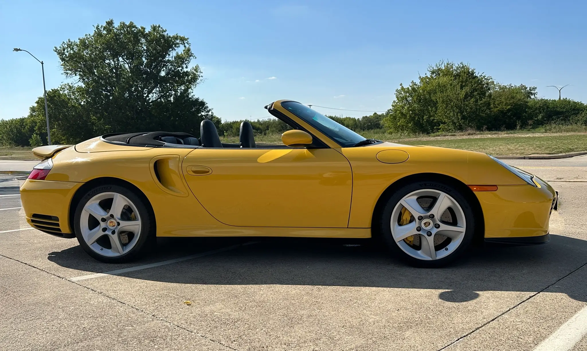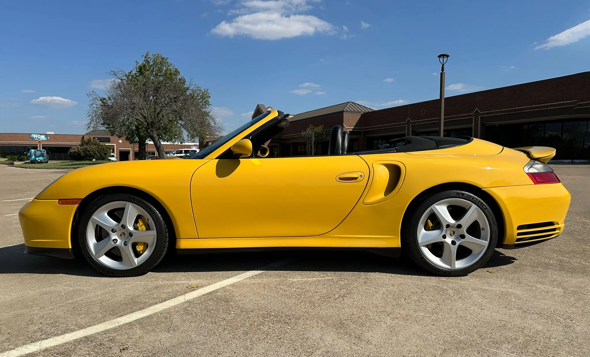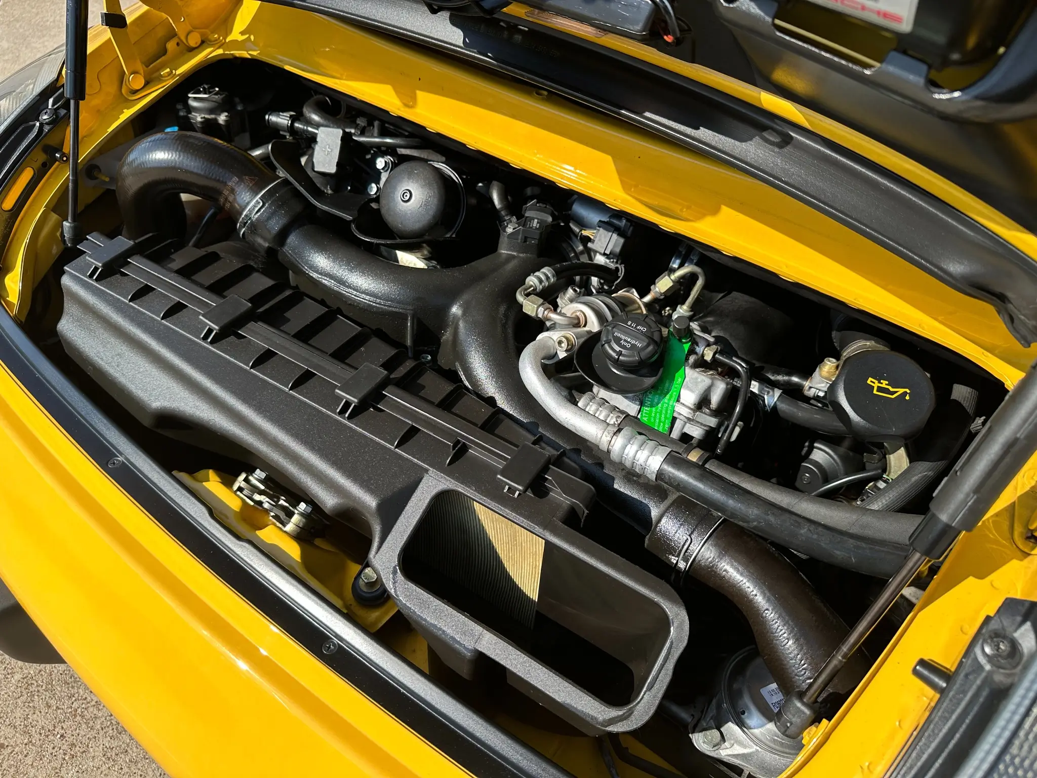 Finished in Speed Yellow over Black full leather upholstery, this example was also optioned with 18” Sport Techno wheels, stainless steel exhaust pipes, heated front seats, supple leather, a thicker steering wheel, a body-color rear center console, a Porsche-crested storage bin lid, and Custom Tailoring.