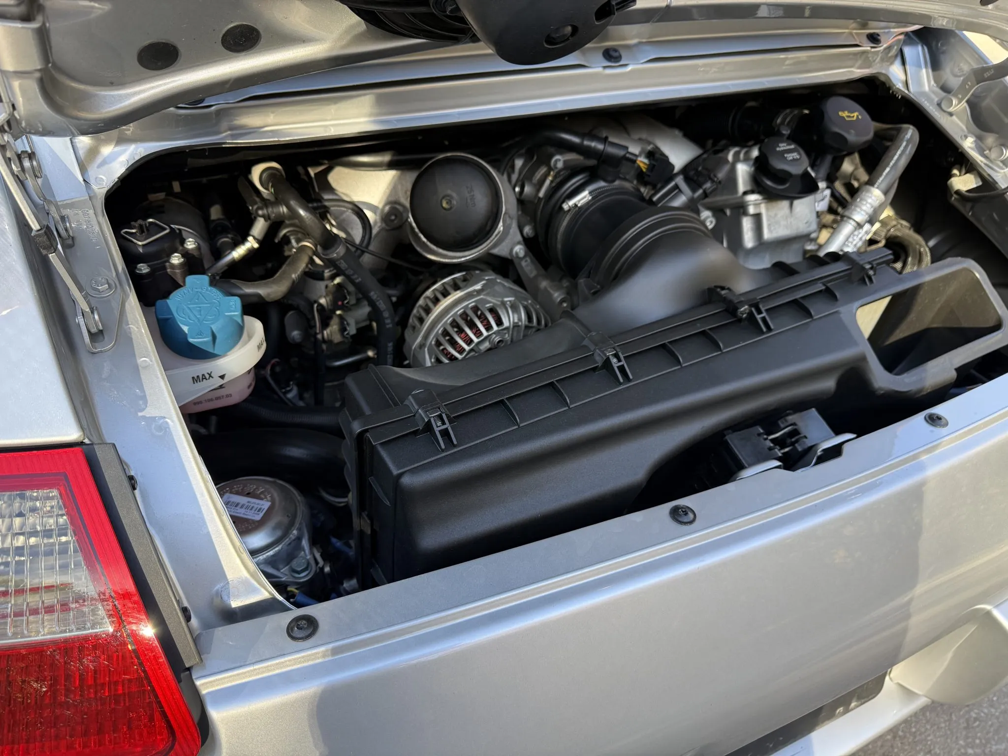 Equipment includes 19″ orange-finished alloy wheels, Porsche Ceramic Composite Brakes, a Fabspeed exhaust system, bi-xenon headlights, an adjustable rear wing, RS graphics, power-adjustable seats, a CD stereo, and automatic climate control.
