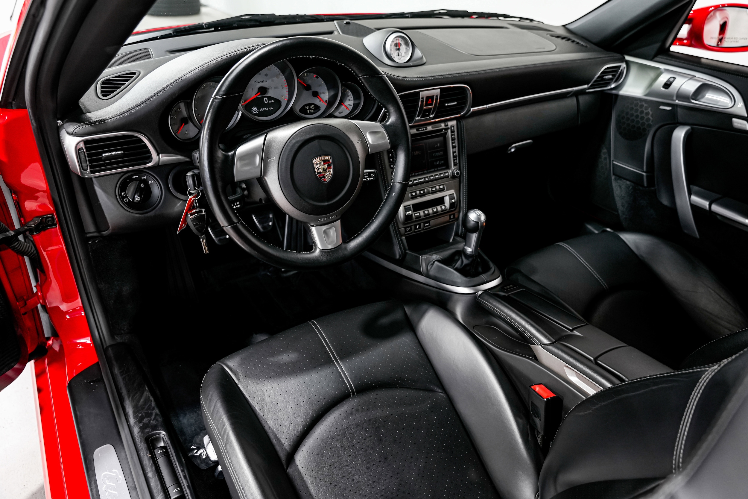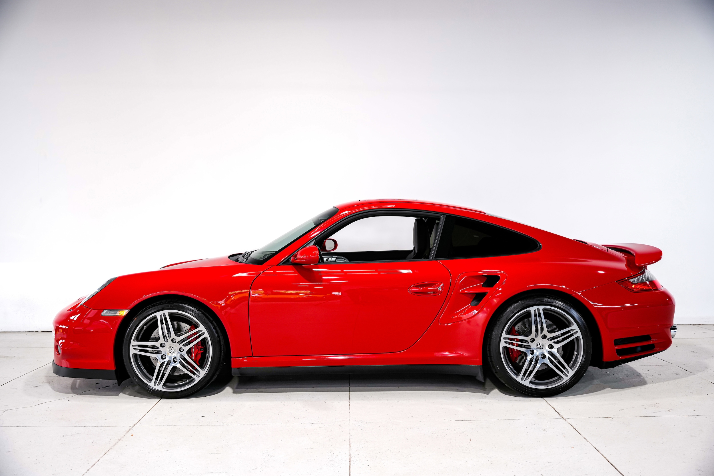Finished in Guards Red over black leather, this 2007 Porsche 911 Turbo Coupe is powered by the legendary twin-turbocharged 3.6-liter Mezger flat-six and paired with a six-speed manual transmission. Optioned with the Sport Chrono Package, Porsche Active Suspension Management (PASM), and Porsche Stability Management (PSM), this example also features adaptive sport seats, 19” Turbo wheels, and a Bose sound system.