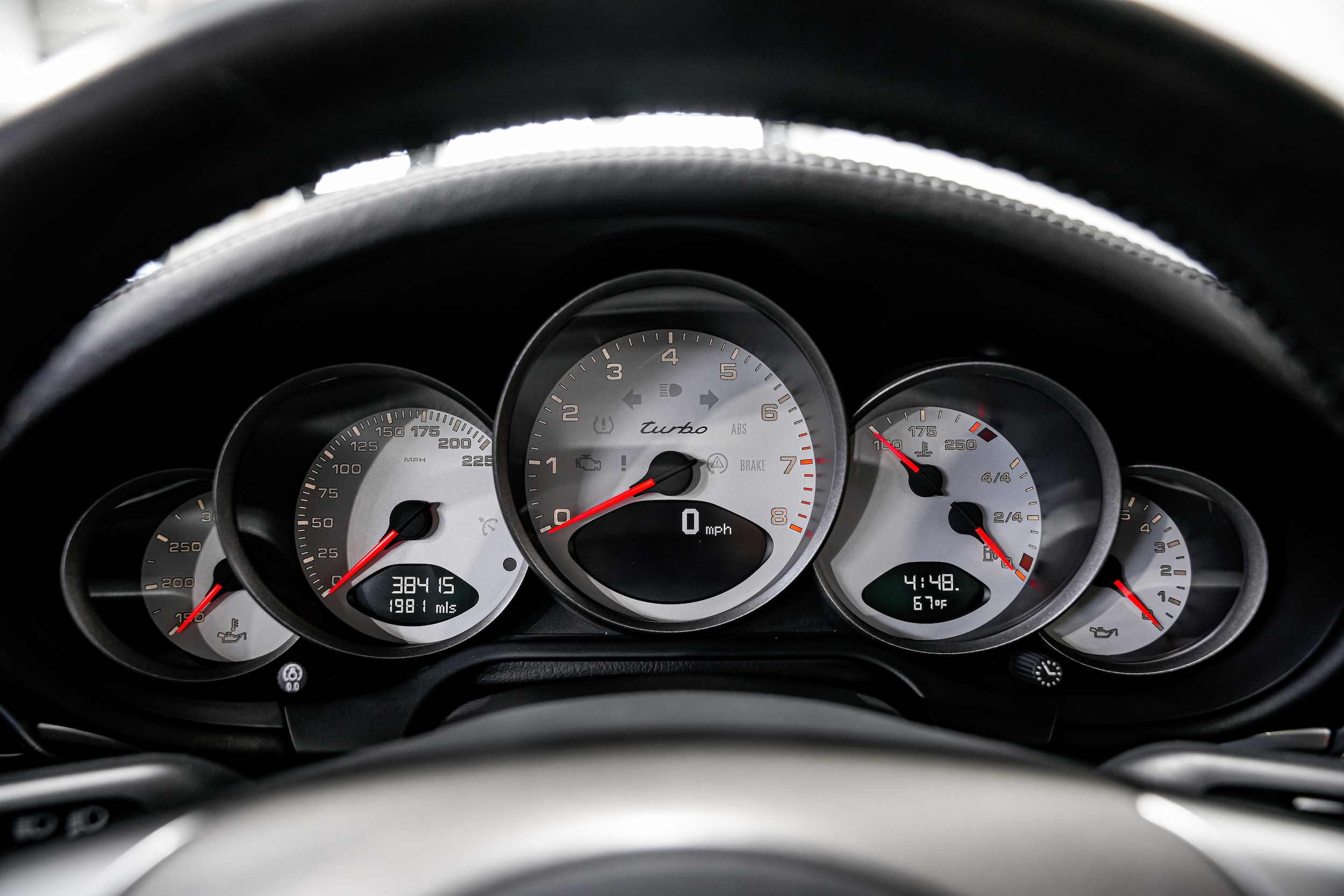 Inside, the cabin is appointed with adaptive front sport seats upholstered in black leather, which also covers the dashboard and door panels. Features include driver-seat memory, Porsche Communication Management (PCM) with navigation, a Bose premium sound system, automatic climate control, and cruise control. The leather-wrapped steering wheel frames a central tachometer and a 225-mph speedometer, along with auxiliary gauges for oil temperature, oil pressure, coolant temperature, and fuel level. The optional Sport Chrono Package adds a stopwatch to the dash and enables temporary overboost functionality.