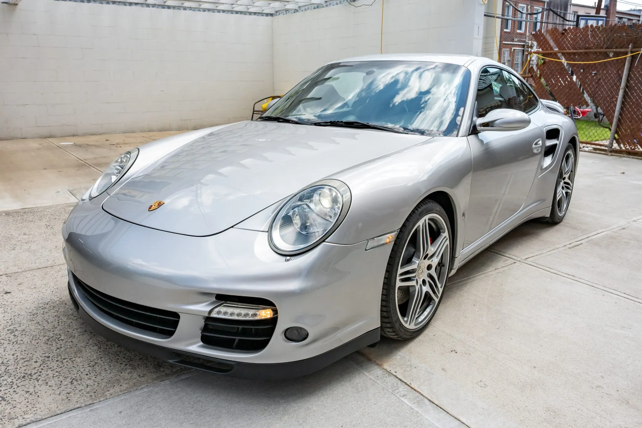 This 2007 Porsche 911 Turbo coupe has 38k miles following history on the East Coast since new. It is finished in Arctic Silver Metallic over Black Full leather and is powered by a twin-turbocharged 3.6L flat-six that drives all four wheels via a six-speed manual transaxle and a locking rear differential.