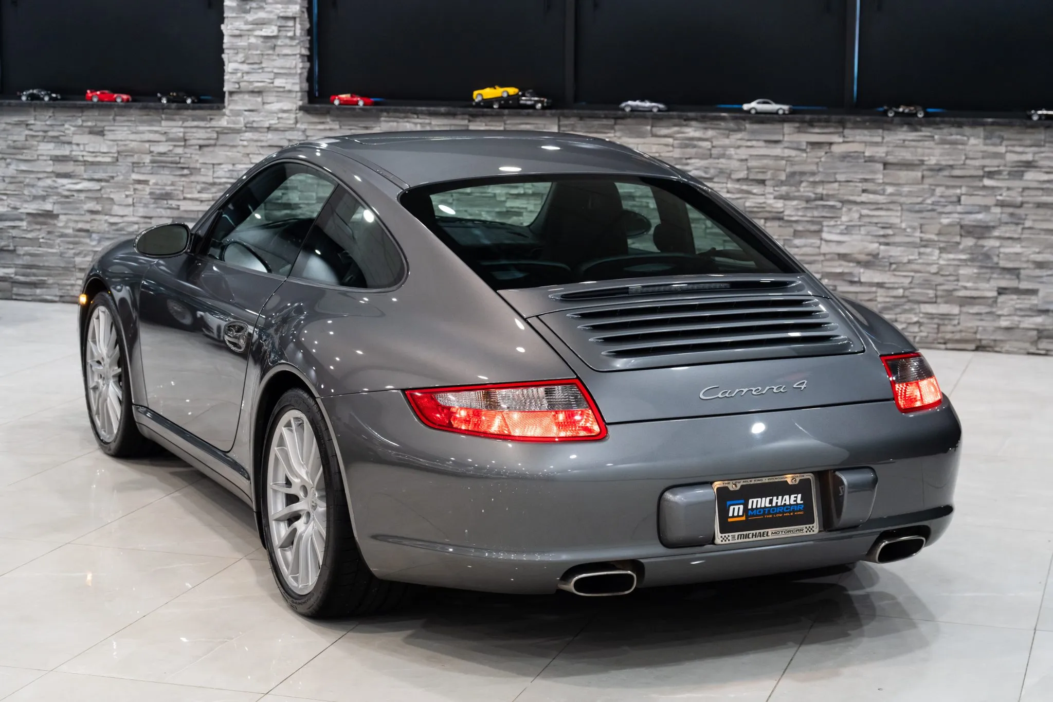This 2008 Porsche 911 Carrera 4 coupe has 16k miles following registration history in Washington, Illinois, Ohio, and New Jersey. It is finished in Meteor Gray Metallic over black leather and is powered by a 3.6-liter flat-six that drives all four wheels through a six-speed manual transaxle.