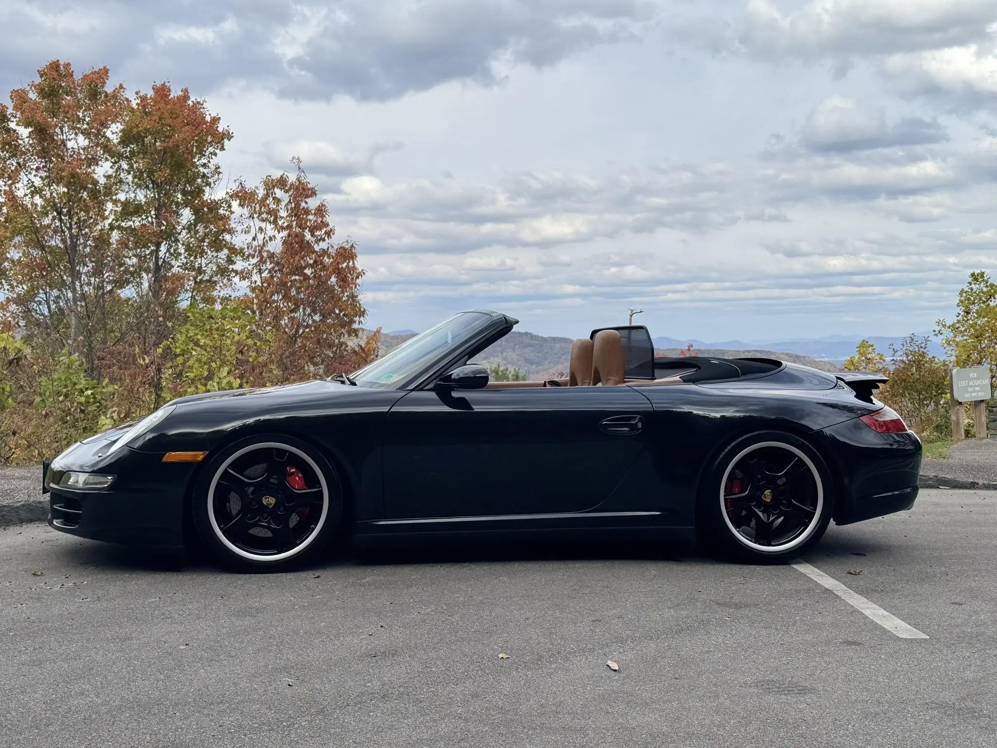 This 2008 Porsche 911 Carrera 4S cabriolet is finished in Basalt Black Metallic over Natural Brown Supple leather and is powered by a 3.8-liter flat-six that drives all four wheels through a six-speed manual transaxle.