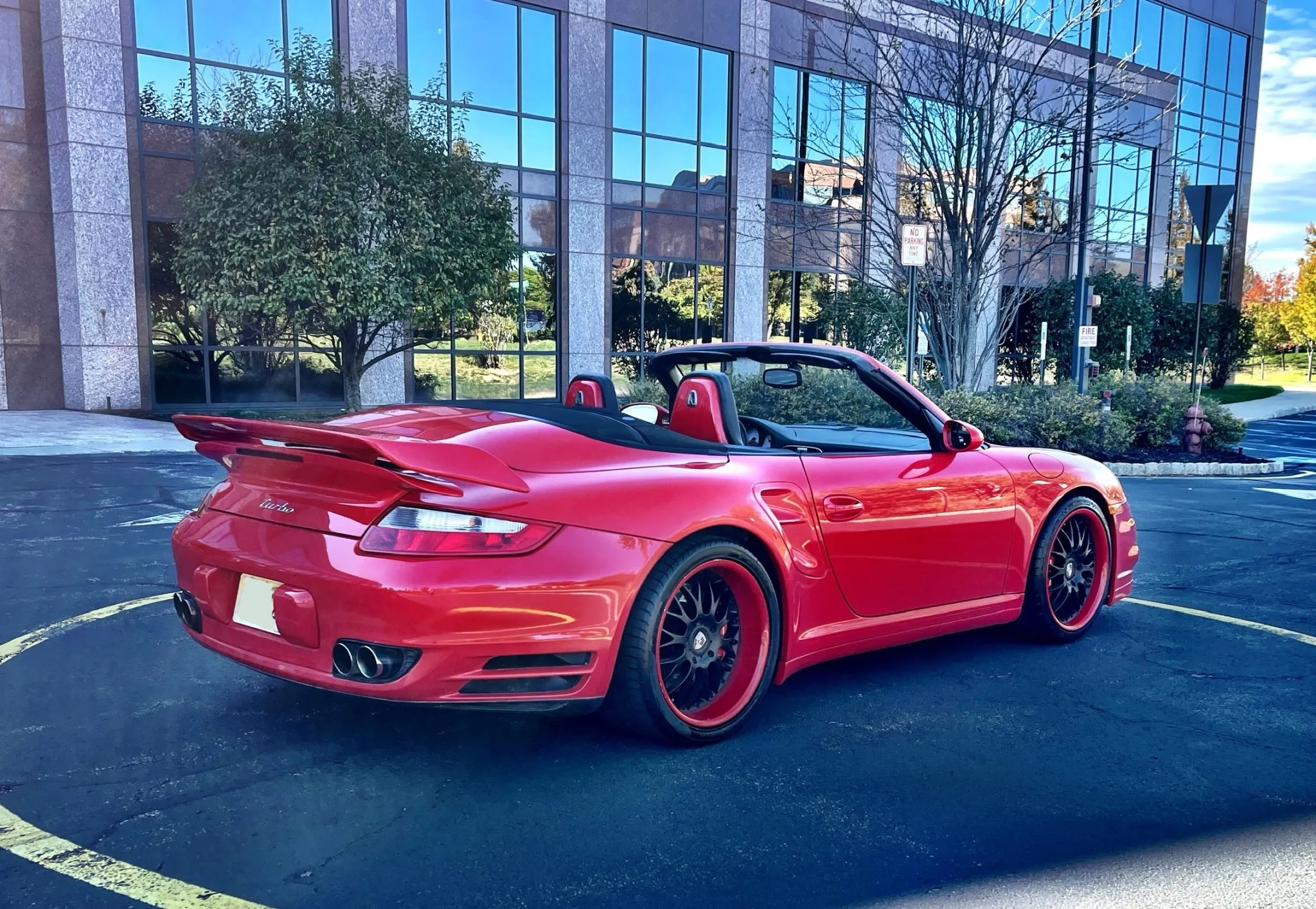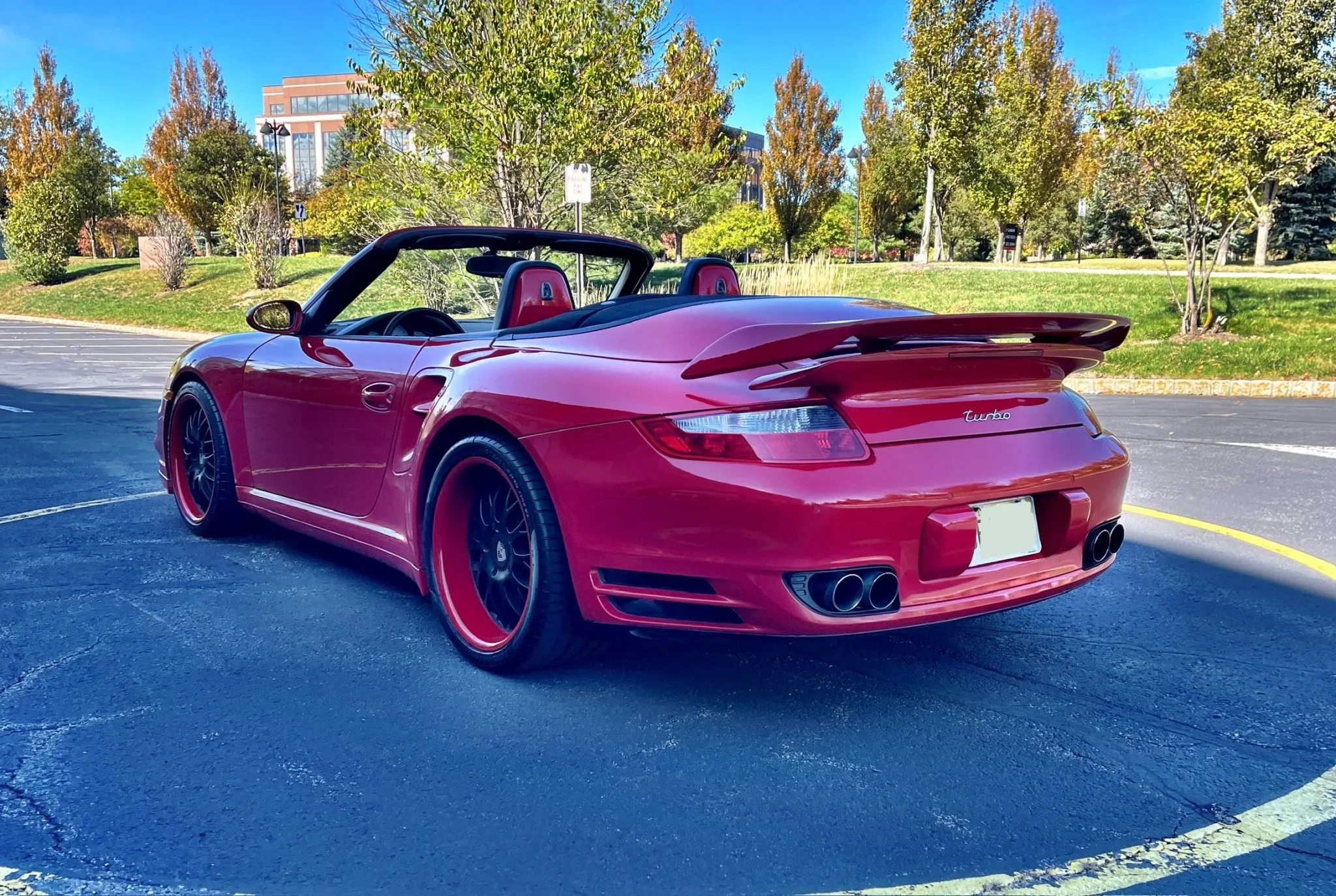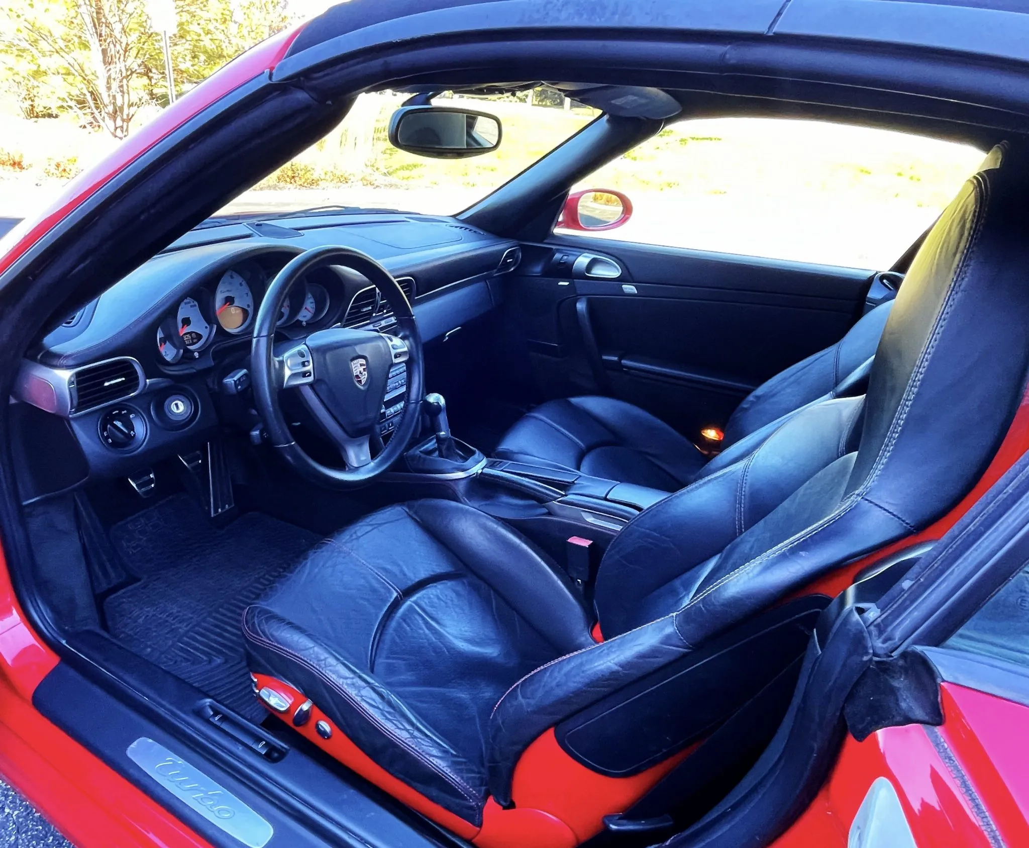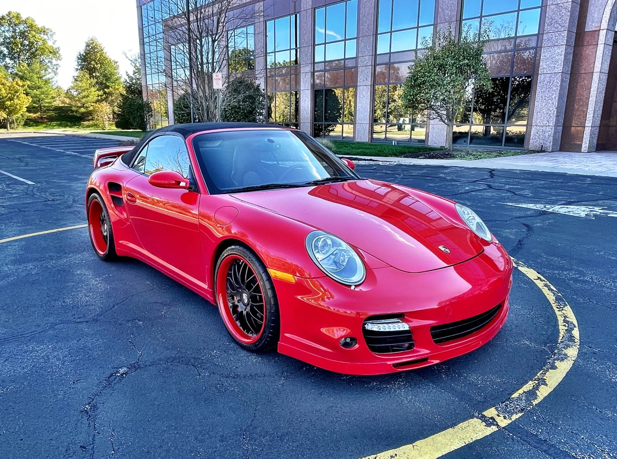 This 2008 Porsche 911 Turbo cabriolet has 31k miles following registration history in California and North Carolina. It is finished in Guards Red over black leather and is powered by a twin-turbocharged 3.6L flat-six that drives all four wheels via a six-speed manual transaxle.