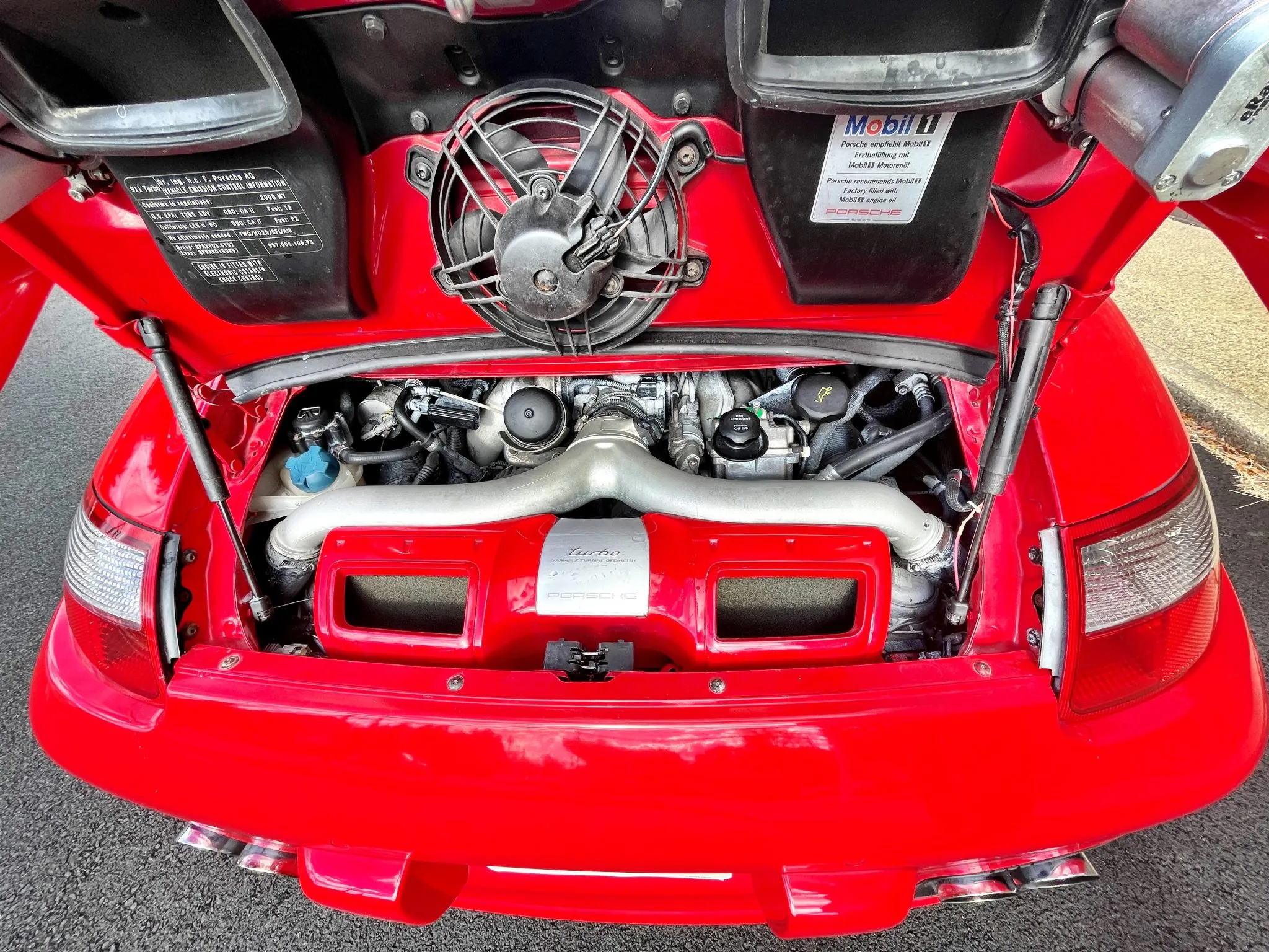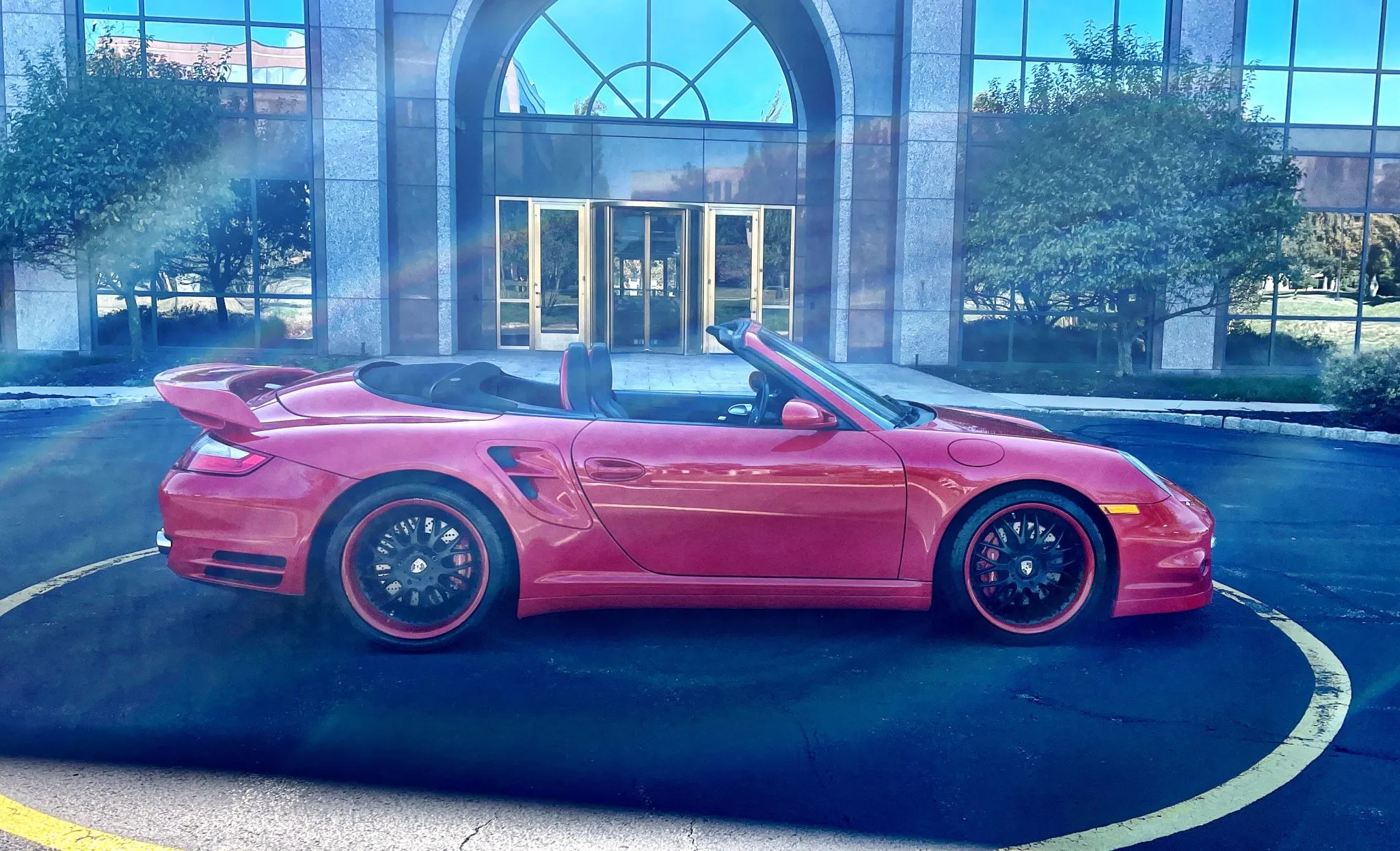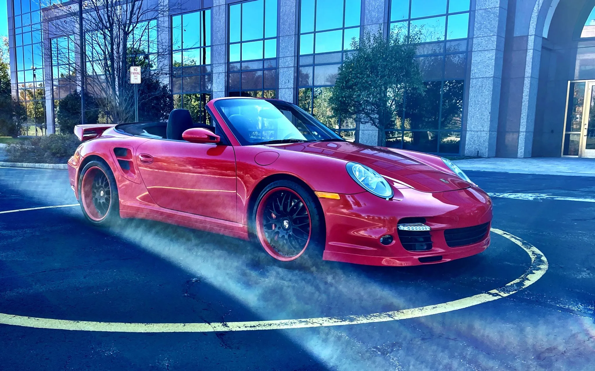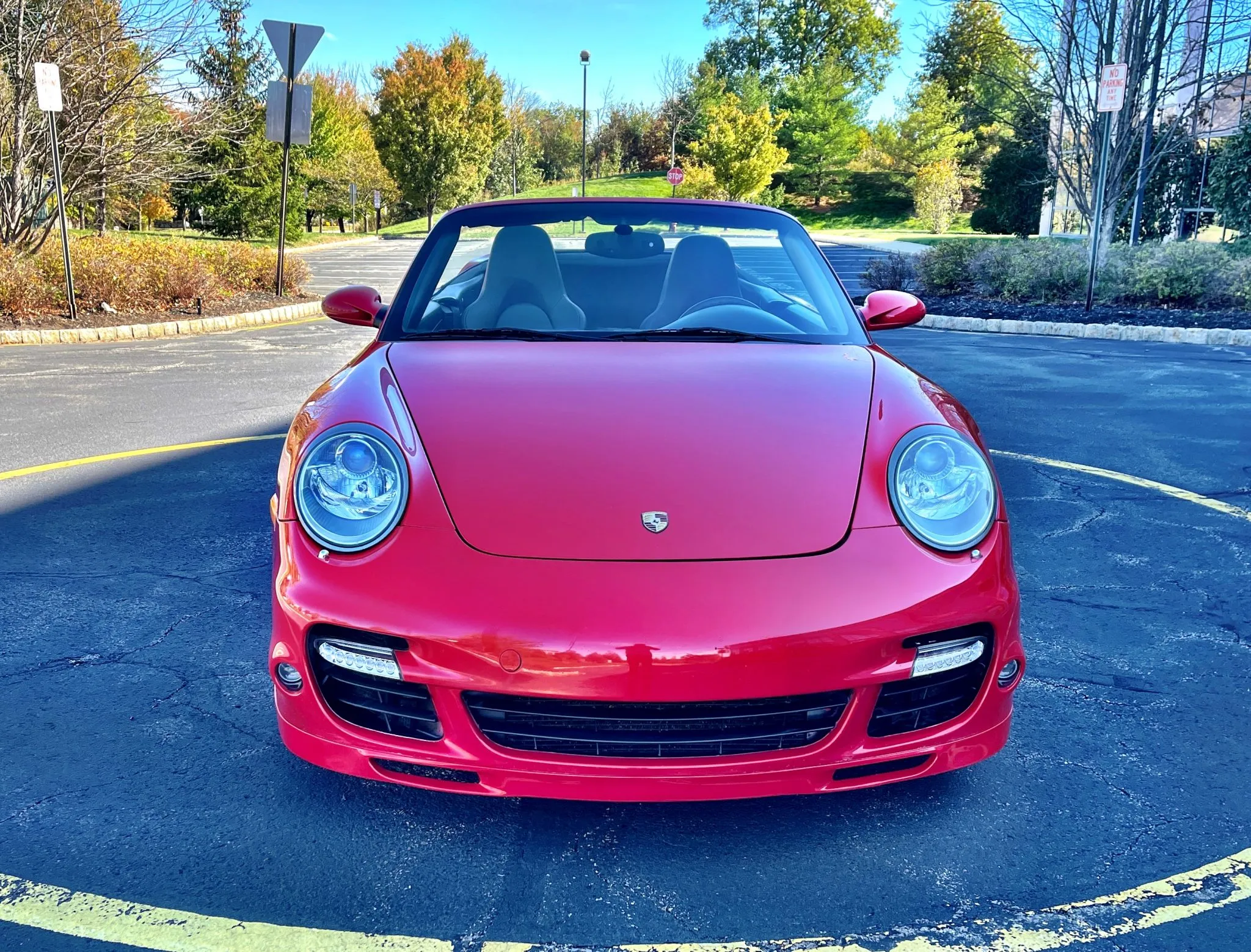 This 2008 Porsche 911 Turbo cabriolet has 31k miles following registration history in California and North Carolina. It is finished in Guards Red over black leather and is powered by a twin-turbocharged 3.6L flat-six that drives all four wheels via a six-speed manual transaxle.