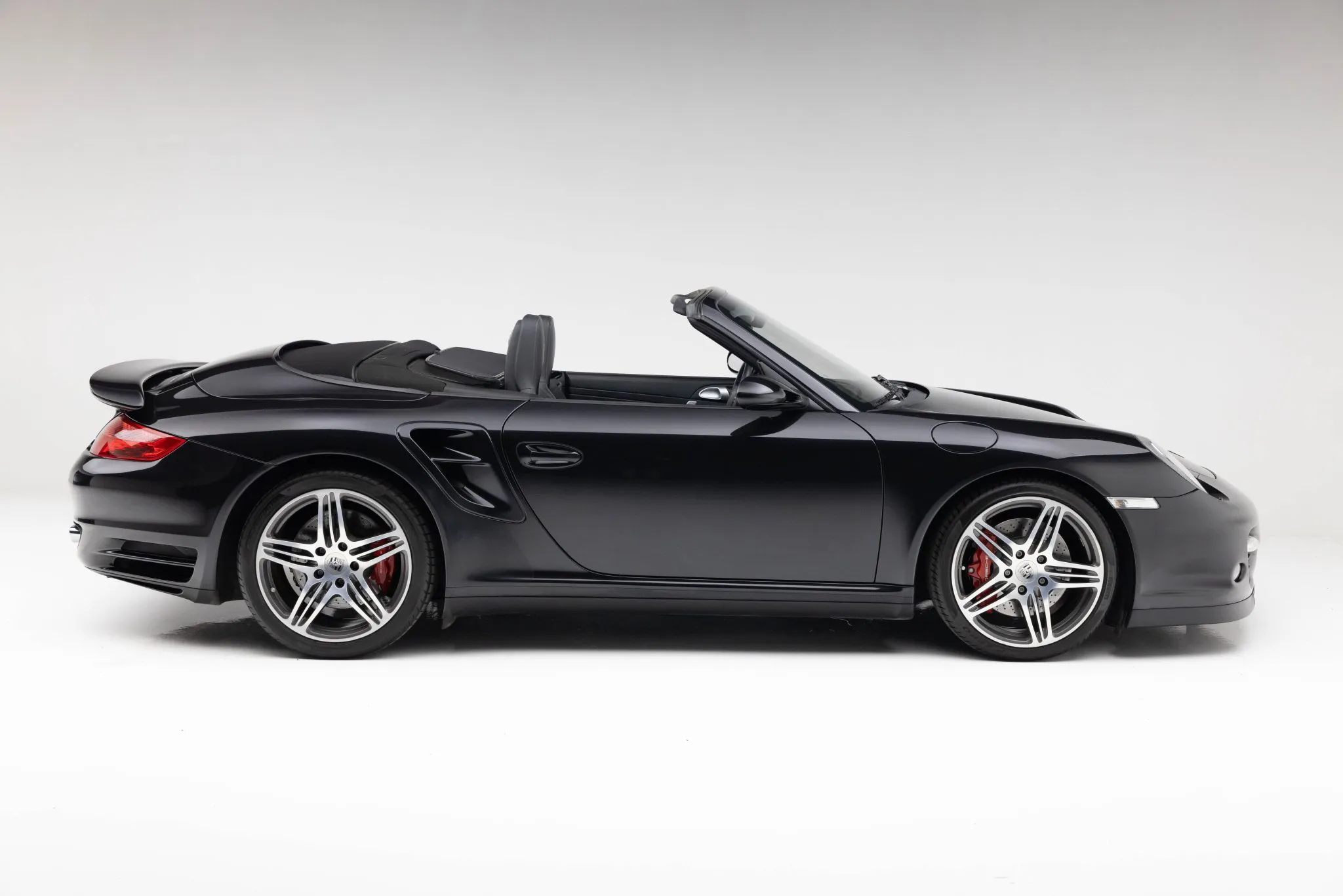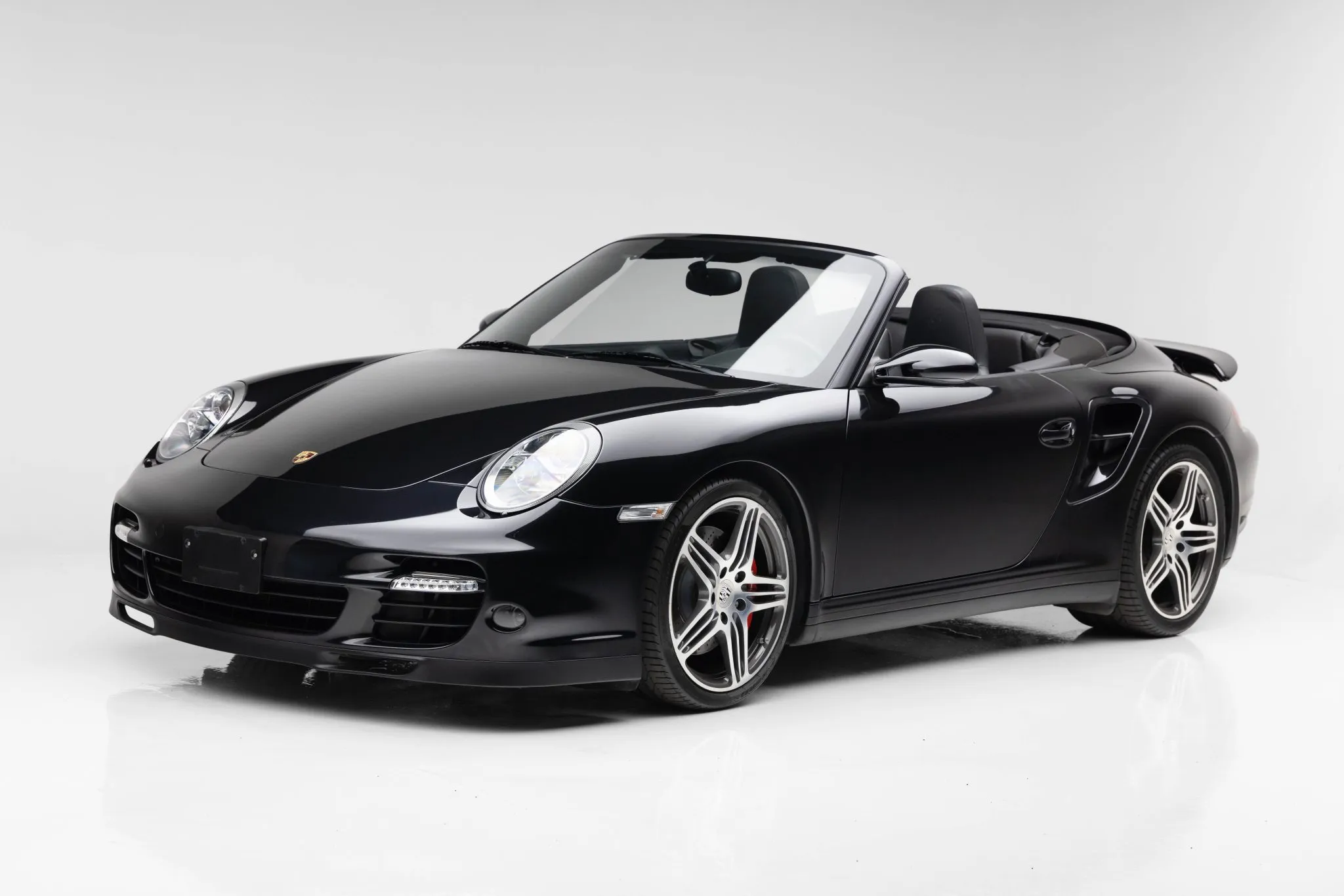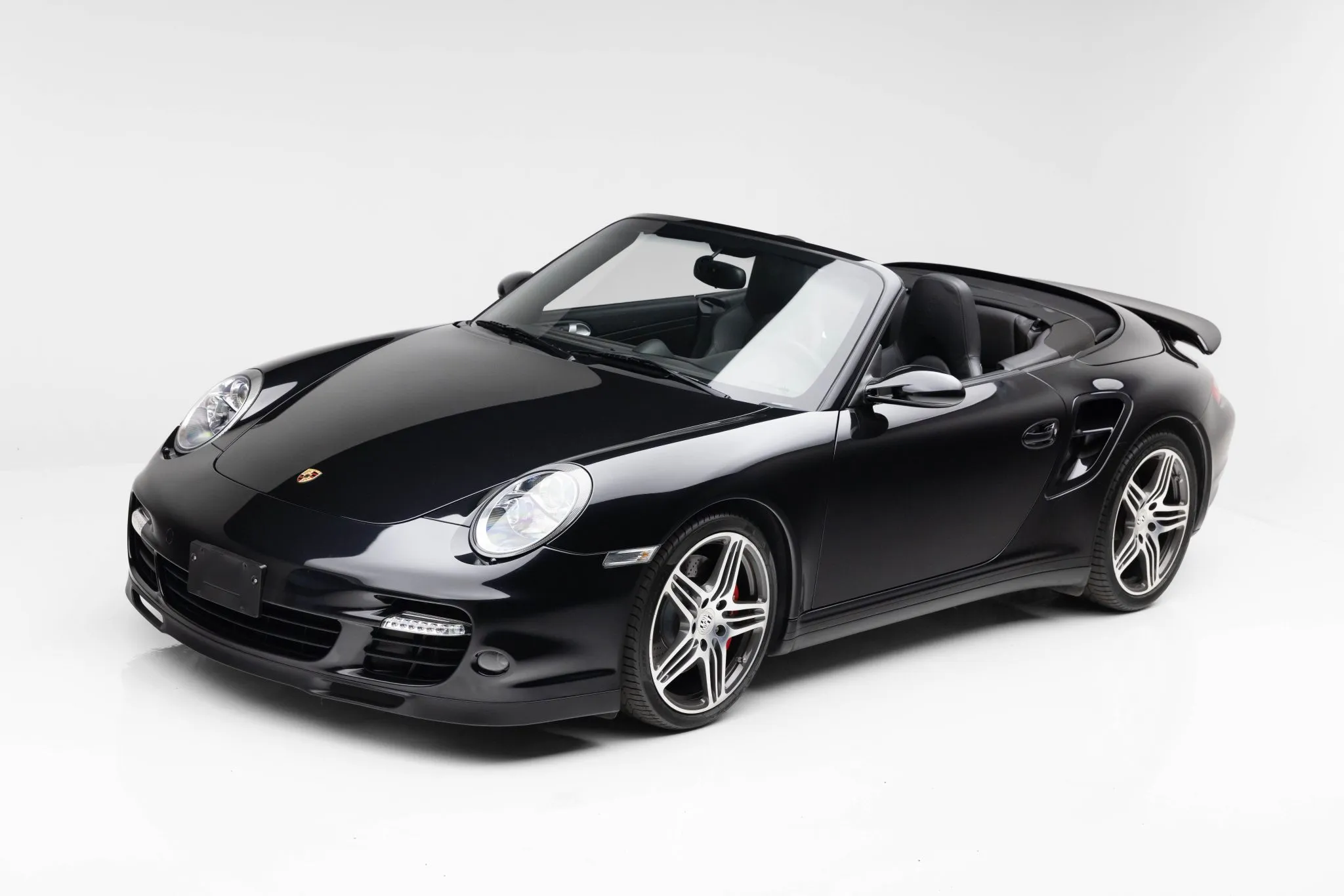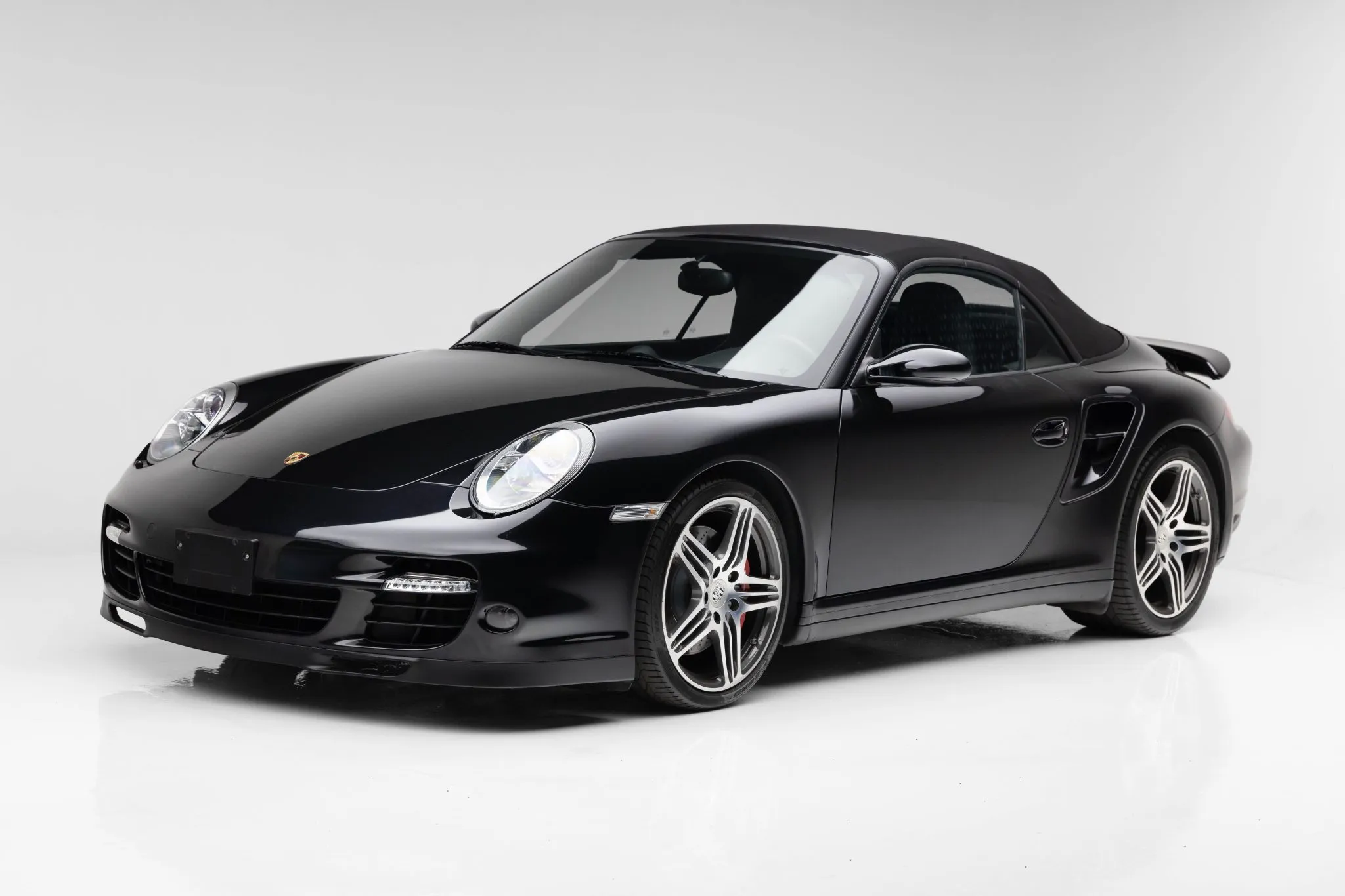 This 2008 Porsche 911 Turbo cabriolet has 26k miles following registration history in California and Rhode Island. It is finished in Basalt Black Metallic over black leather and is powered by a twin-turbocharged 3.6L flat-six that drives all four wheels via a six-speed manual transaxle.