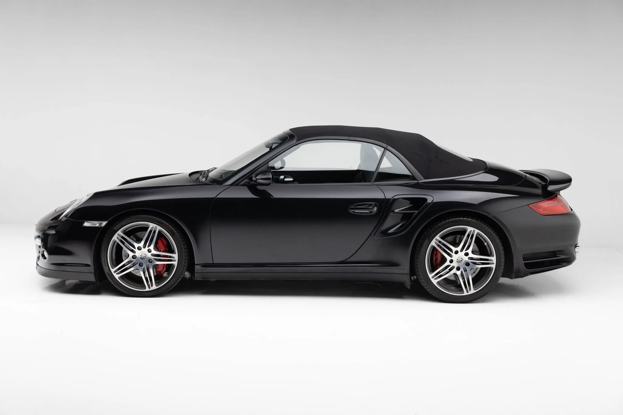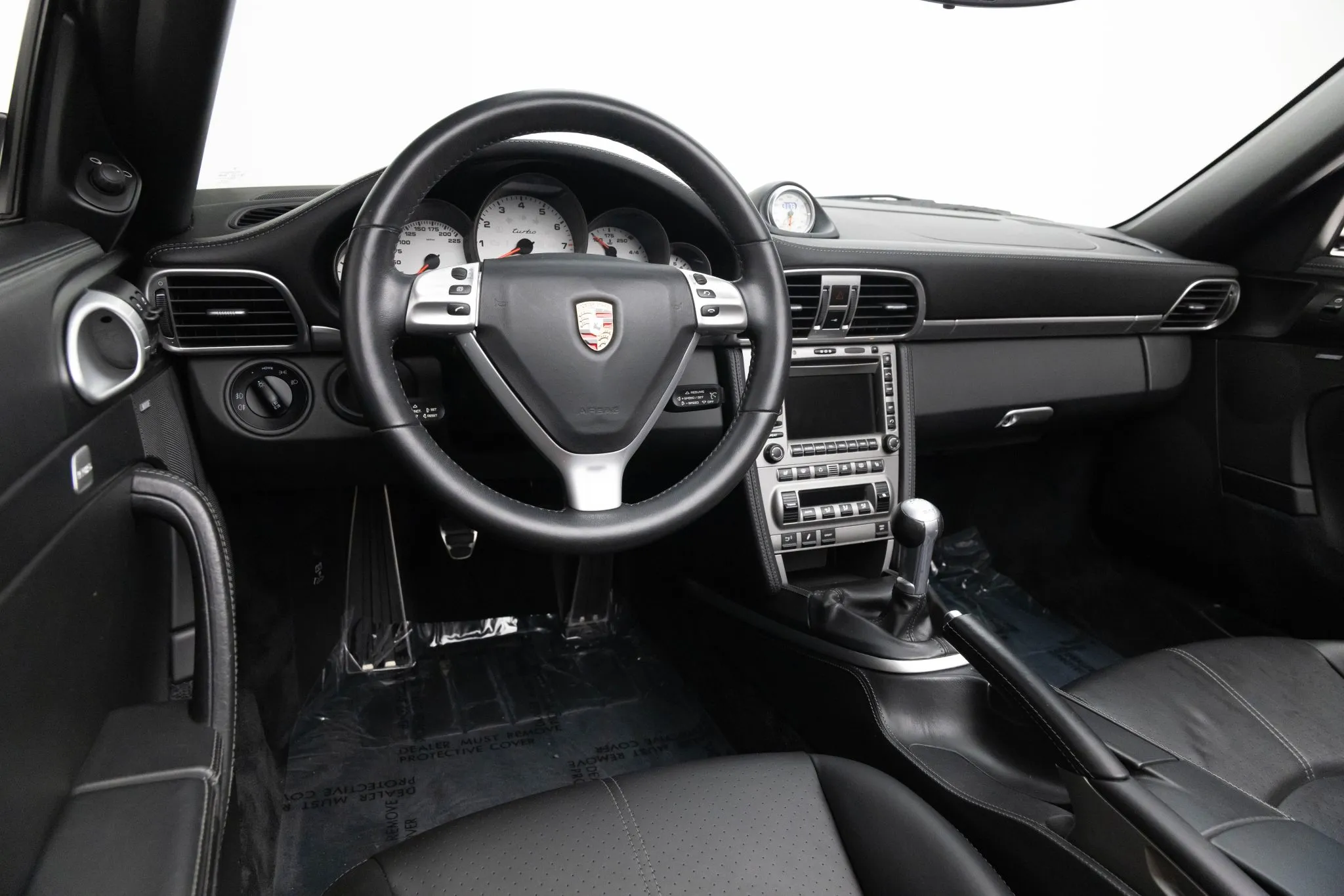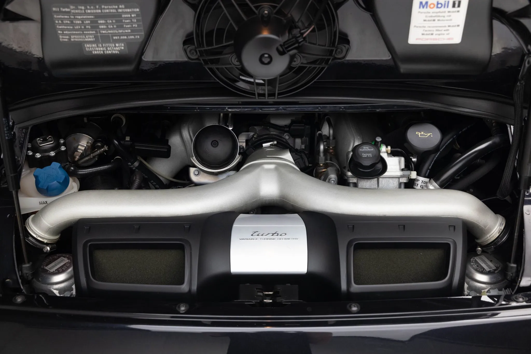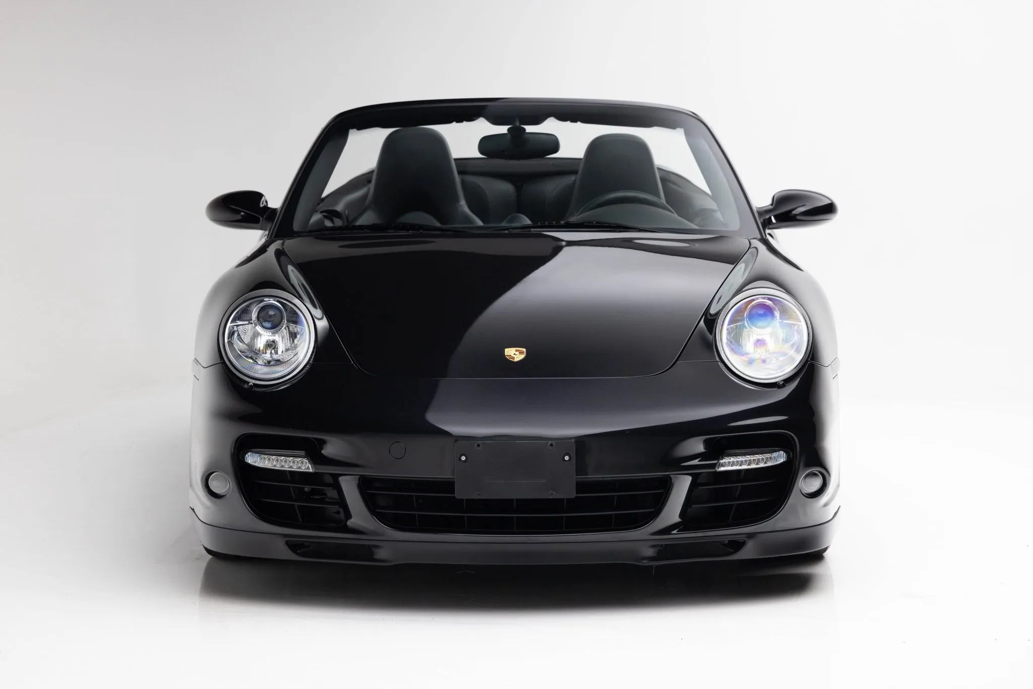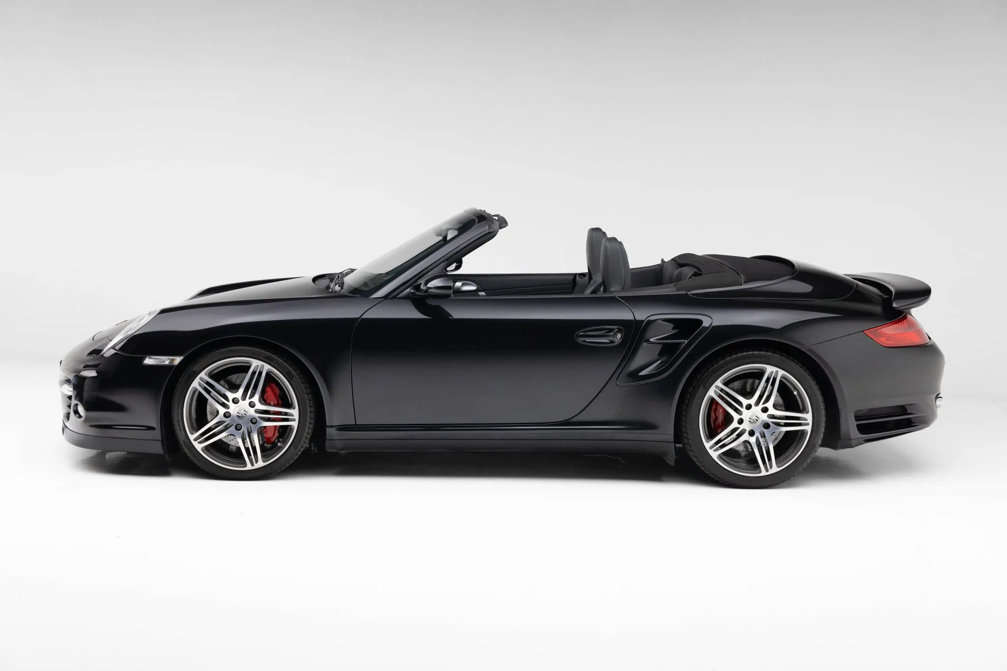 This 2008 Porsche 911 Turbo cabriolet has 26k miles following registration history in California and Rhode Island. It is finished in Basalt Black Metallic over black leather and is powered by a twin-turbocharged 3.6L flat-six that drives all four wheels via a six-speed manual transaxle.