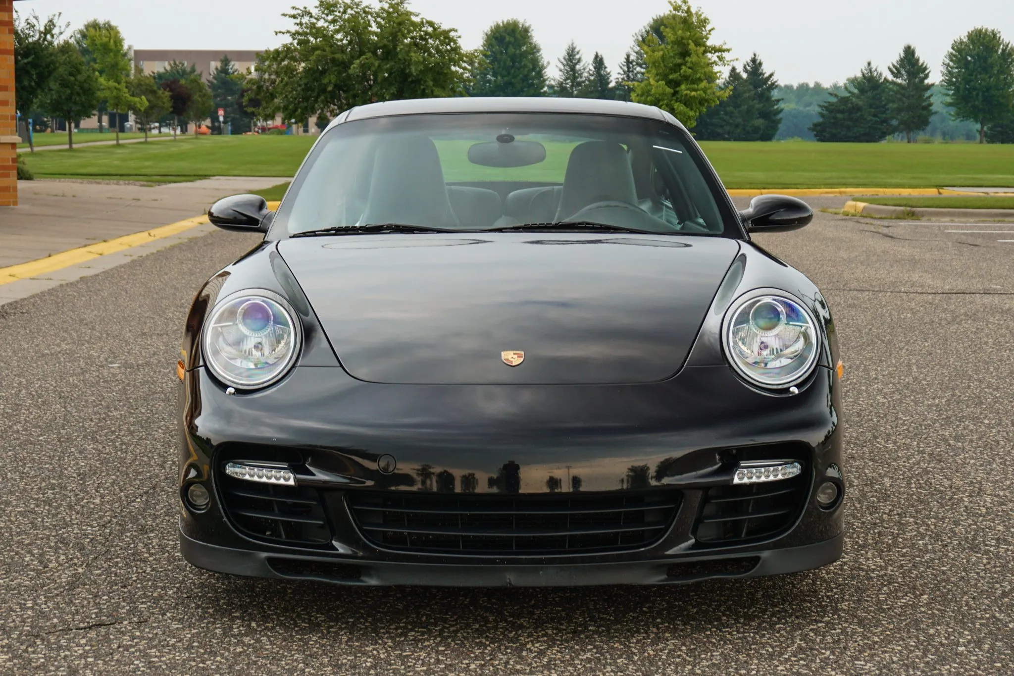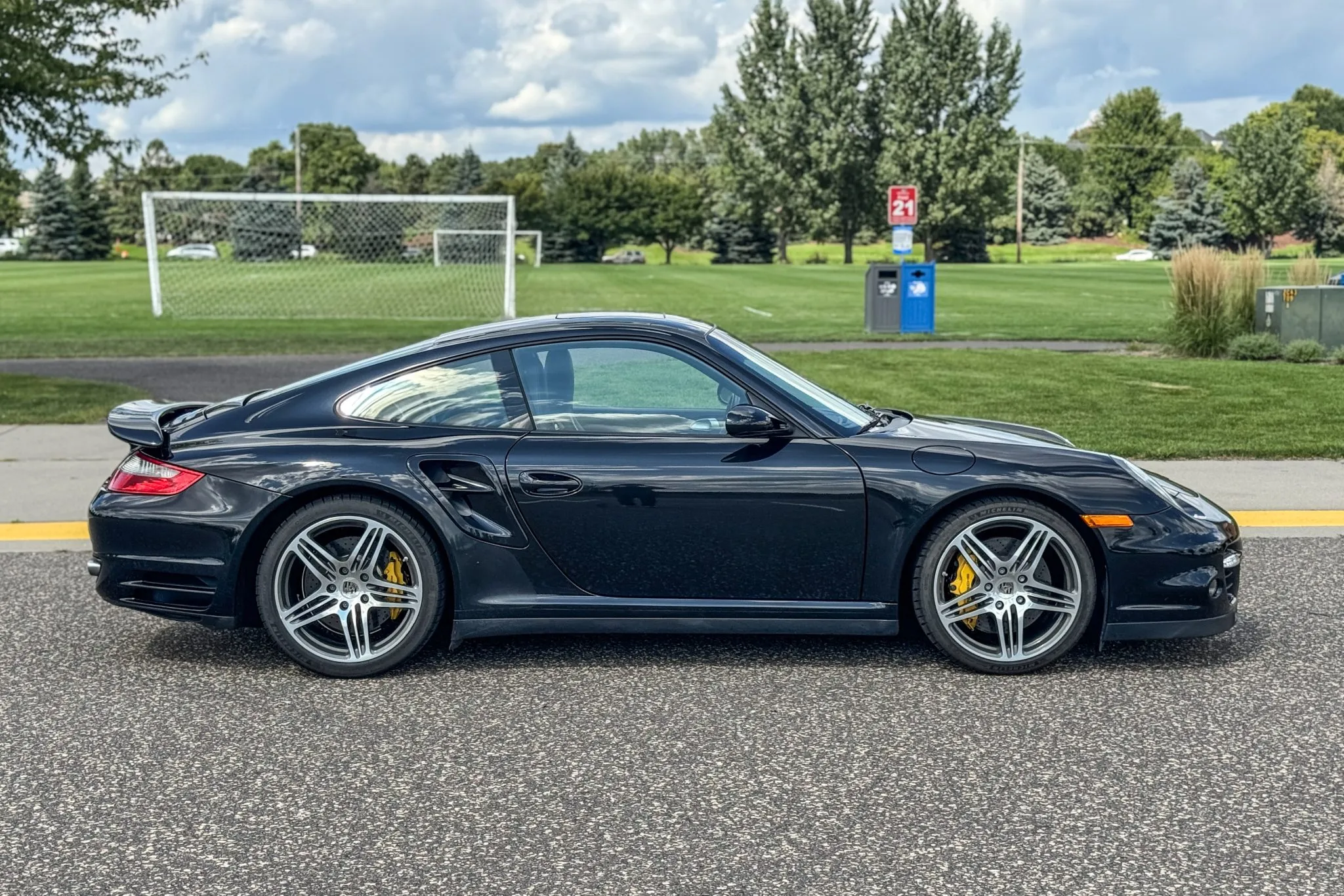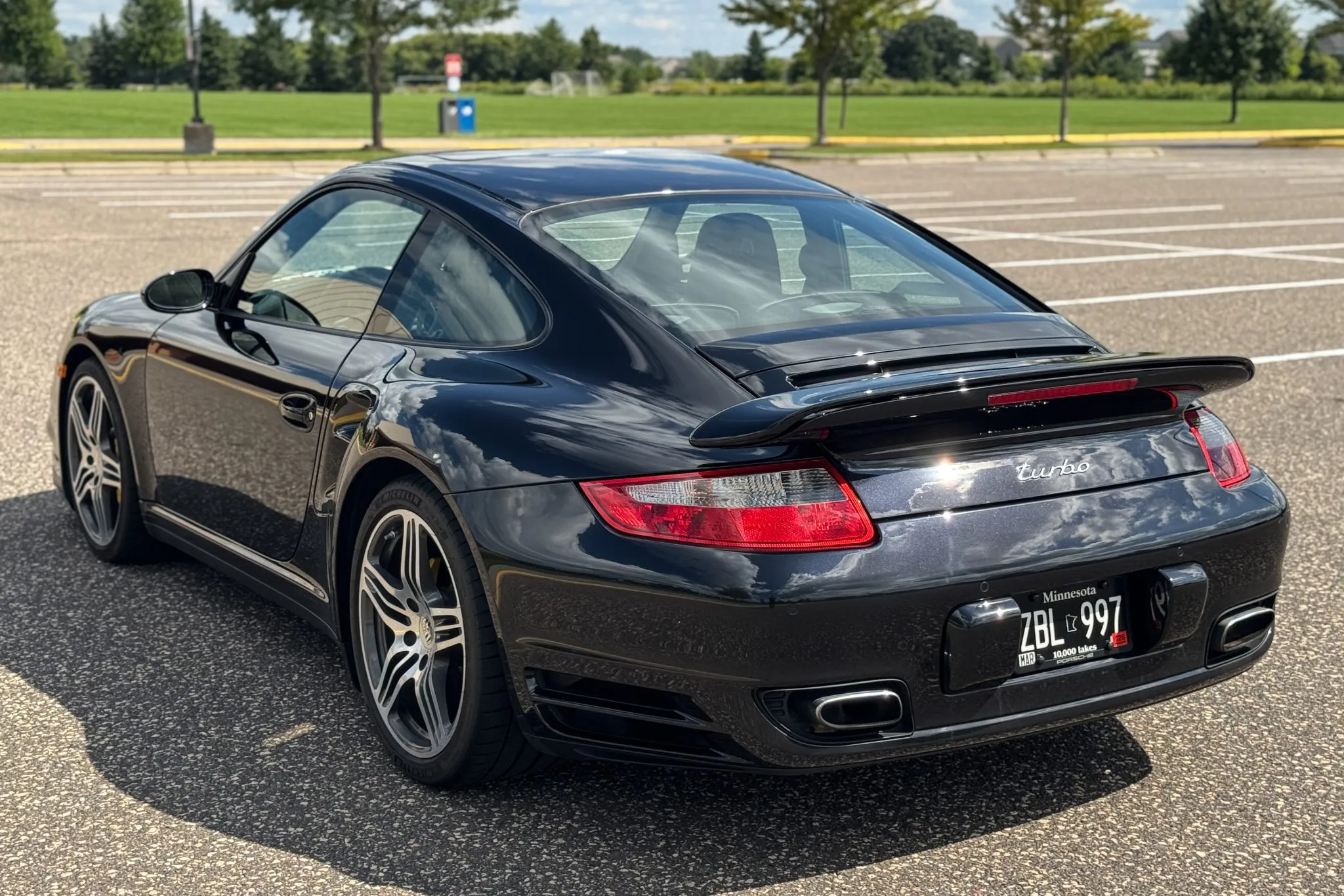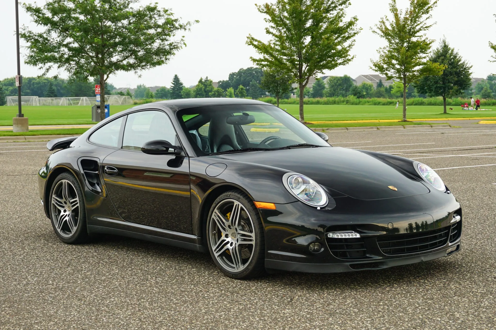 This 2008 Porsche 911 Turbo is a black-over-black coupe that has 76k miles and is powered by a twin-turbocharged 3.6L flat-six that drives all four wheels via a six-speed manual transaxle.