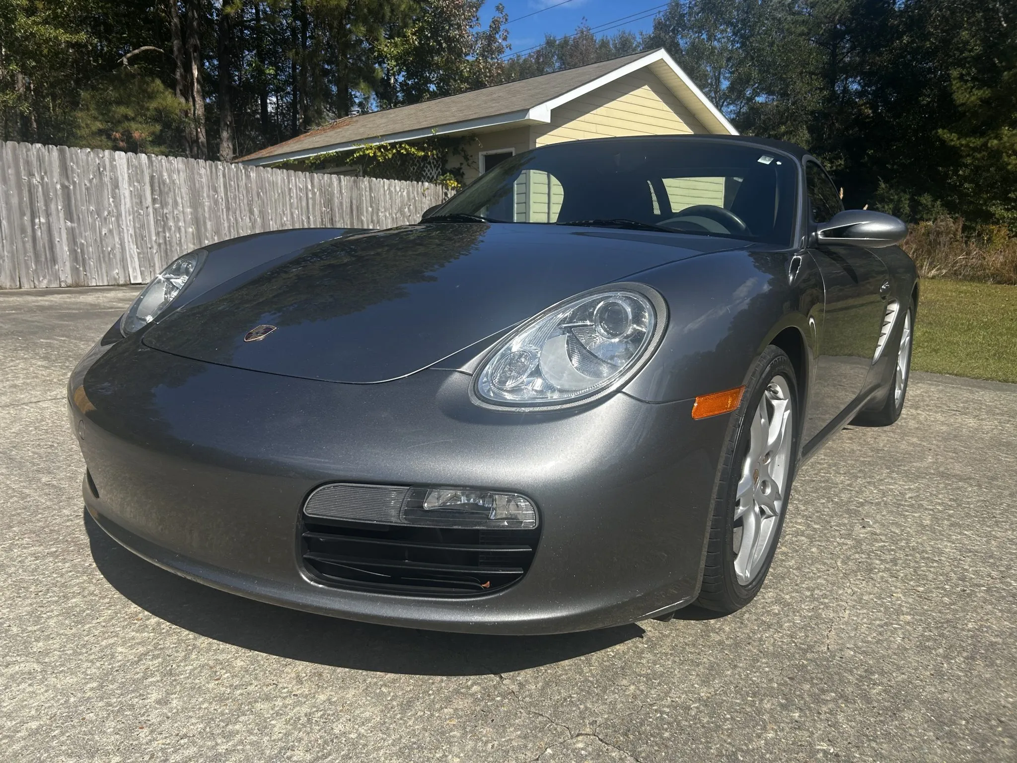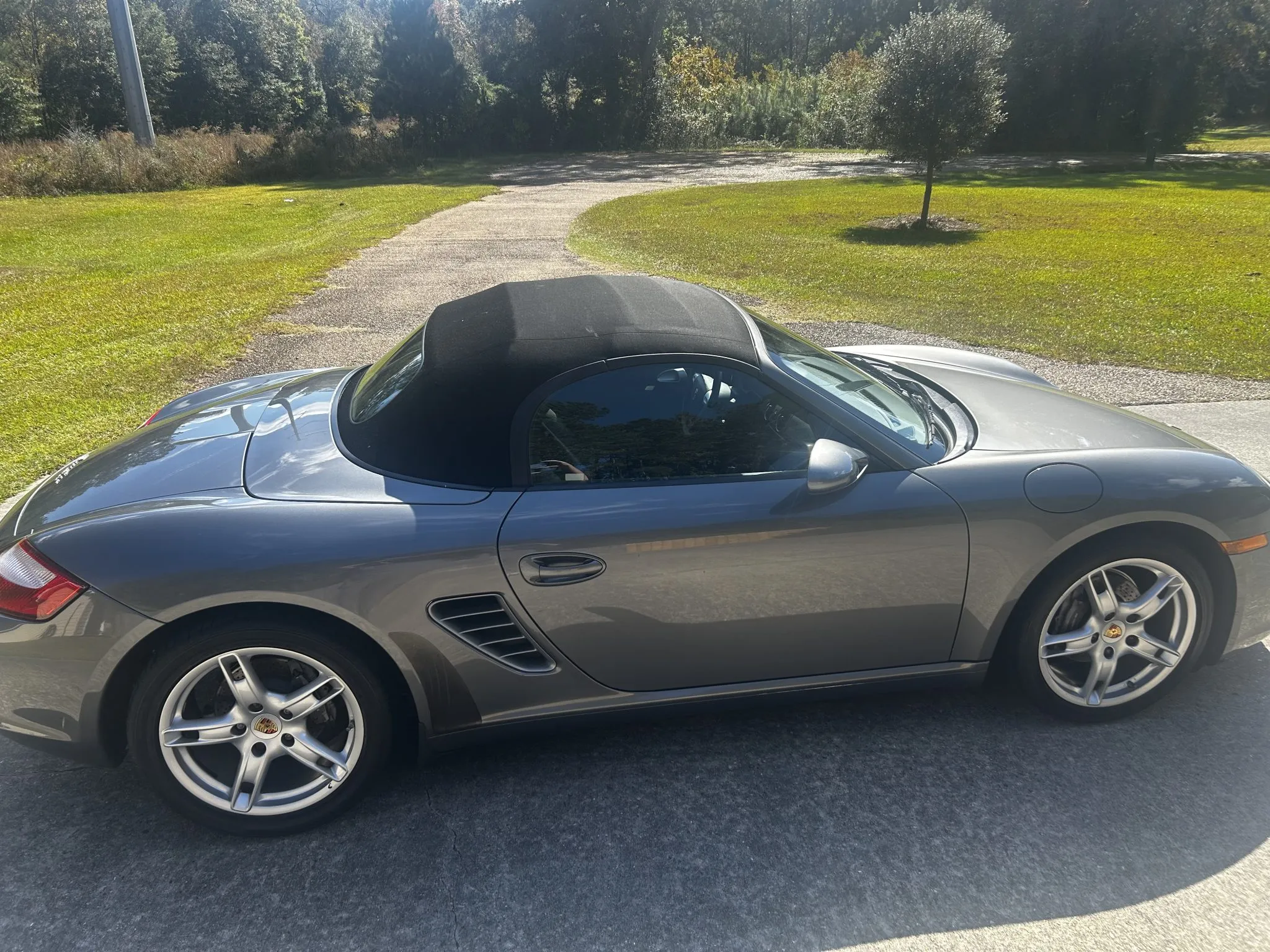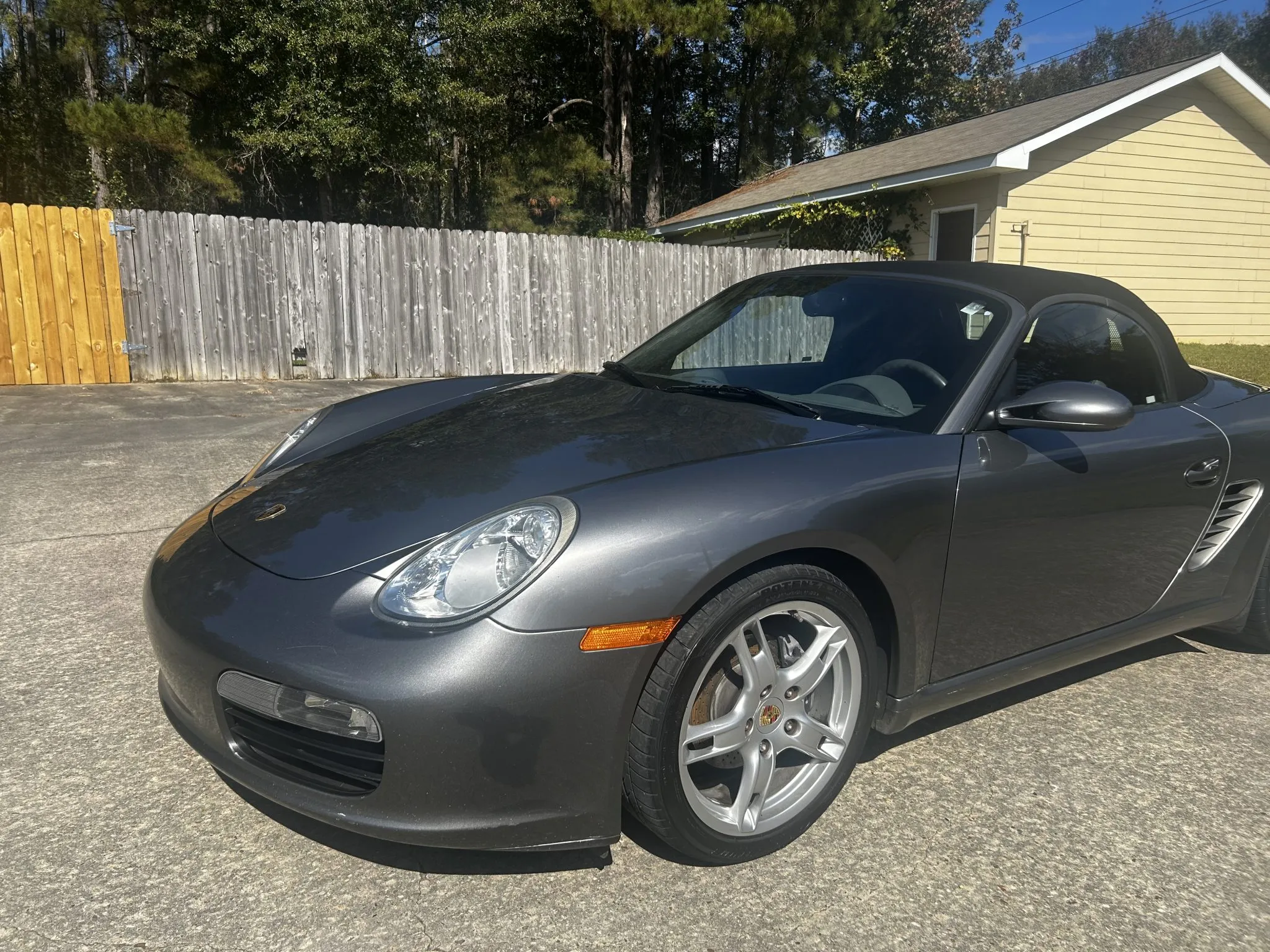 It is finished in Meteor Gray Metallic over Stone Gray Standard leather and is powered by a 2.7-liter flat-six linked with a five-speed manual transaxle. Equipment includes the Bose High End Sound Package, heated seats, 18″ Boxster S wheels, a Black soft top, and a JVC stereo with Bluetooth and CarPlay.