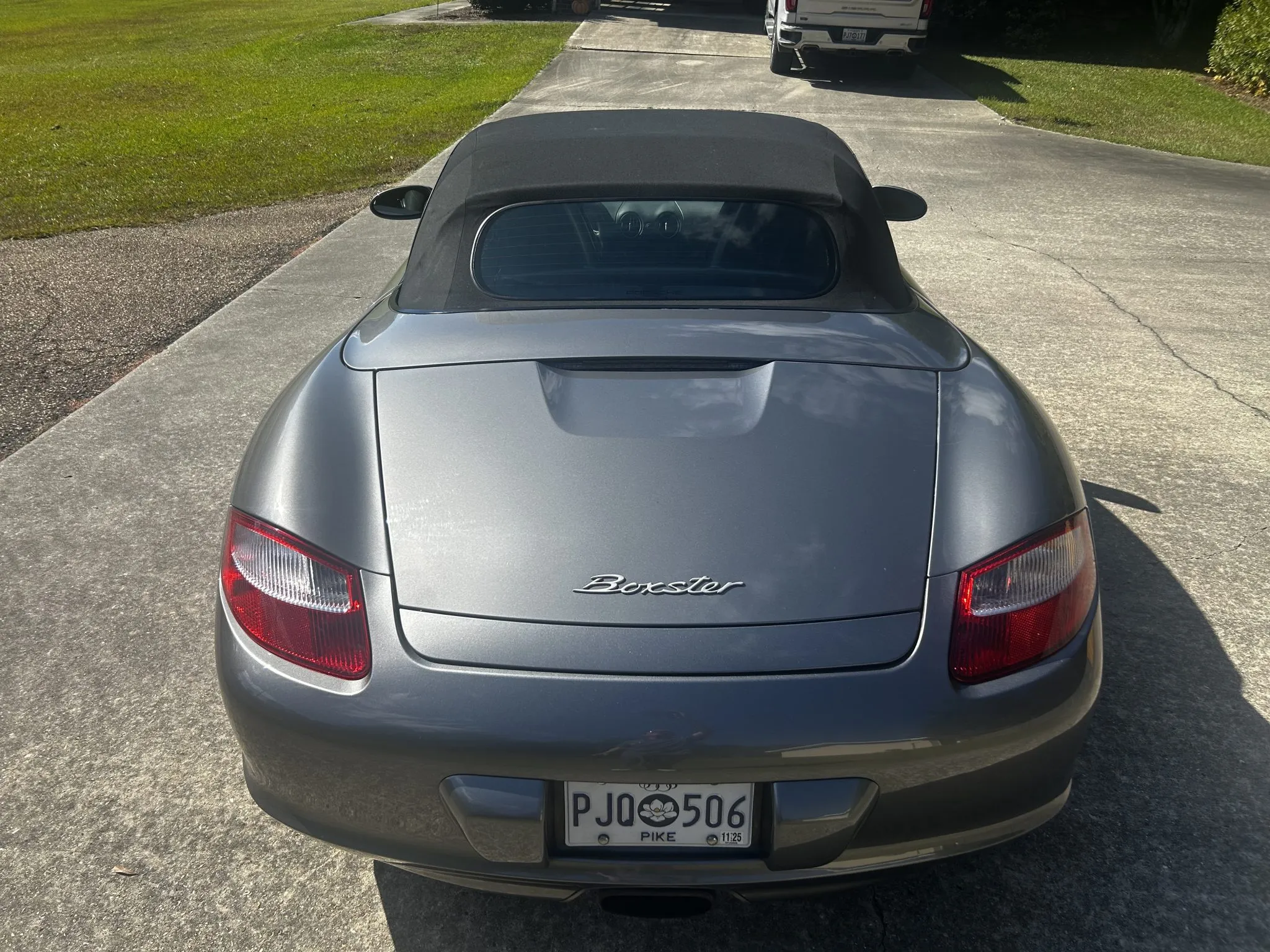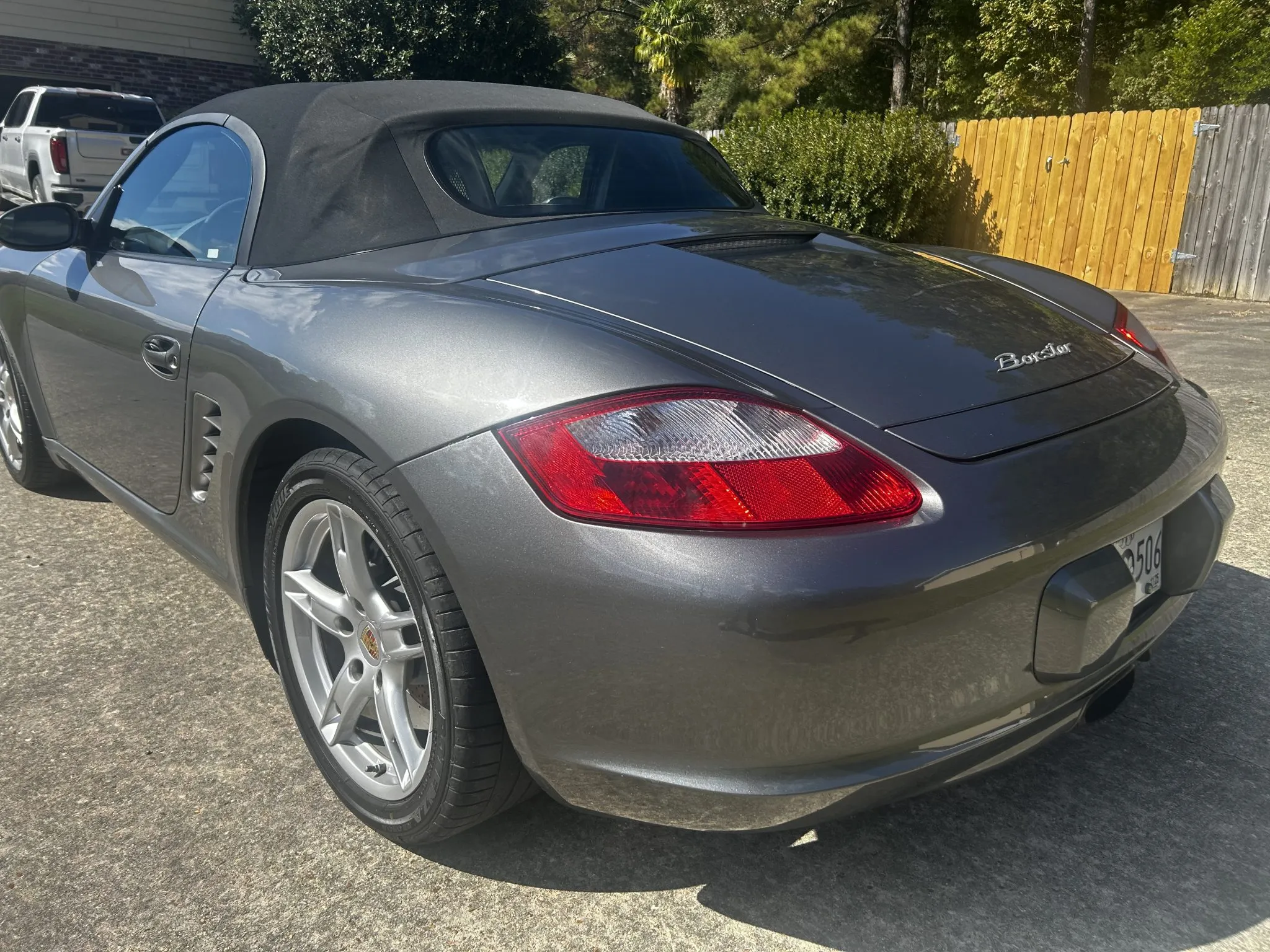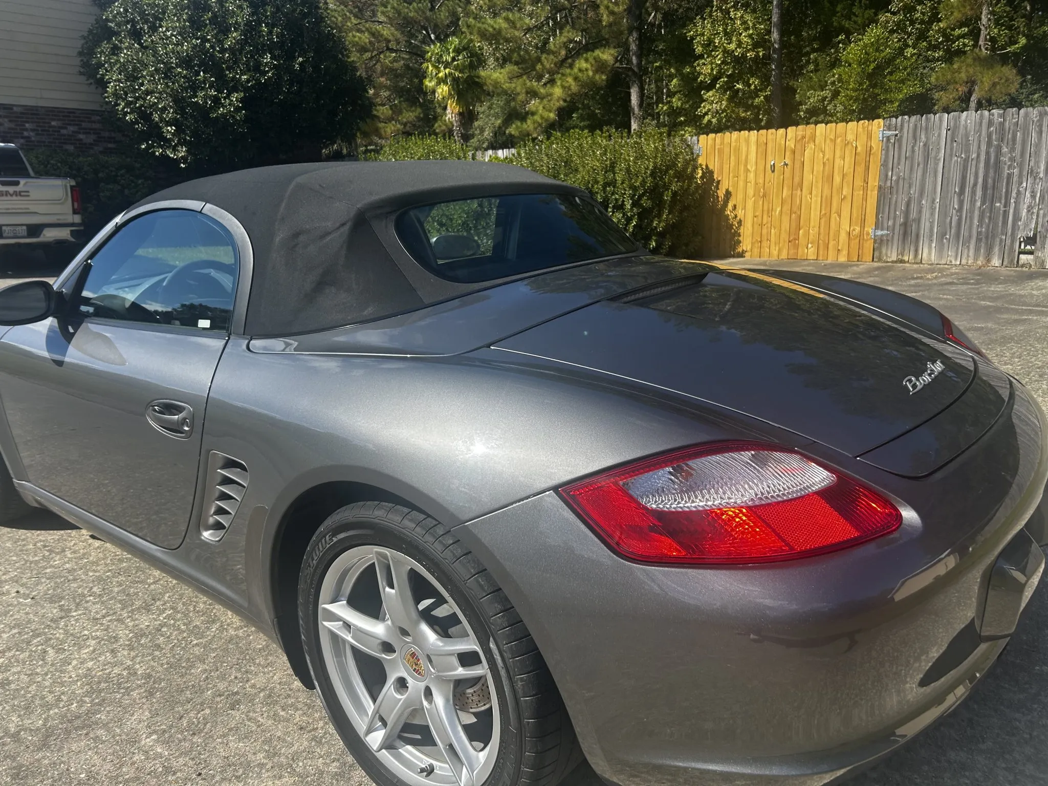 It is finished in Meteor Gray Metallic over Stone Gray Standard leather and is powered by a 2.7-liter flat-six linked with a five-speed manual transaxle. Equipment includes the Bose High End Sound Package, heated seats, 18″ Boxster S wheels, a Black soft top, and a JVC stereo with Bluetooth and CarPlay.