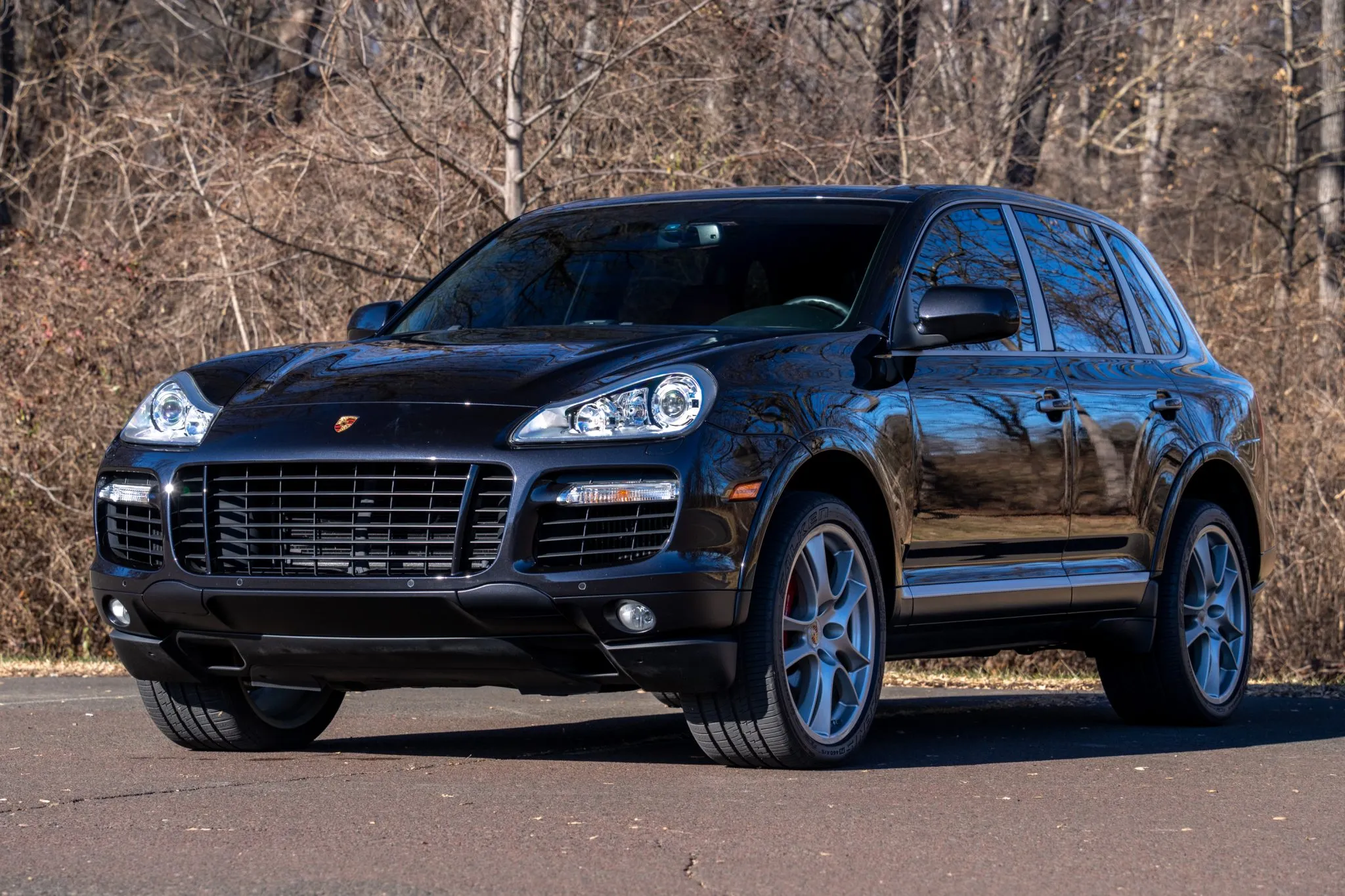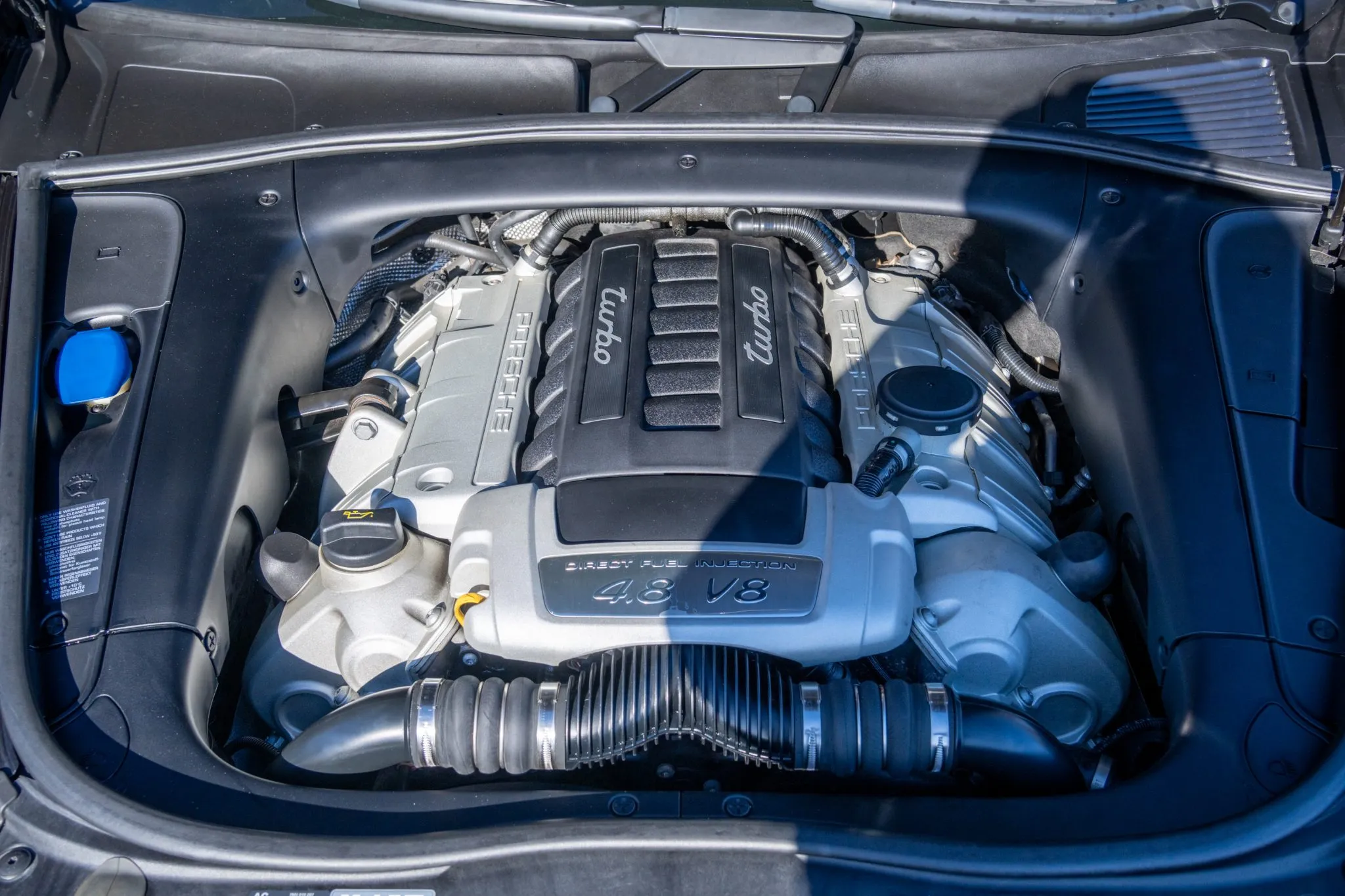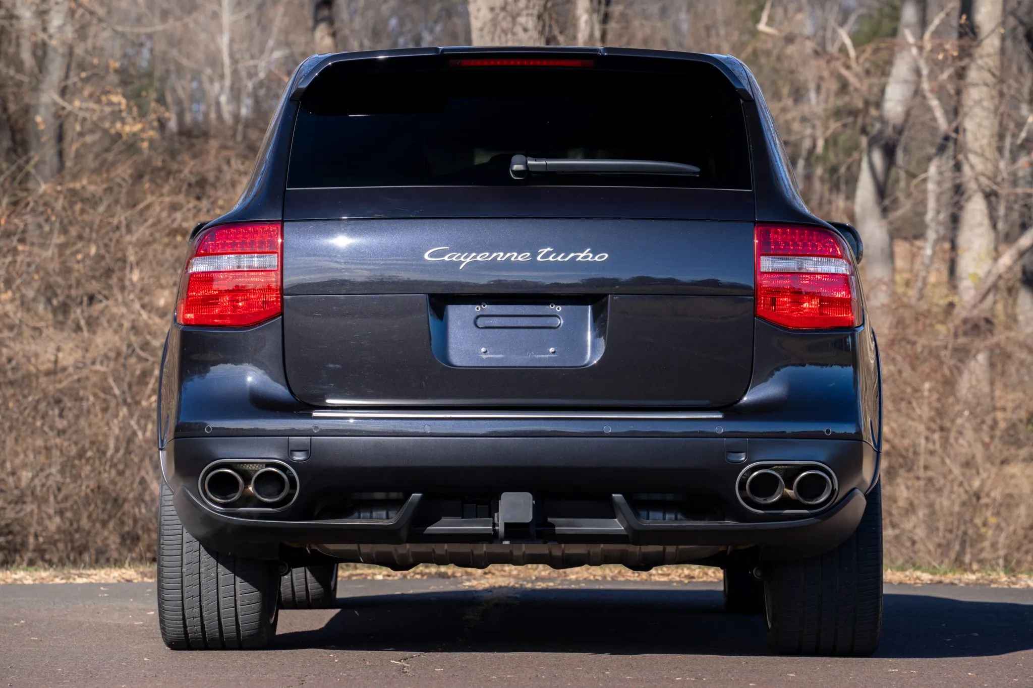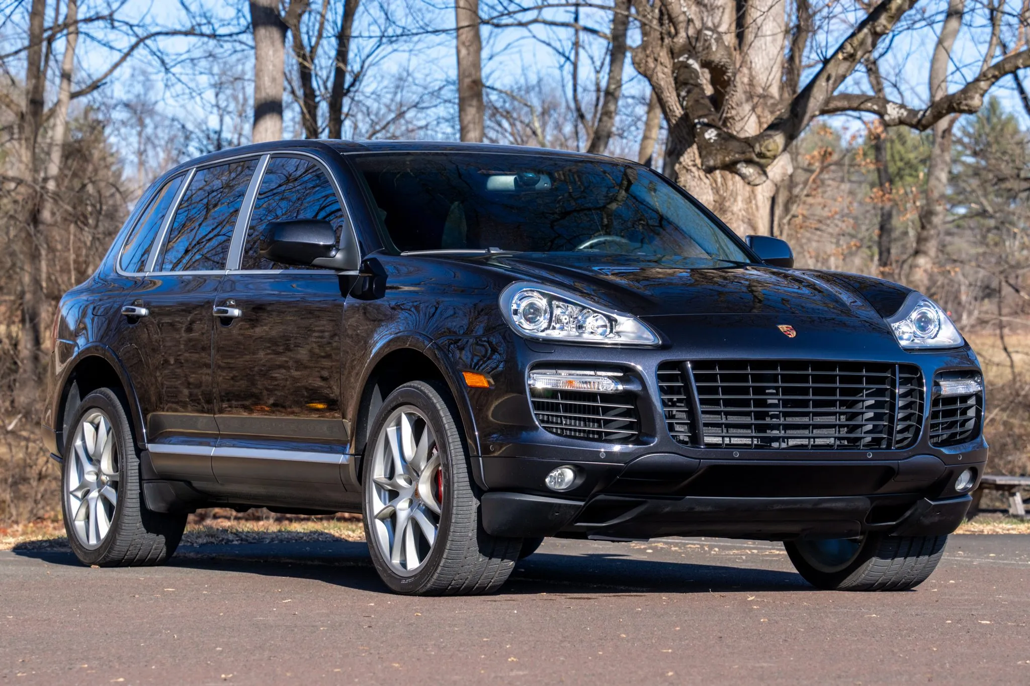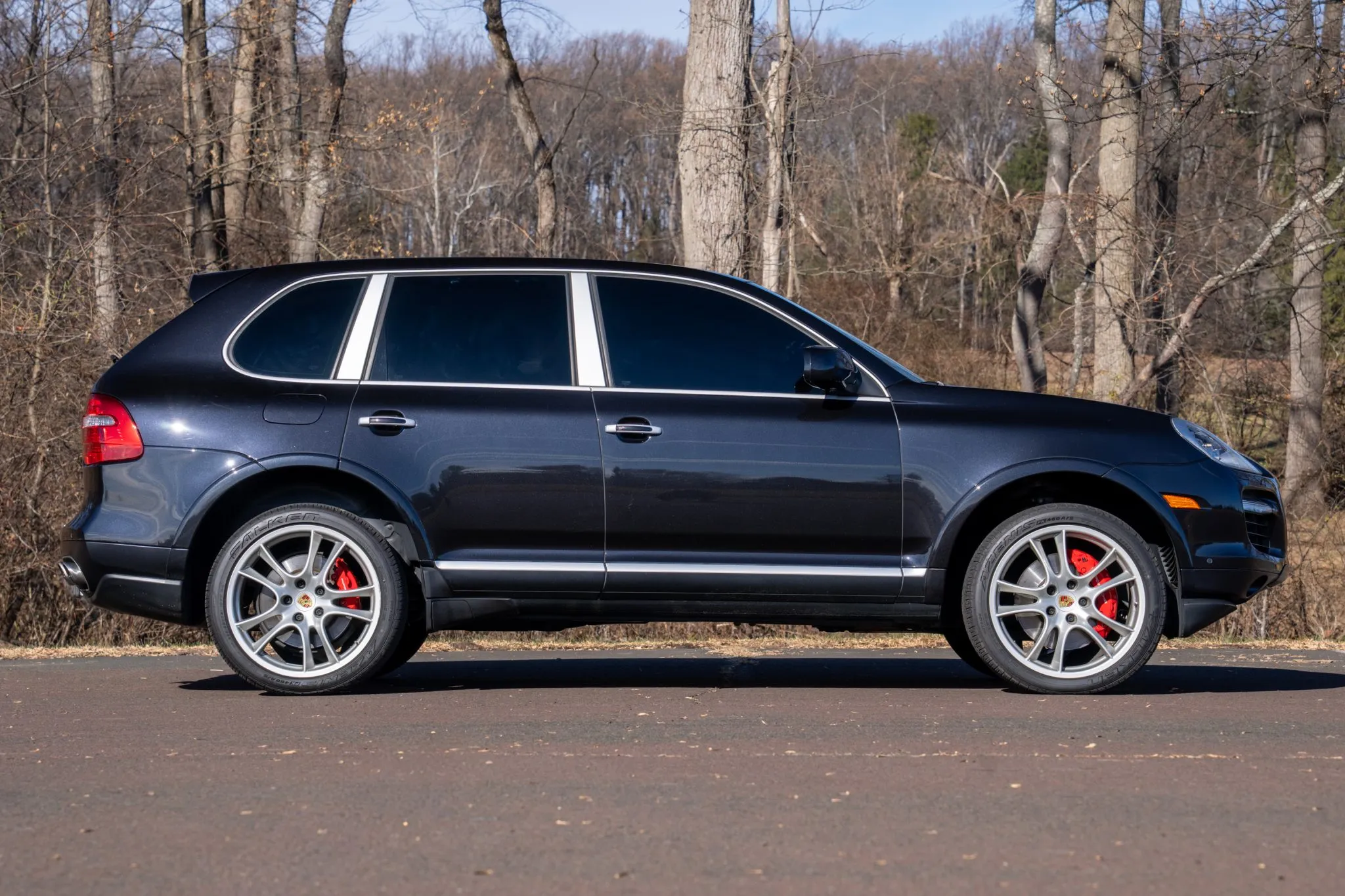 This 2008 Porsche Cayenne Turbo is finished in Basalt Black Metallic over Chestnut leather and is powered by a twin-turbocharged 4.8-liter V8 paired with a six-speed automatic transmission.