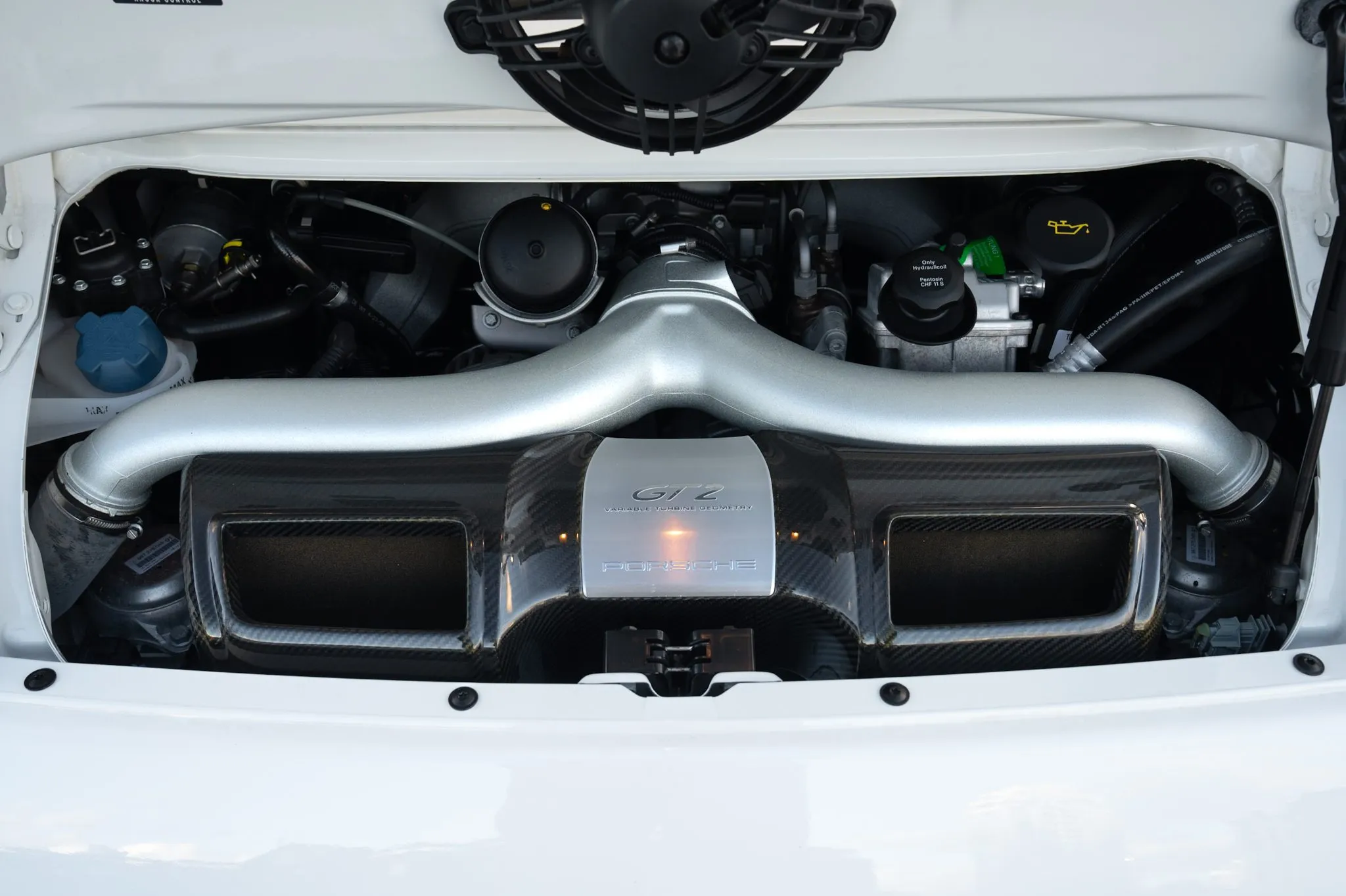 The car is equipped with a locking differential, silver-finished 19″ GT2 wheels, carbon-ceramic brakes, xenon headlights with washers, carbon-fiber sport seats, Porsche Communication Management with navigation, a Bose sound system, and automatic climate control.