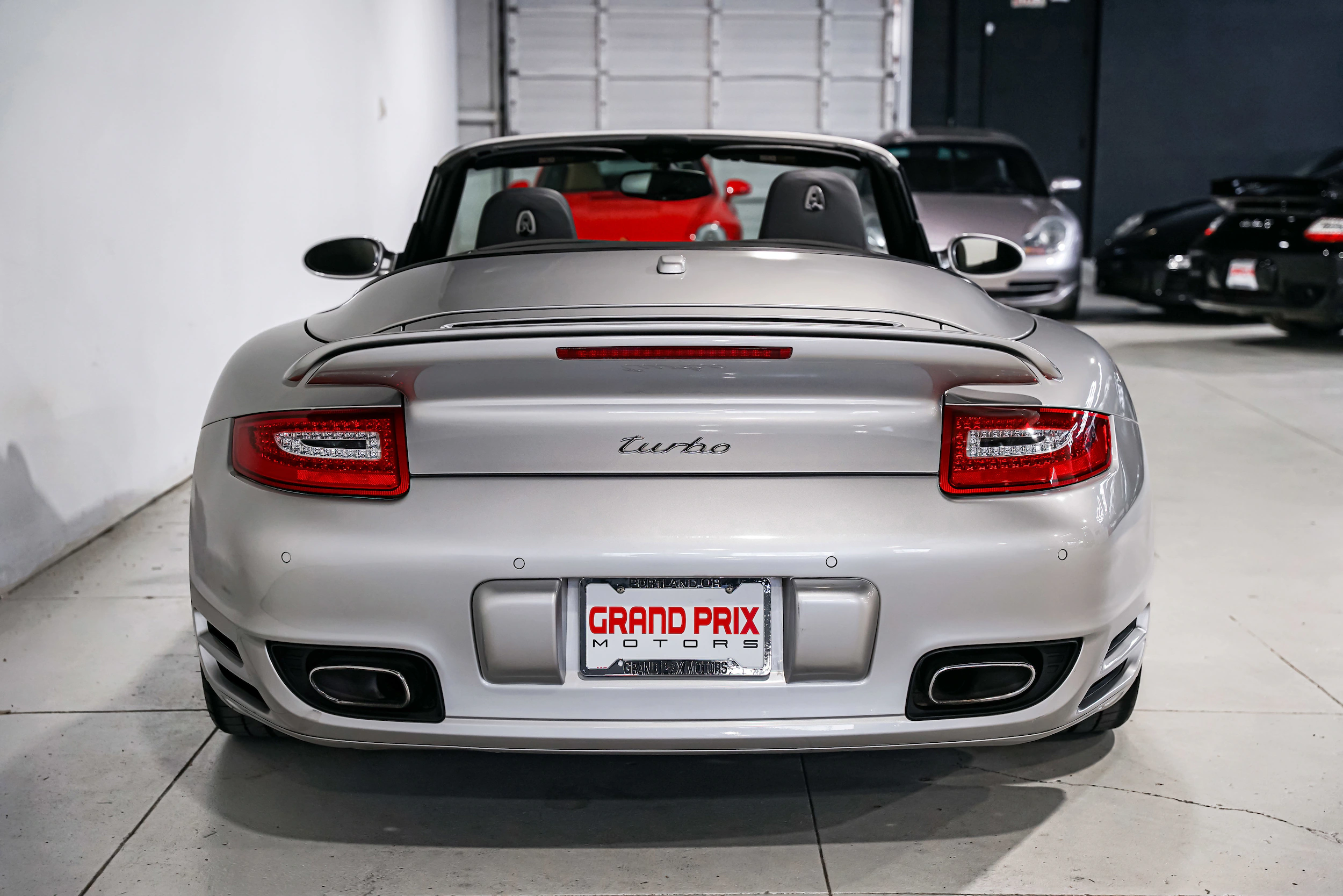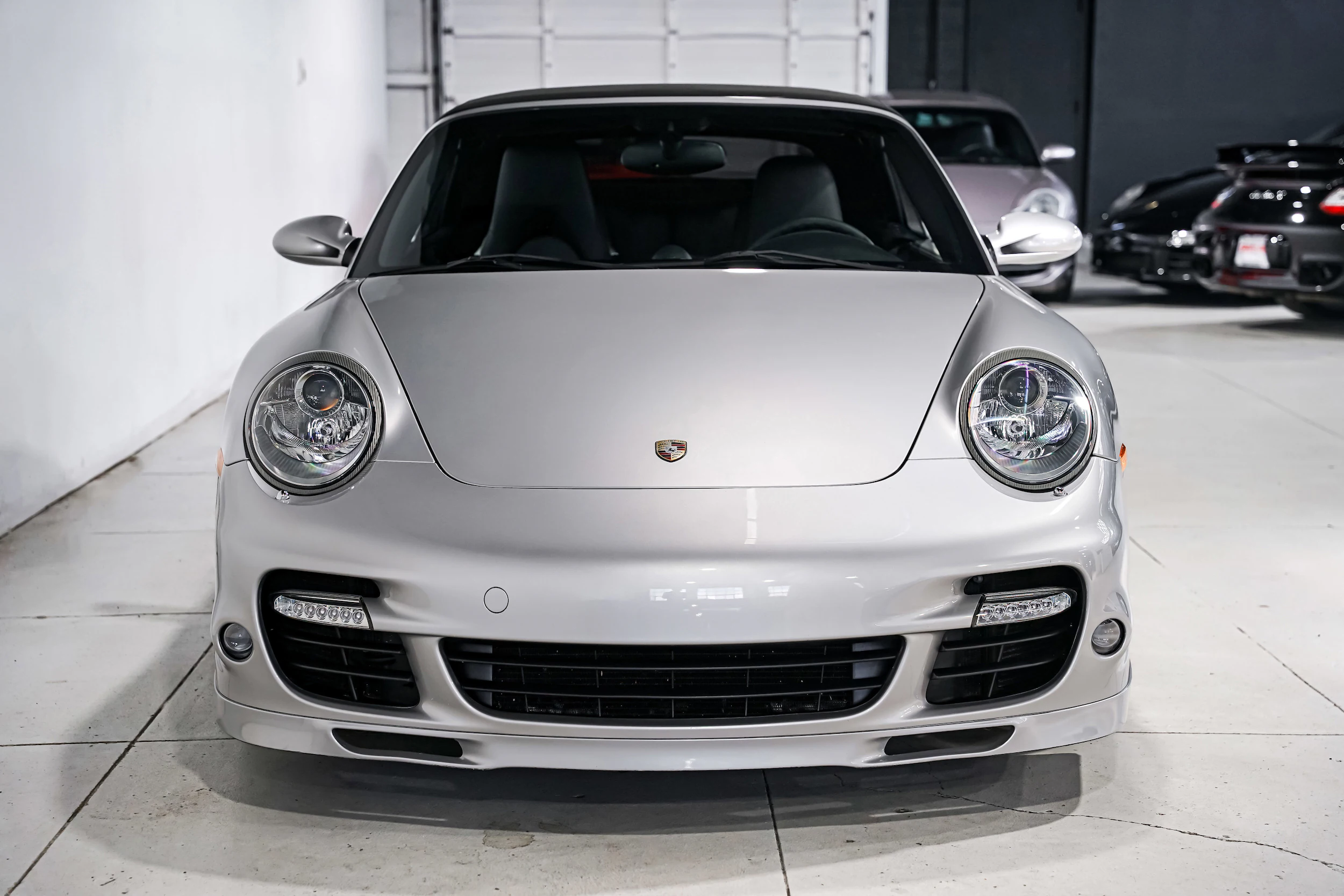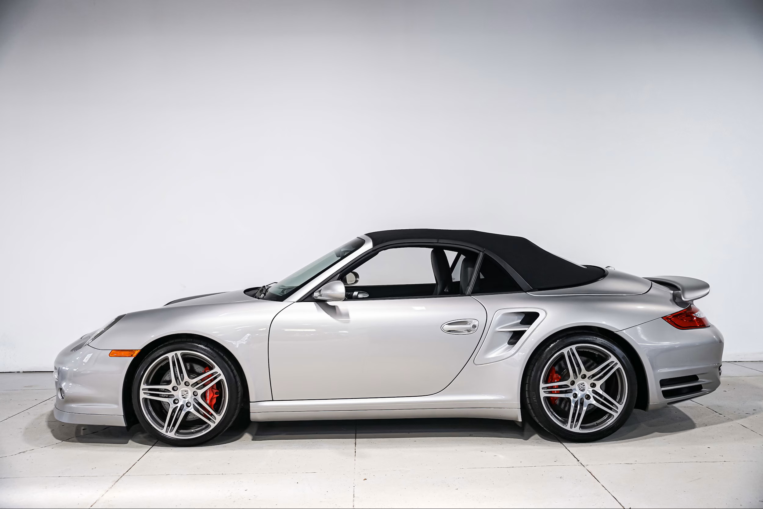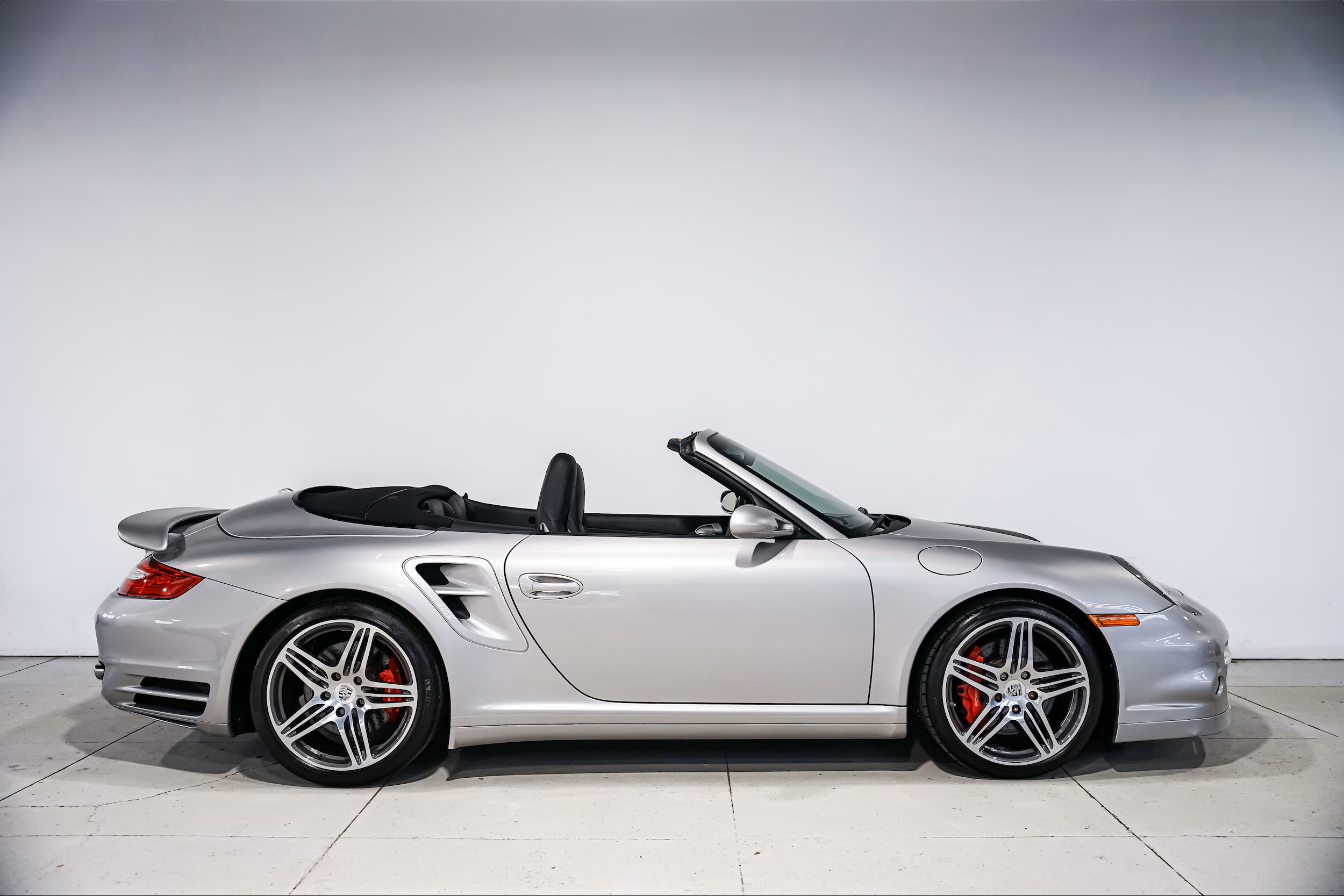This 2009 Porsche 911 Turbo Cabriolet is finished in Arctic Silver Metallic over black full supple leather and is powered by a twin-turbocharged 3.6-liter Mezger flat-six engine paired with a six-speed manual transaxle and all-wheel drive. Factory features include the Sport Chrono Package, a black soft top, body-color lower bodywork, 19″ Turbo wheels, and heated power-adjustable front seats.