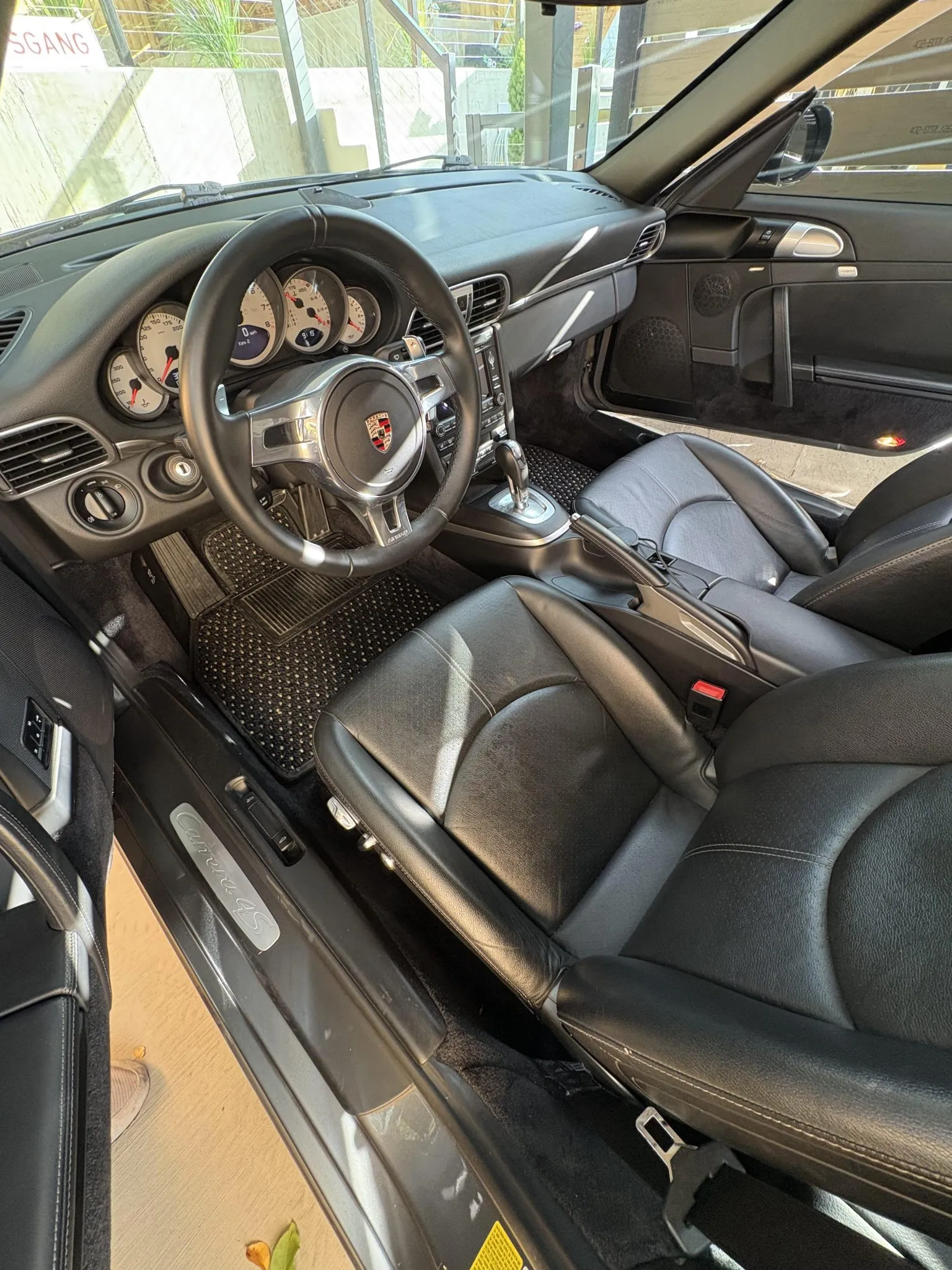 The car is finished in Meteor Gray Metallic over black leather and is powered by a 3.8-liter flat-six that drives all four wheels through a seven-speed PDK dual-clutch transaxle. Equipment includes the Sport Chrono Package Plus, a sunroof, PCM with navigation, Coco floor mats, heated power-adjustable front seats, a Bose sound system, and automatic climate control.