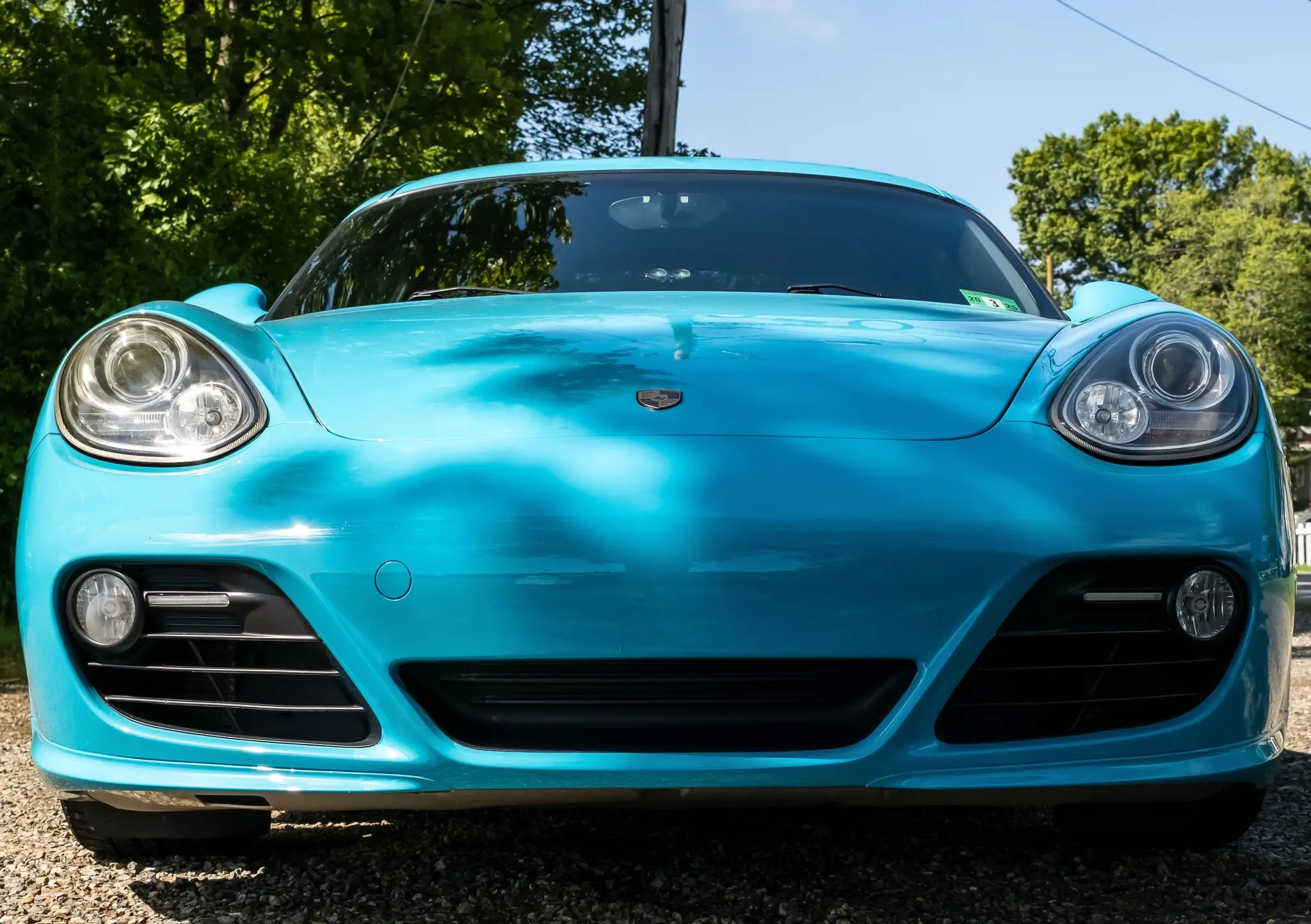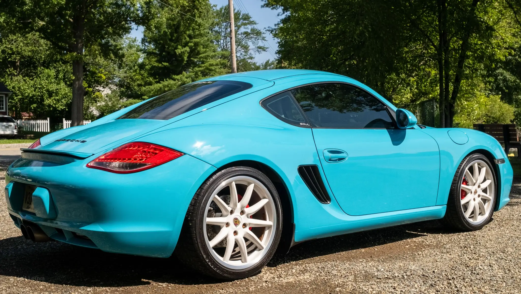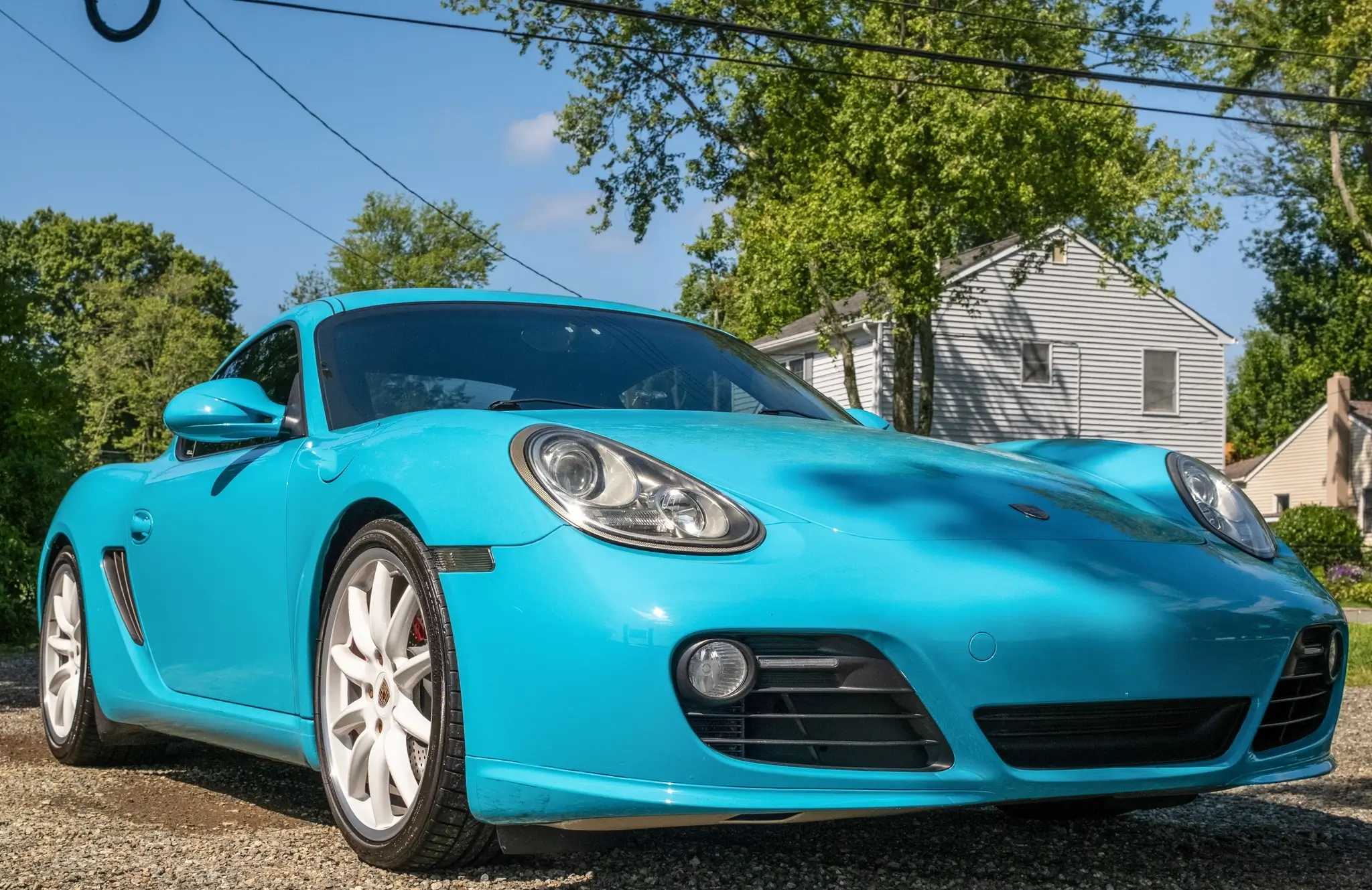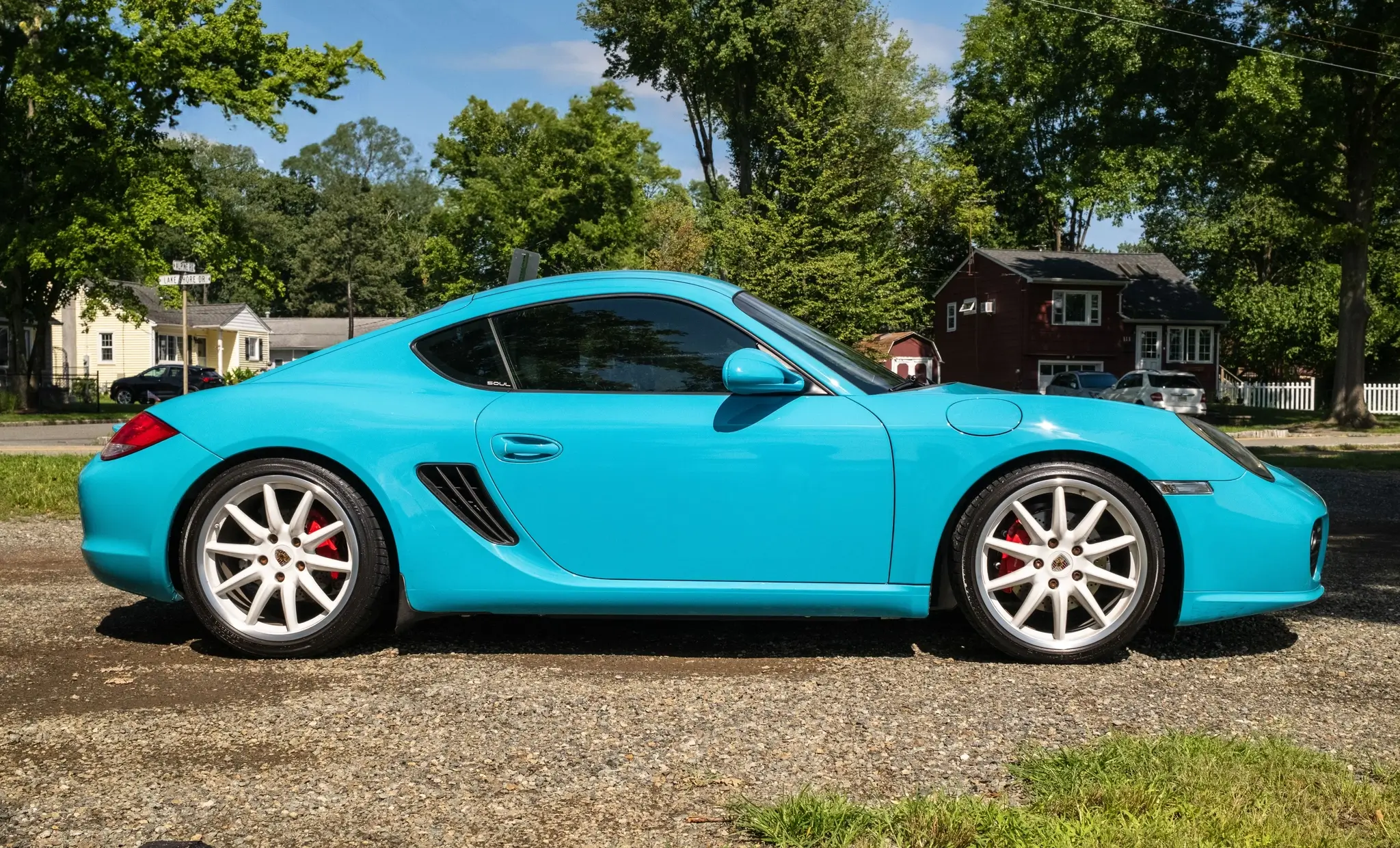 Featuring a 3.4-liter flat-six engine paired with a 6-speed manual transaxle, this 2010 Porsche 987.2 Cayman S is presented in a Miami Blue vinyl wrap over Carrara White paint and a Black interior.
