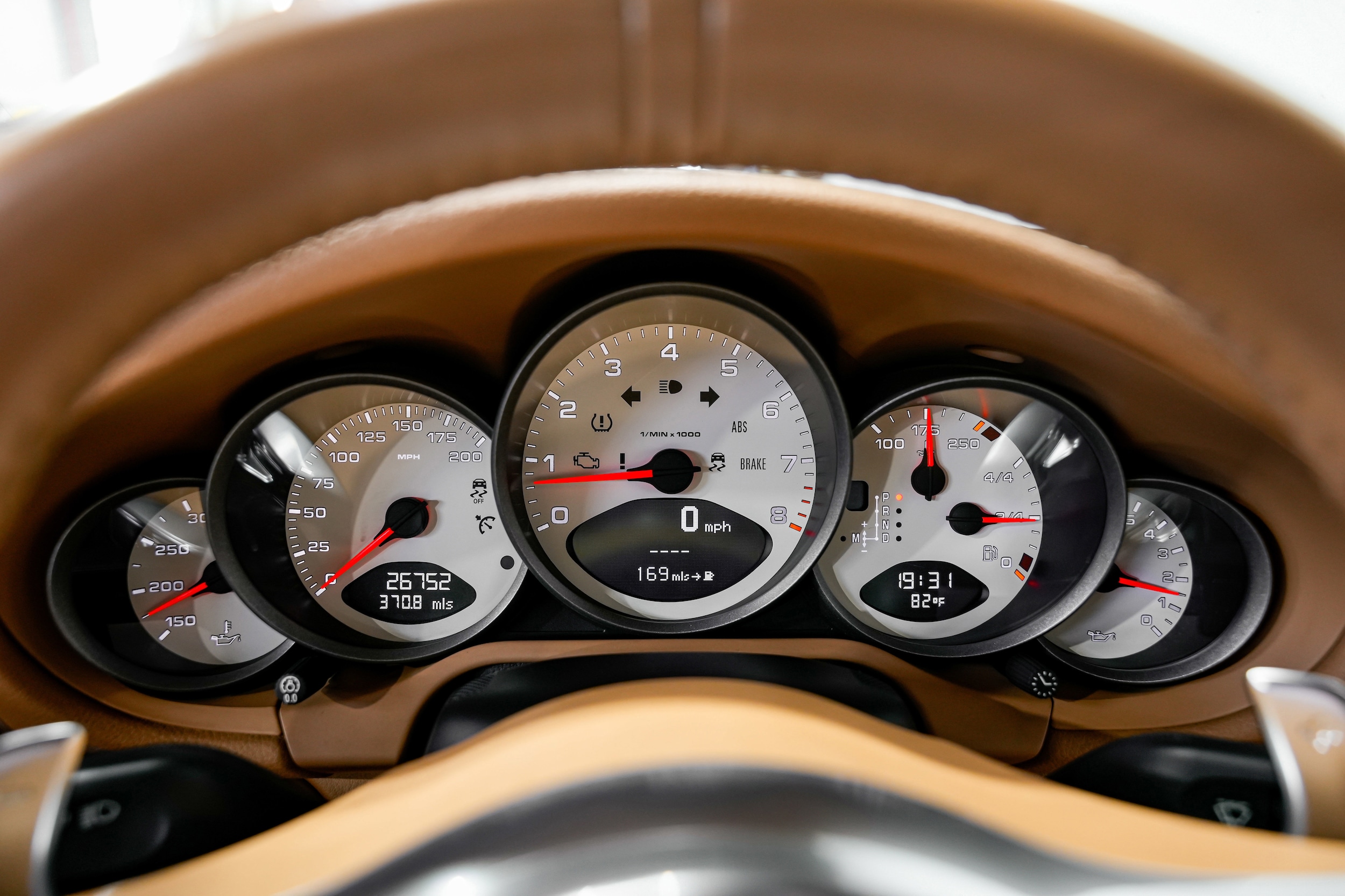 The SportDesign steering wheel frames a gauge cluster with optional Carrara White dials, including a central 8k-rpm tachometer, a 200-mph speedometer, and auxiliary gauges. The optional Sport Chrono Package Plus adds a stopwatch atop the dashboard and enhances driving dynamics through selectable performance modes.