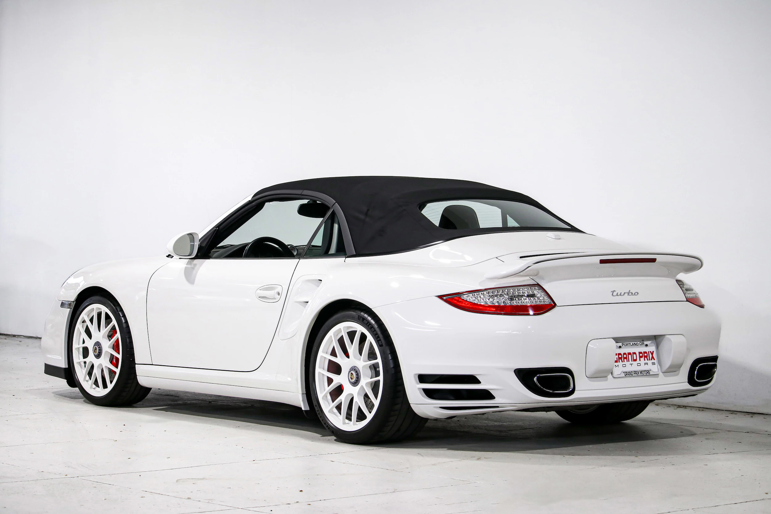 The exterior is finished in Carrara White with a black convertible soft top and features the optional Exterior Package Painted, which includes a painted front intake grille, painted headlight washer covers, and body-matched trim accents. Clear taillights and bi-xenon headlights with Porsche Dynamic Light System (PDLS) complete the refined look. The body-color 19″ RS Spyder center-lock wheels enhance its aggressive stance.