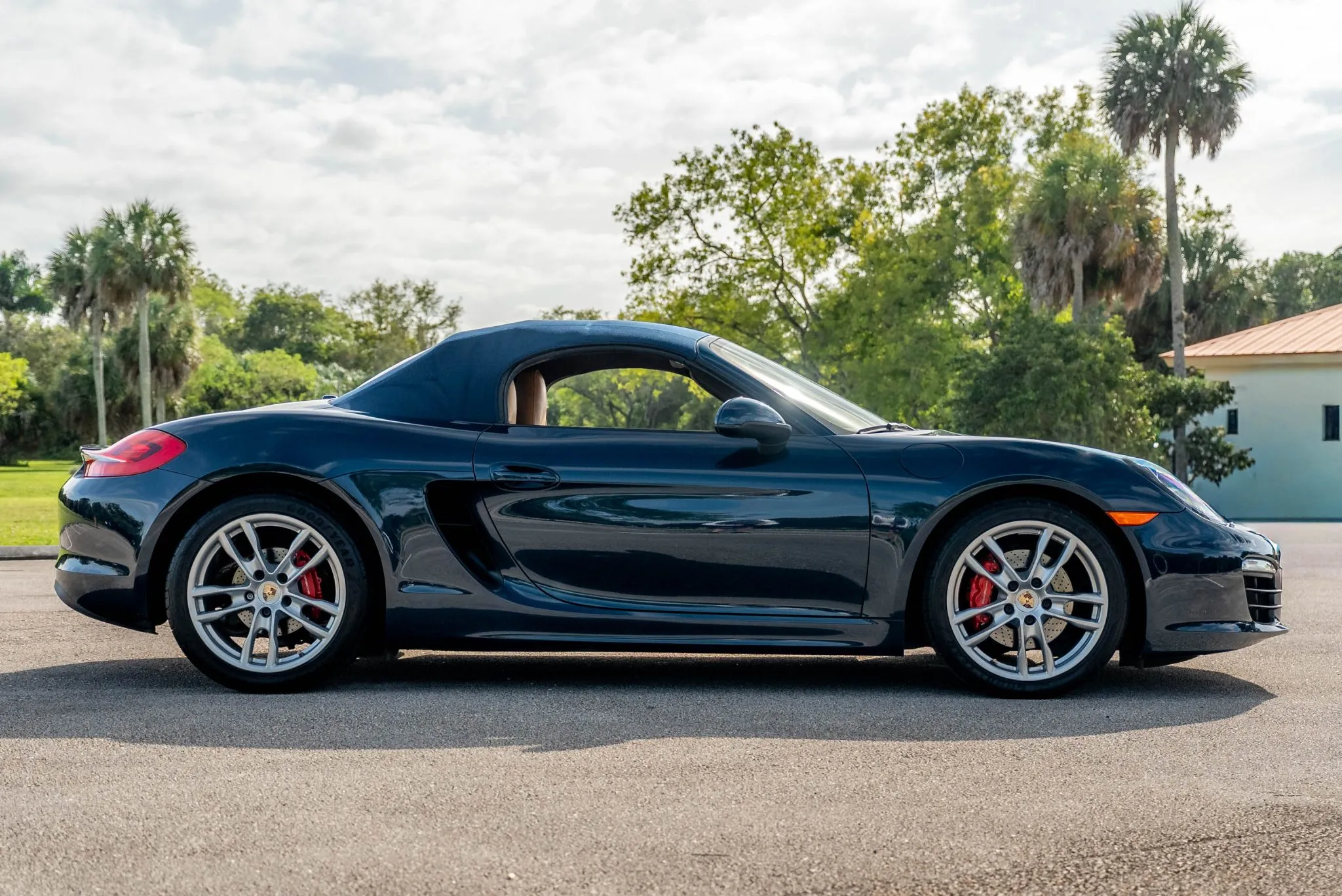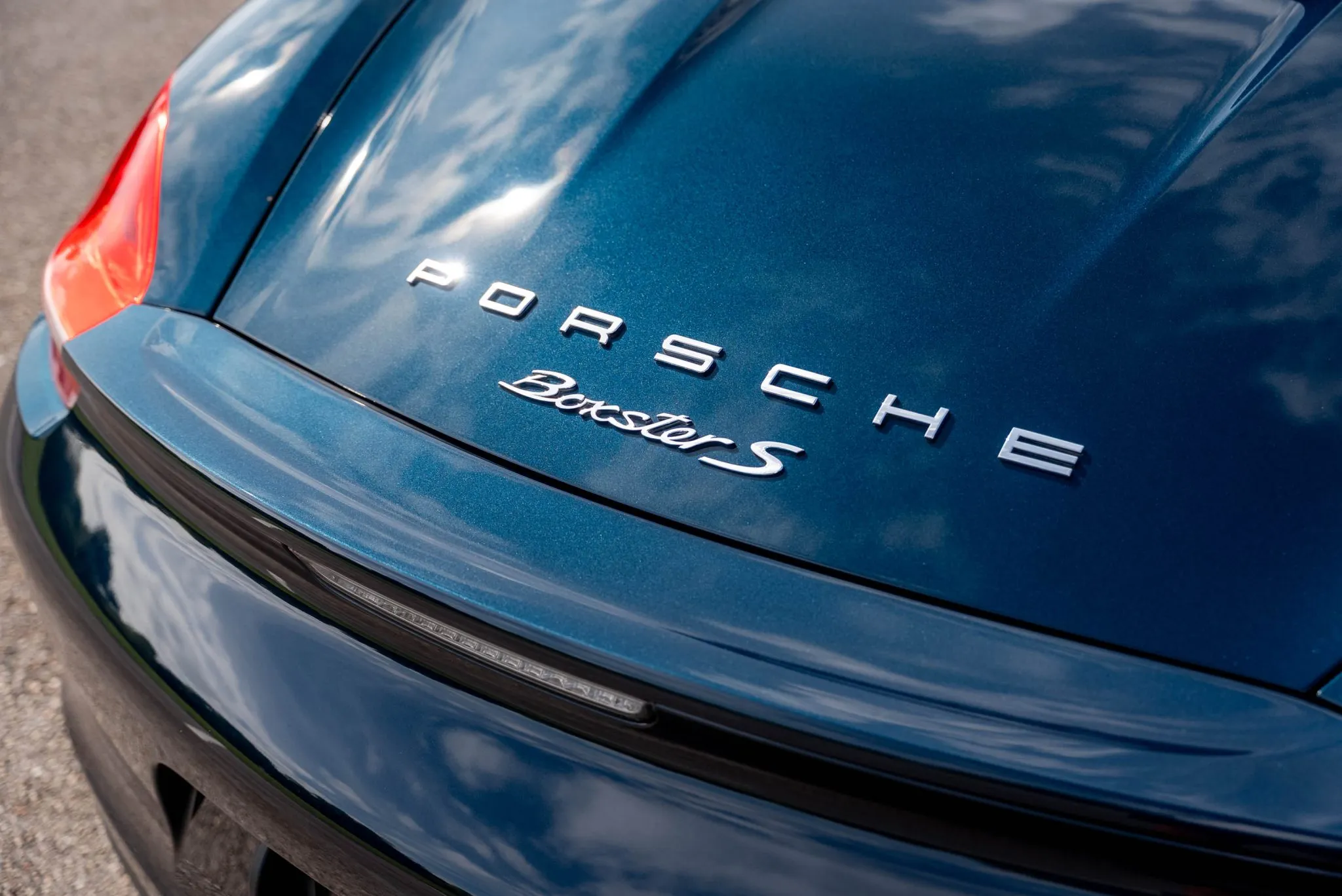 Equipment includes the Premium and Sport Chrono packages as well as a Sport exhaust, a SportDesign steering wheel, 19″ Boxster S wheels, a blue soft top, heated and ventilated power seats, and bi-xenon headlights with PDLS.