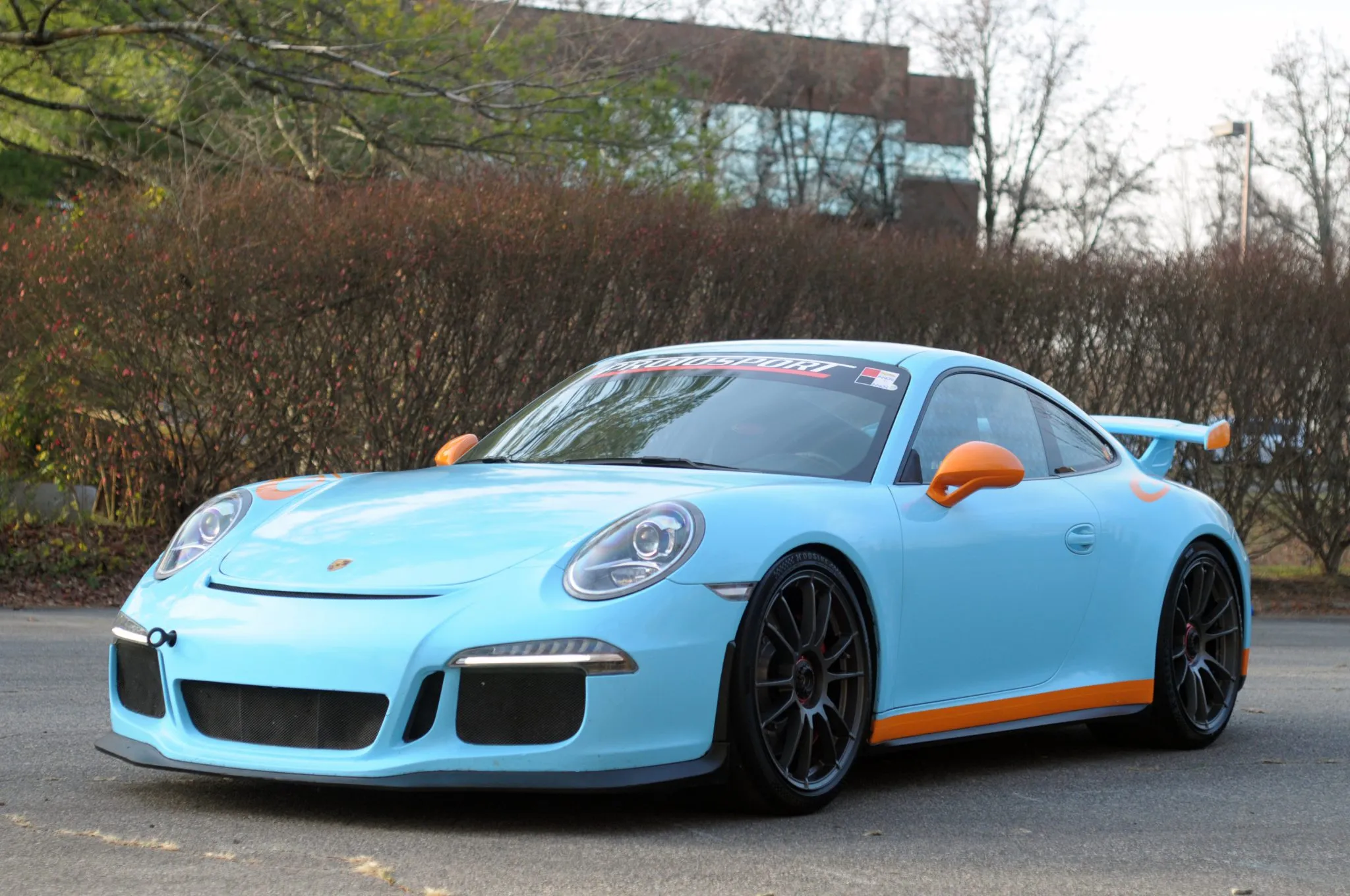 This 2014 Porsche 911 GT3 has received a replacement 3.8-liter flat-six and a seven-speed PDK dual-clutch transaxle under current ownership, and it has been modified with aftermarket exhaust and suspension components as well as 20″ O.Z. Racing wheels and a blue and orange exterior vinyl wrap that covers the white-finished body.