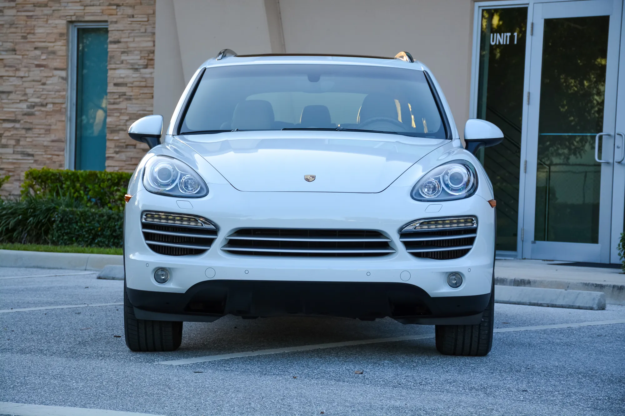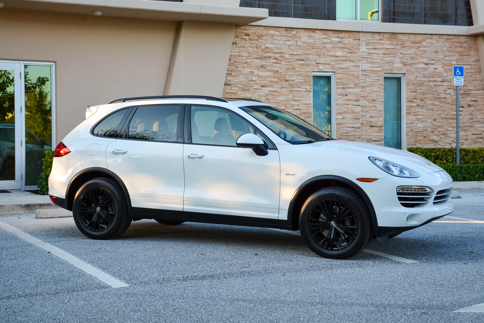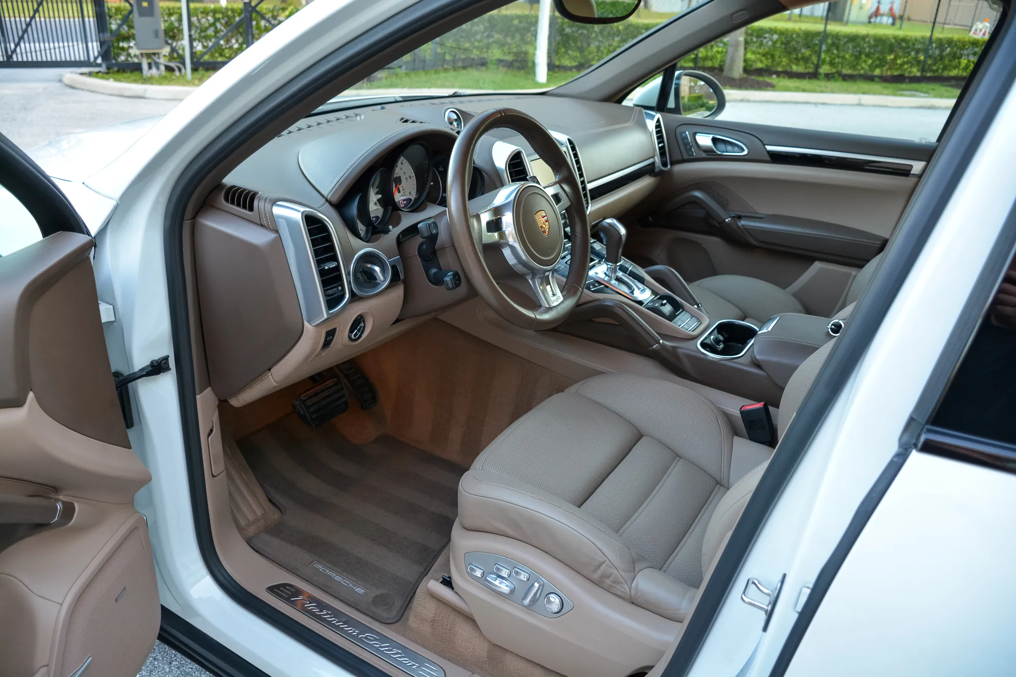 This 2014 Porsche Cayenne Diesel is a Platinum Edition example finished in White over Light Tartufo and Umber leather, and it has 68k miles following history with the original owner in Florida until 2025.