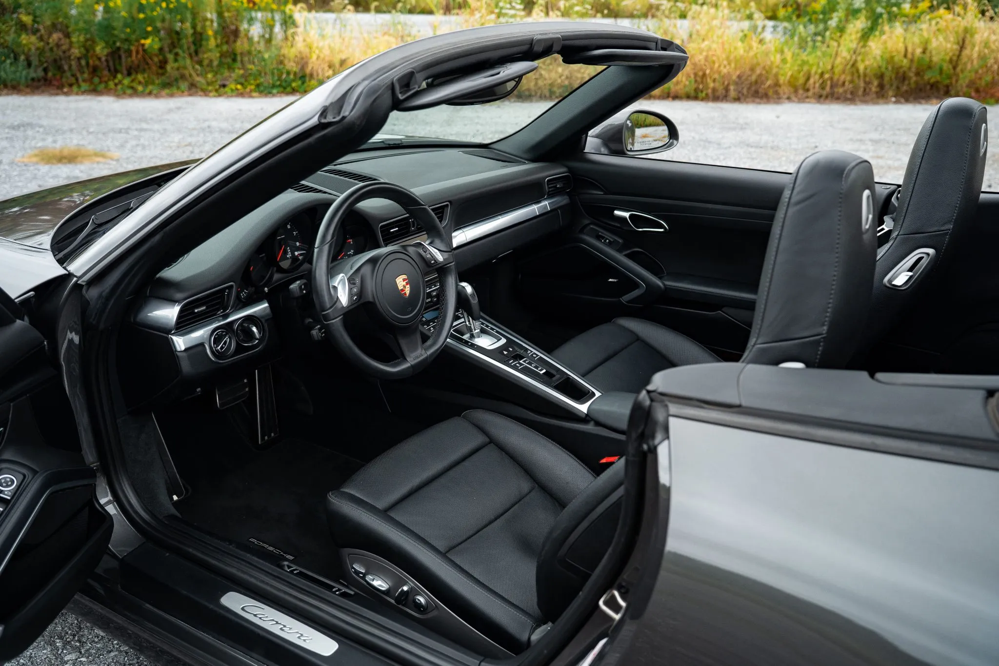 Equipment includes 20″ Carrera S alloy wheels, a black convertible soft top, bi-xenon headlights with PDLS, front and rear ParkAssist, the Premium Package Plus, heated and ventilated power-adjustable front seats, a heated steering wheel, Porsche Communication Management with navigation, a back-up camera, a Bose sound system, and dual-zone automatic climate control.