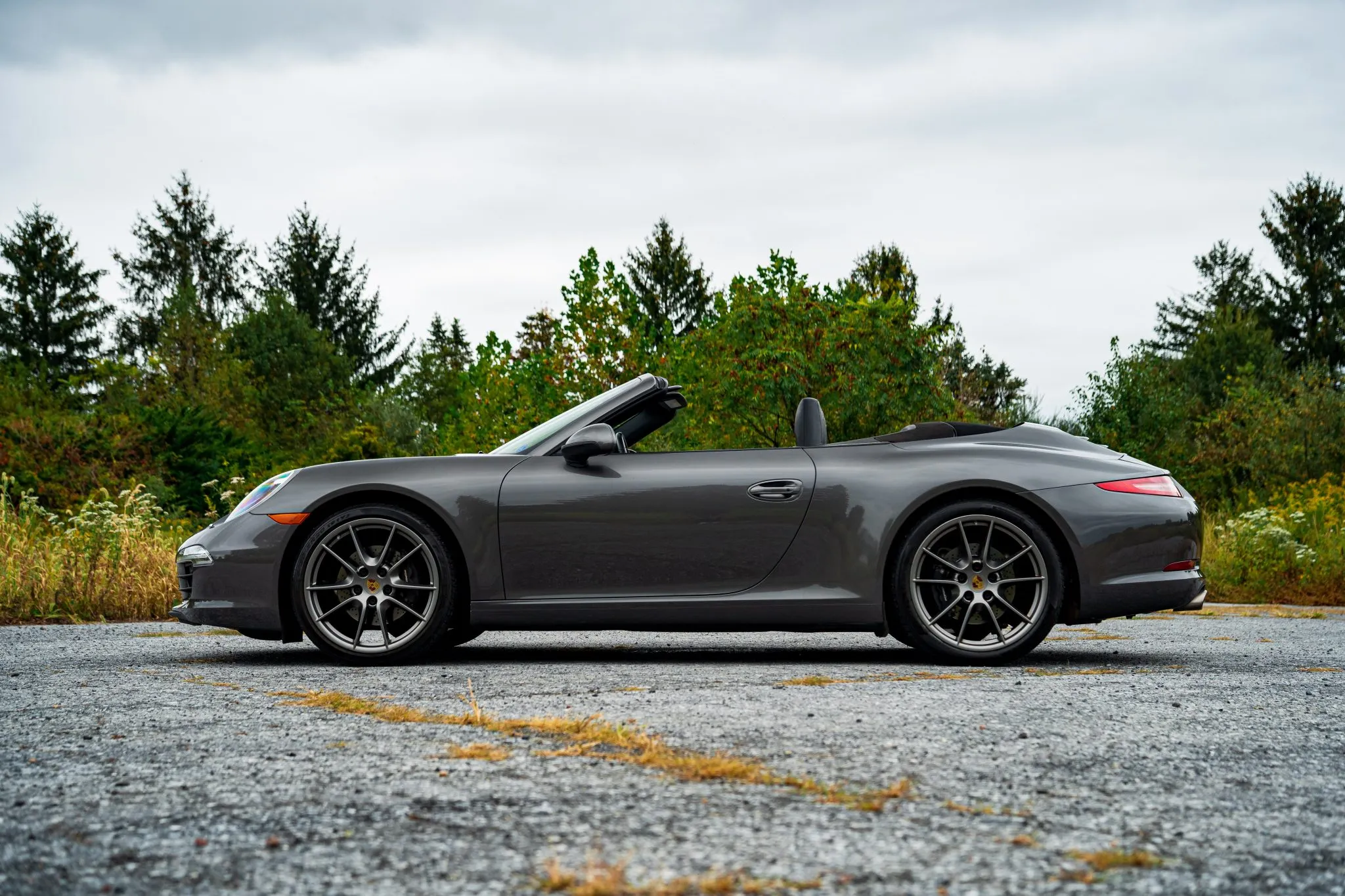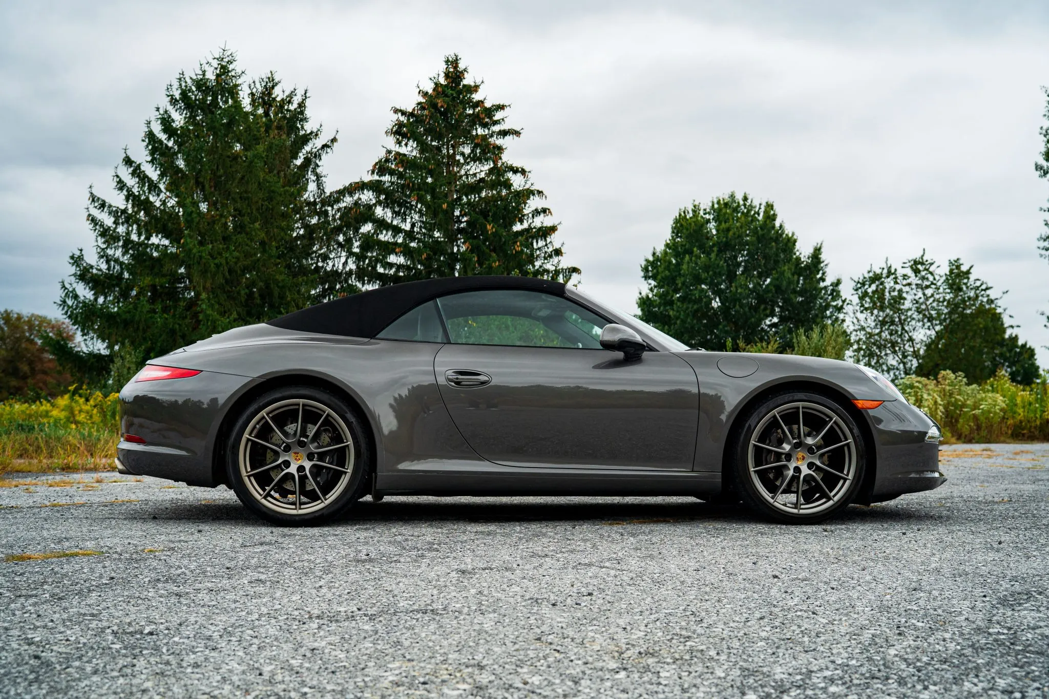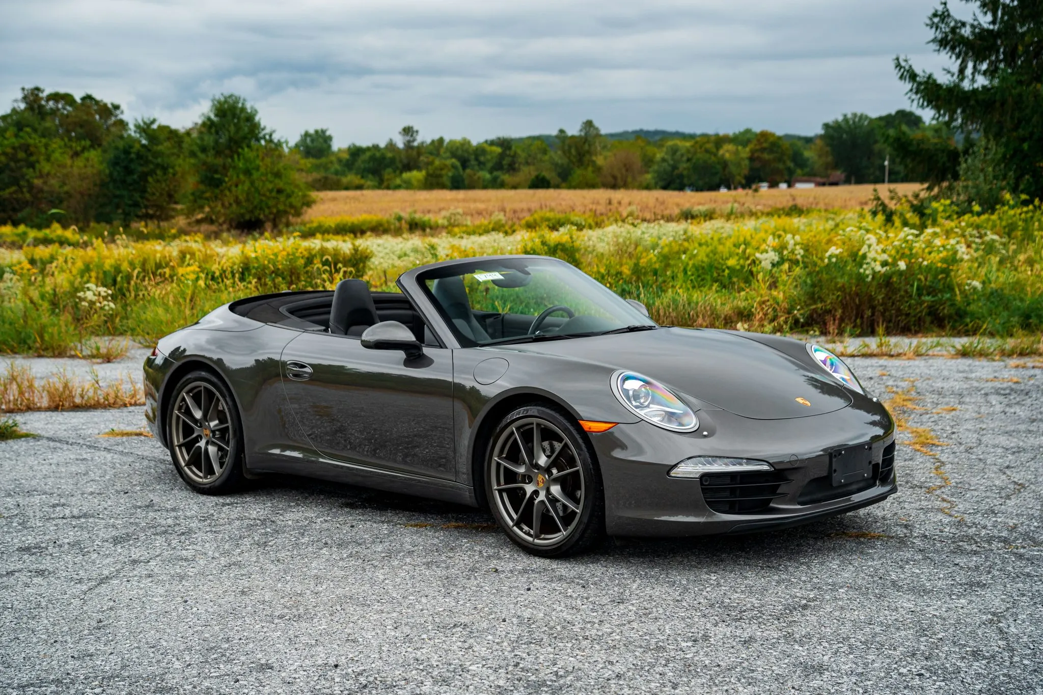 This 2015 Porsche 911 Carrera cabriolet has 34k miles and remained registered to its original owner until 2025. It is powered by a 3.4-liter flat-six paired with a seven-speed PDK automatic transaxle and is finished in Agate Gray Metallic over black leather upholstery.