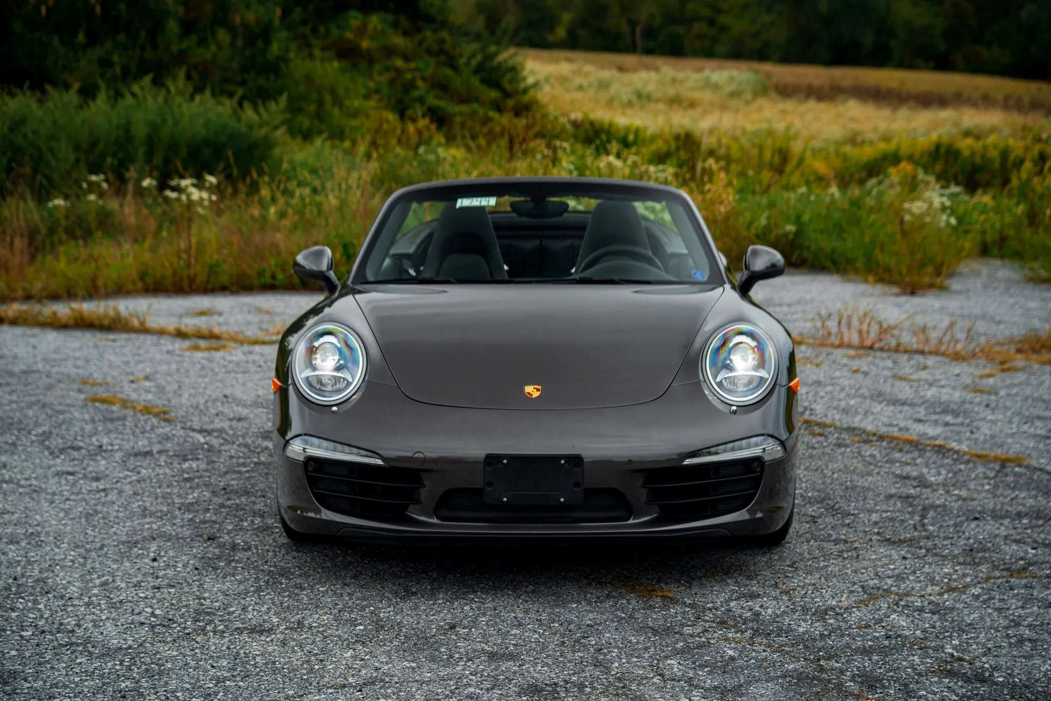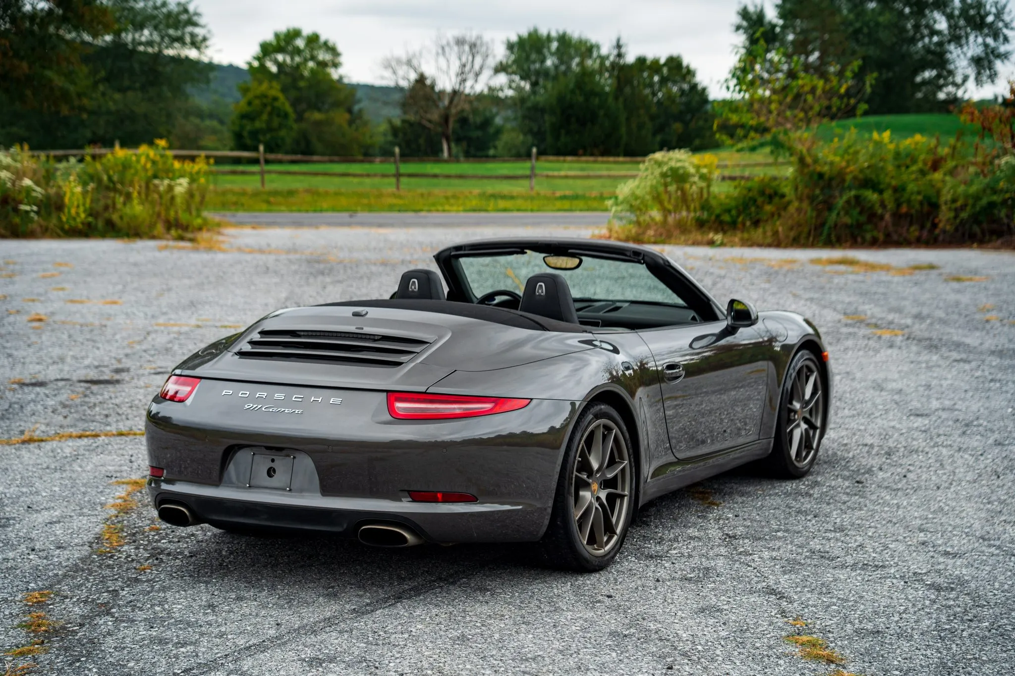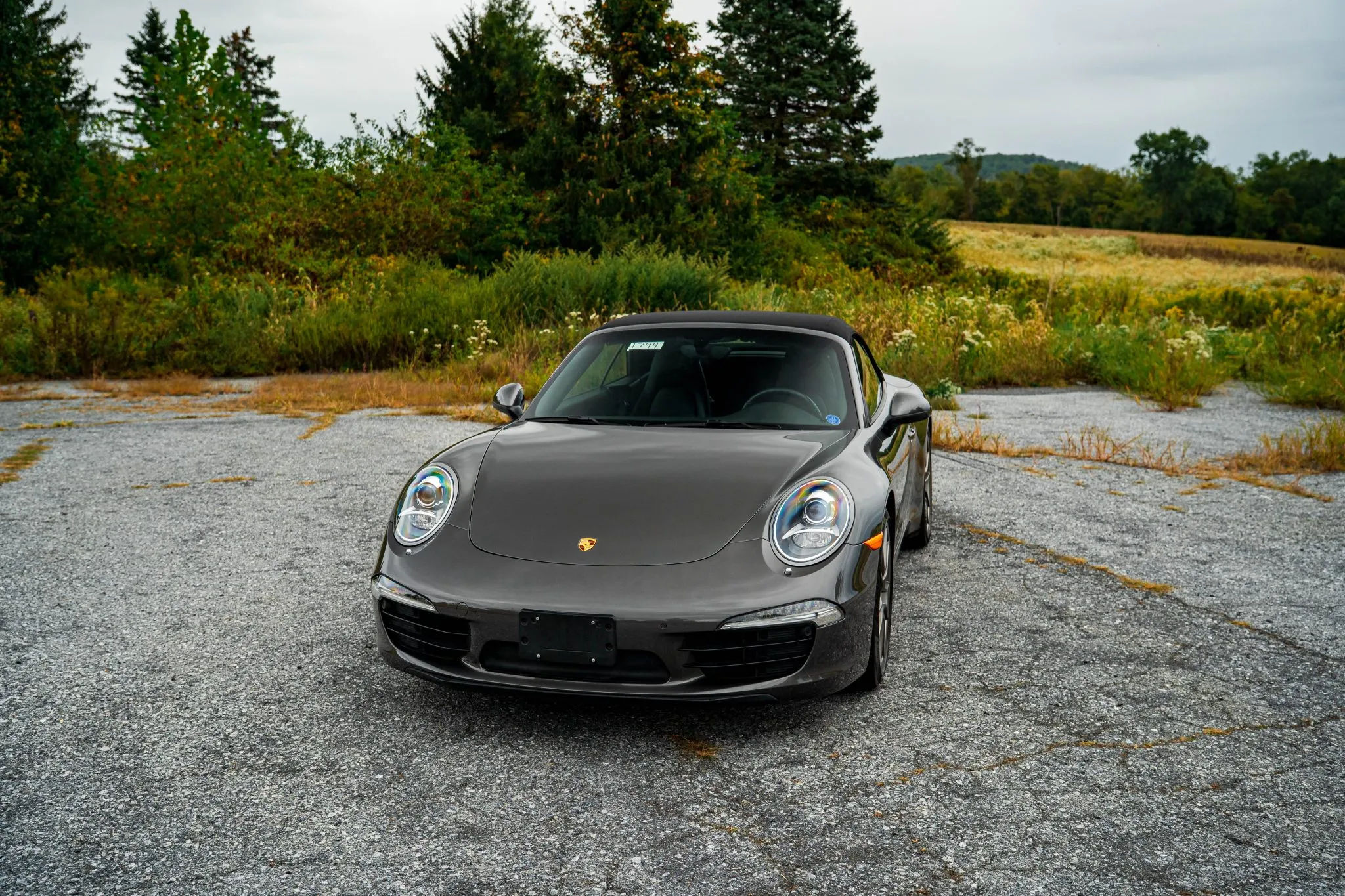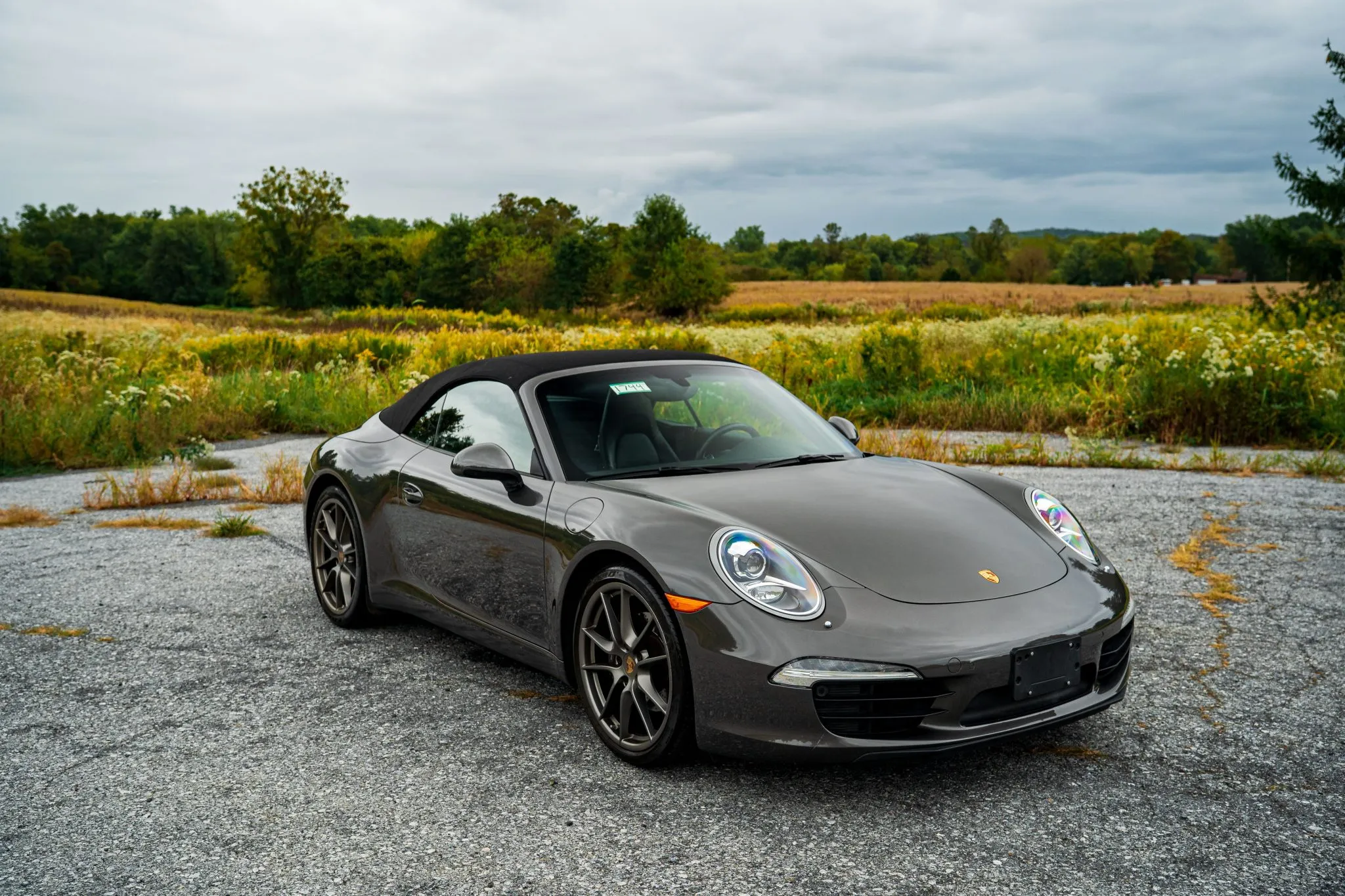 This 2015 Porsche 911 Carrera cabriolet has 34k miles and remained registered to its original owner until 2025. It is powered by a 3.4-liter flat-six paired with a seven-speed PDK automatic transaxle and is finished in Agate Gray Metallic over black leather upholstery.