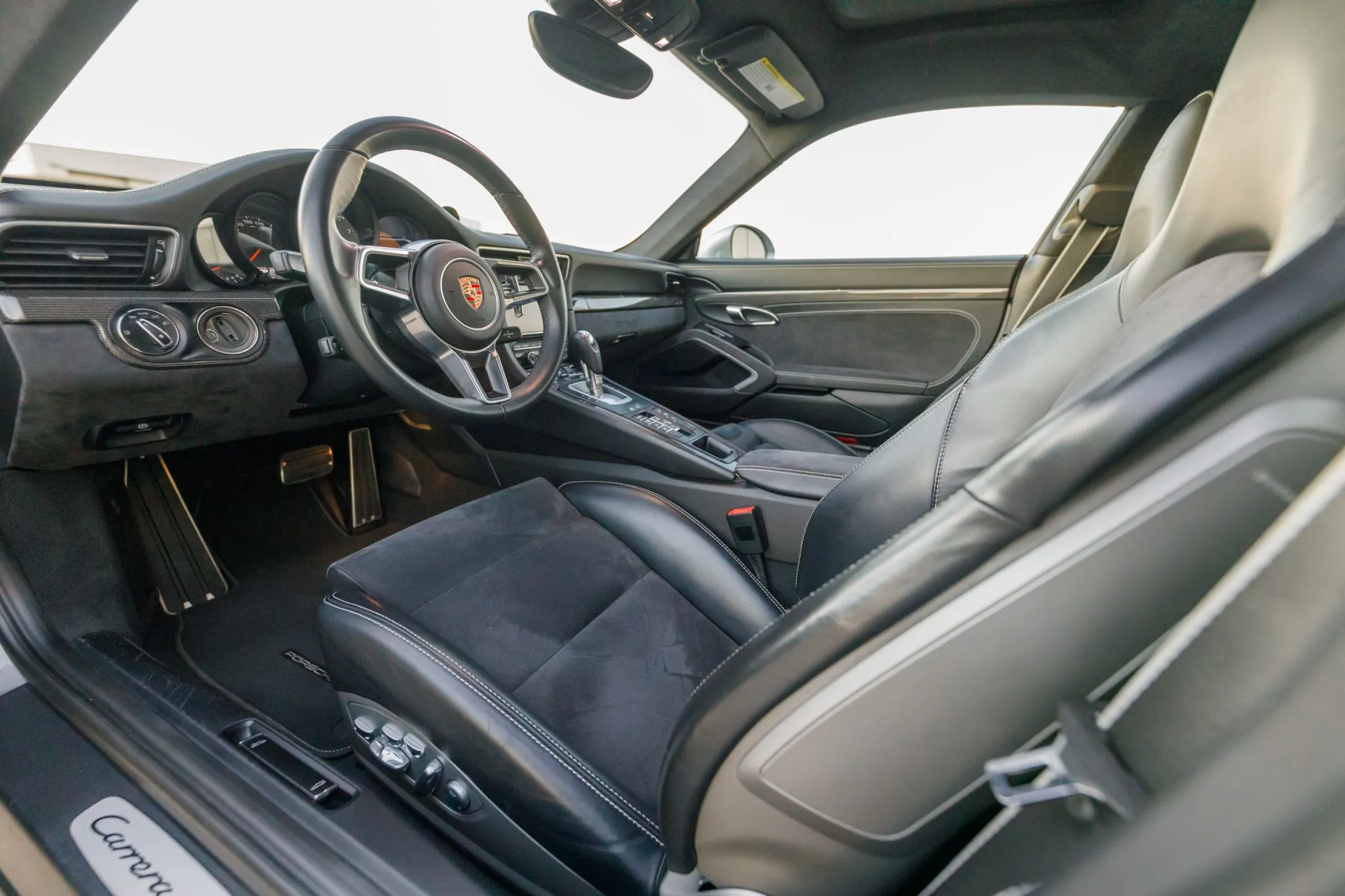 Powered by a 3.8-liter flat-six paired with a seven-speed PDK dual-clutch automatic transaxle, the car is further equipped with black leather and Alcantara upholstery, the Sport Chrono Package, a limited-slip differential, Porsche Torque Vectoring, 20″ Carrera S alloy wheels, PASM sport suspension, a sunroof, a later-model steering wheel, ParkAssist, a speed-activated rear spoiler, heated 18-way adaptive Sport Plus front seats, carbon-fiber interior trim, and dual-zone automatic climate control.