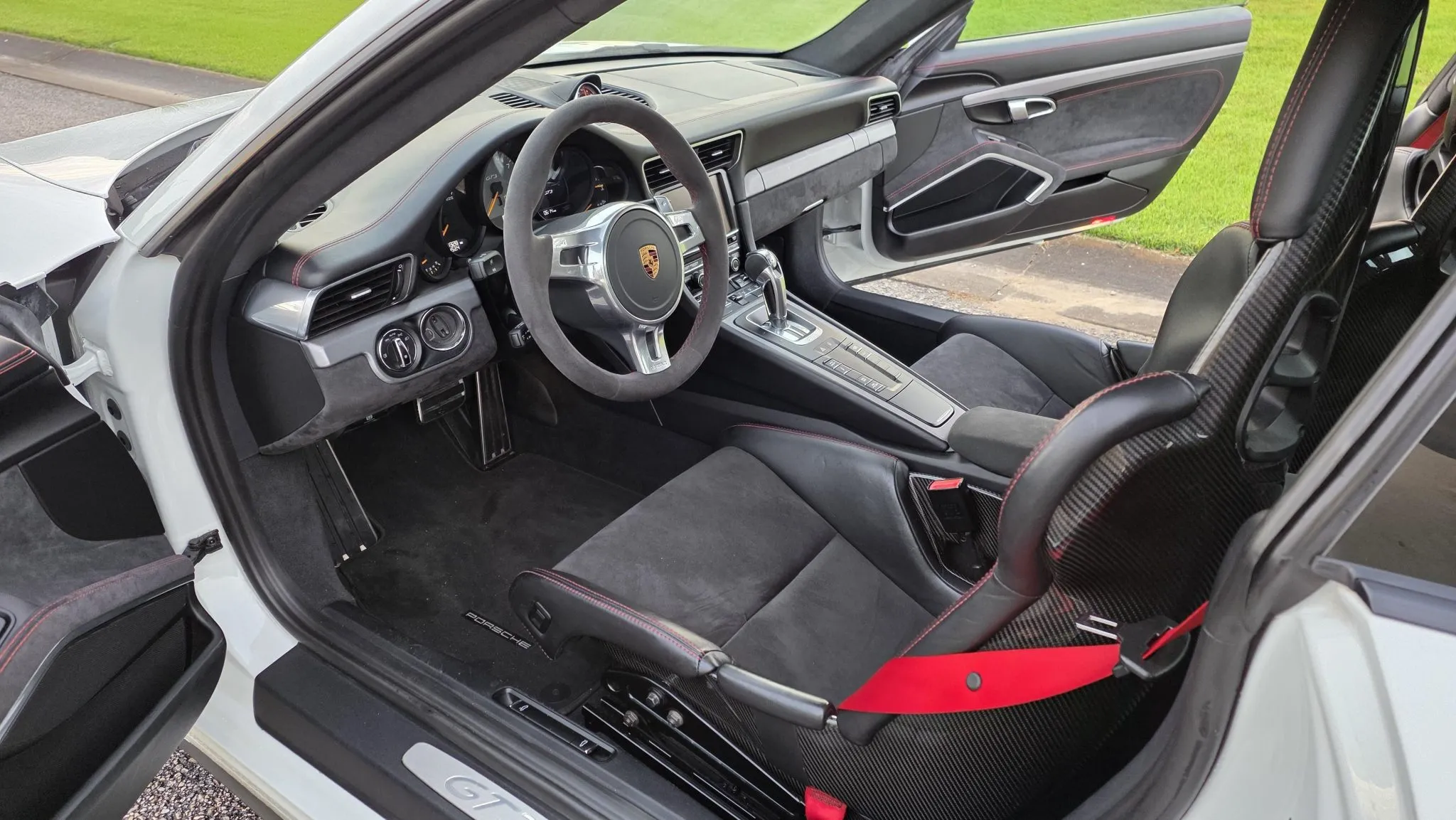 Finished in white over black upholstery, the car is equipped with a seven-speed PDK dual-clutch transaxle, the Sport Chrono Package, 20″ center-lock alloy wheels, a front-axle lift system, bi-xenon headlights, a rear spoiler, carbon-fiber full bucket seats, a roll cage, PCM with navigation, and Porsche Torque Vectoring Plus.