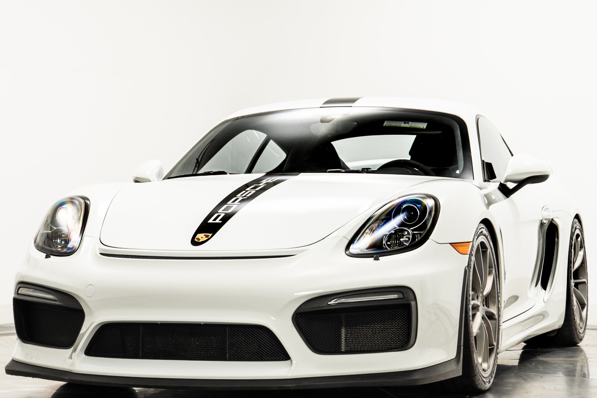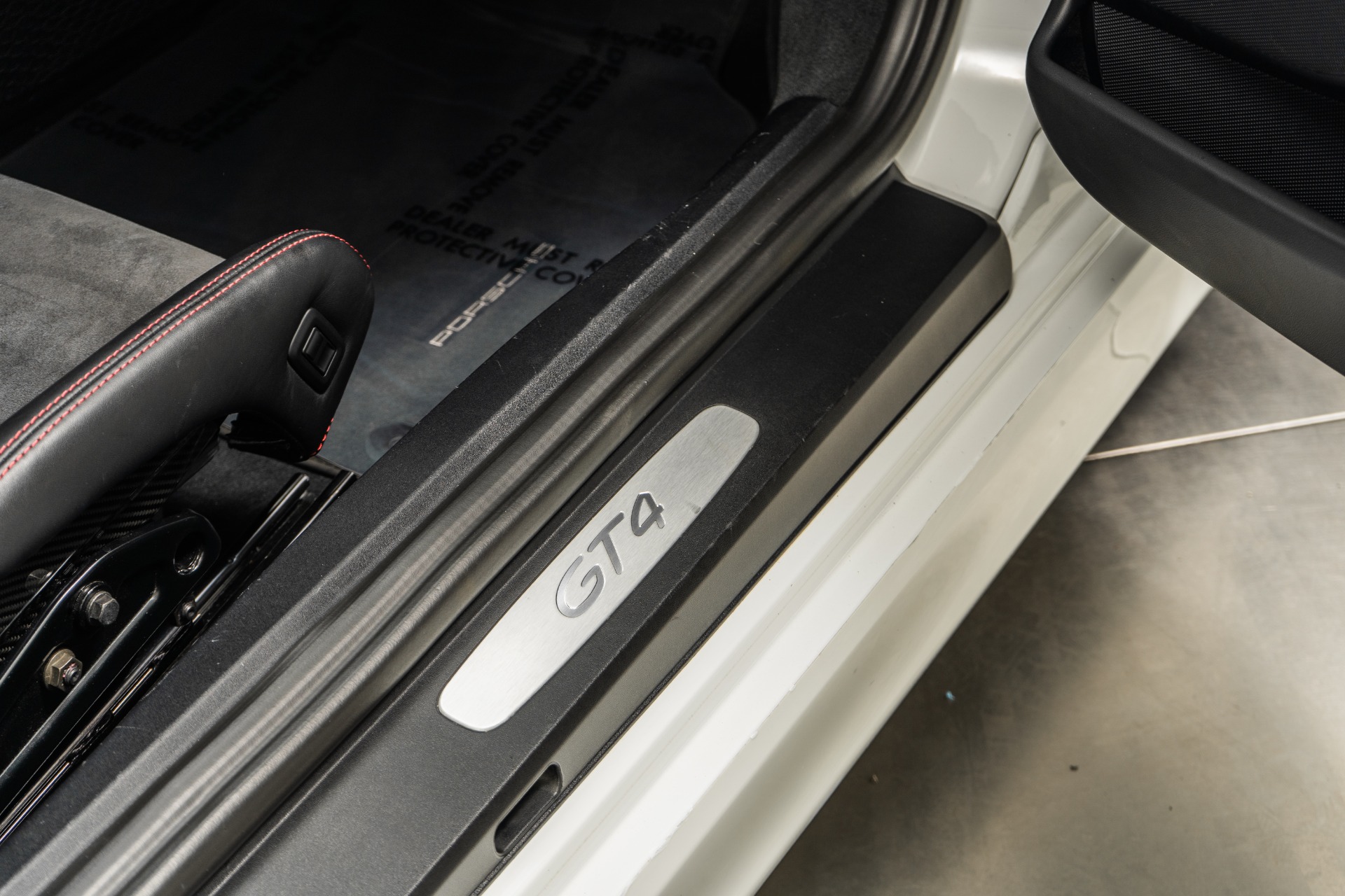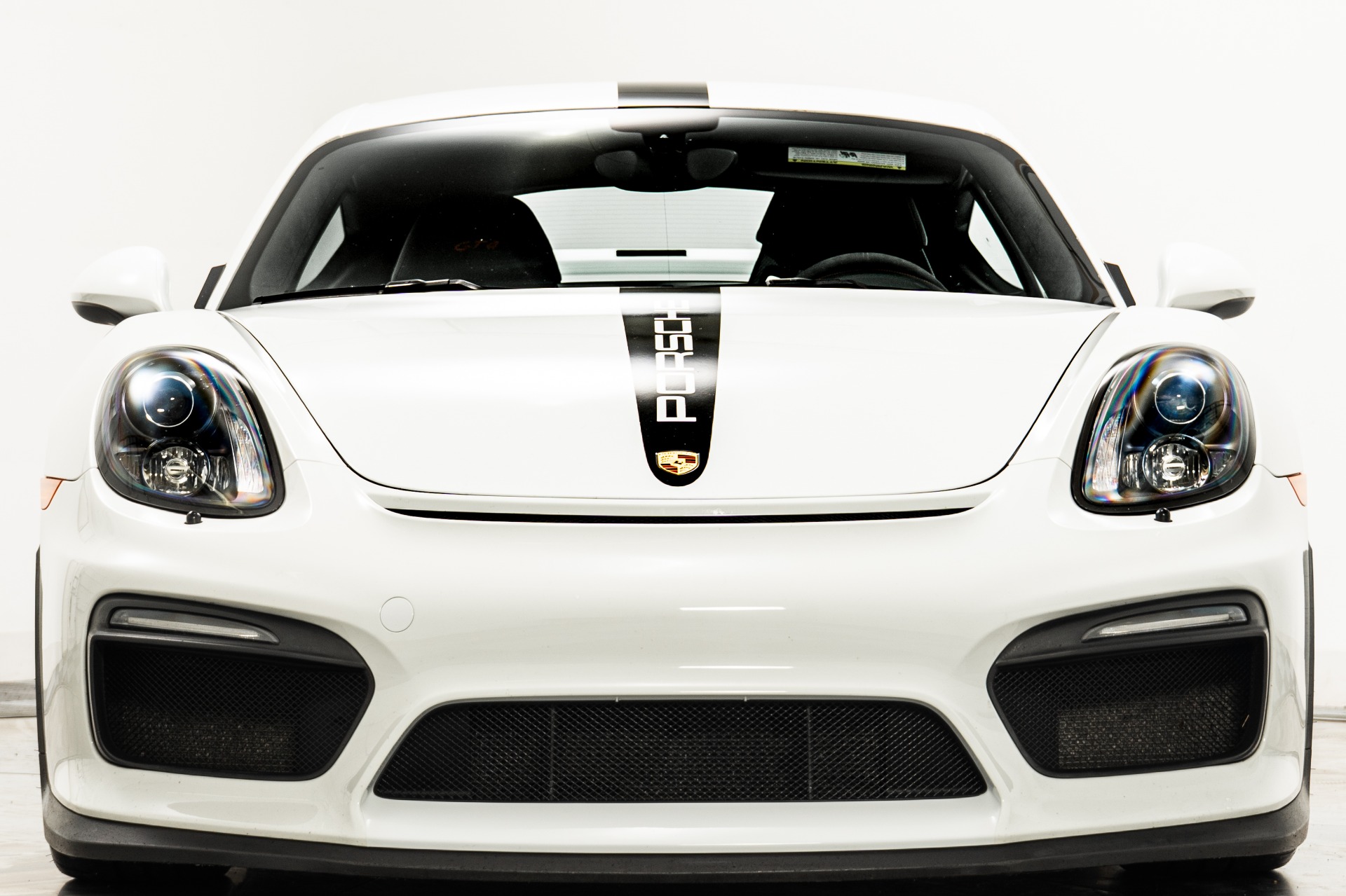 2016 Porsche Cayman GT4 in White over Black interior with only 12,718 miles. This Cayman is loaded with: 3.8 Liter H6 with 385 horsepower, 6 speed manual transmission, 20 inch wheels in satin charcoal, wing supports in black, bixenon headlamps with dynamic lighting, leather interior in Black with Guards Red stitching, carbon fiber racing bucket seats, Porsche PCM with navigation, satellite radio, telephone module, dual zone climate control, Sport Chrono package, brushed aluminum interior trim, Guards Red seat belts, floor mats, navigation, extended range fuel tank, floor mats and much more.