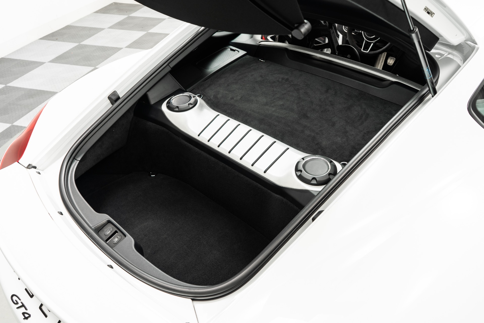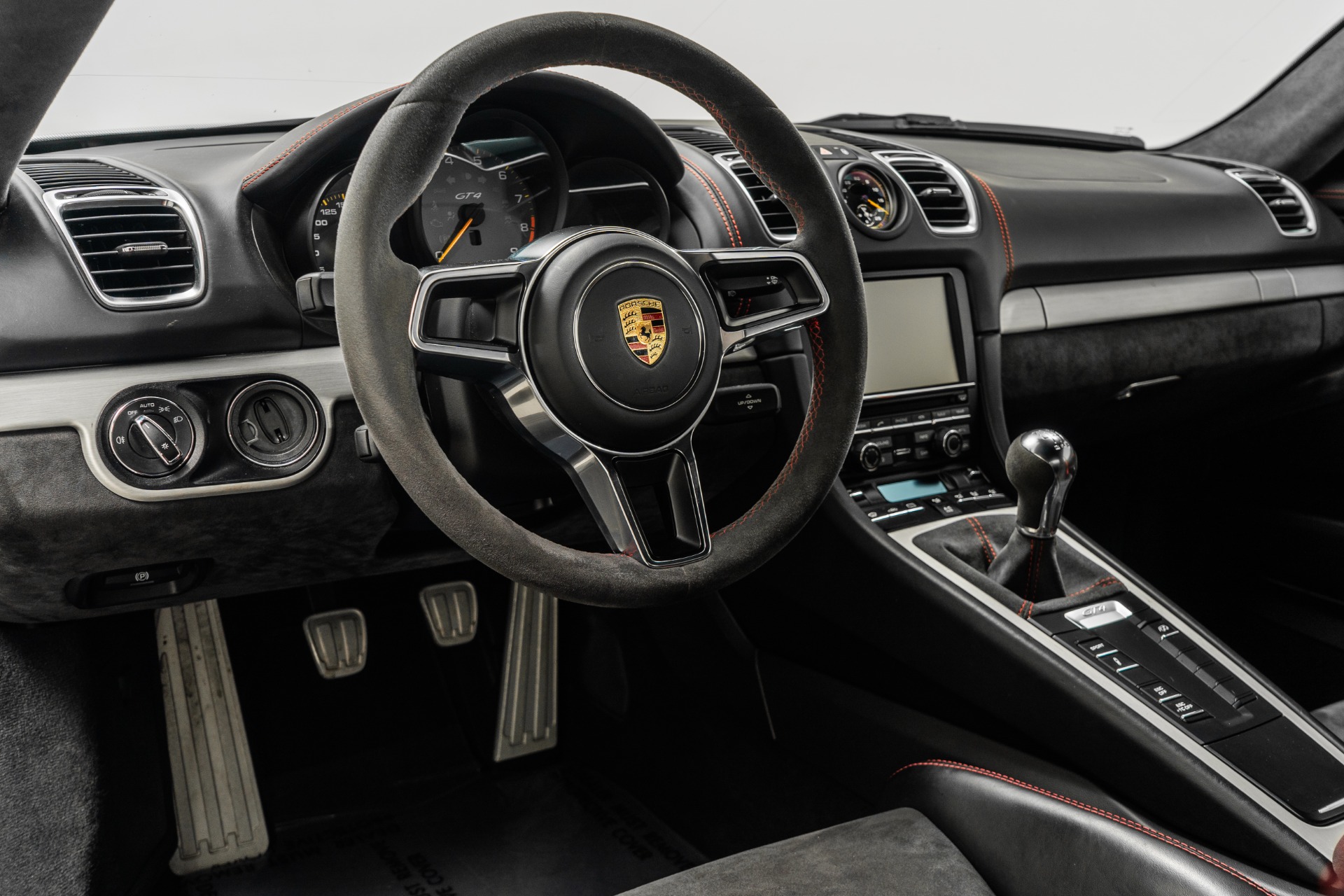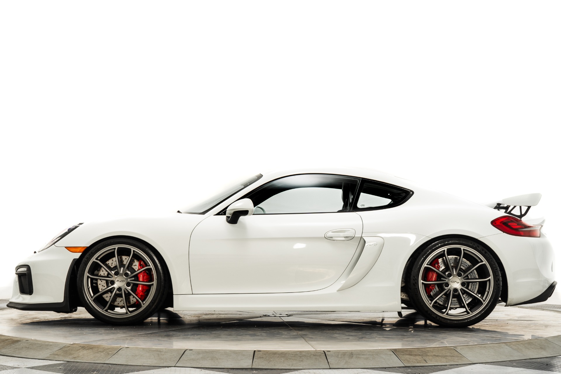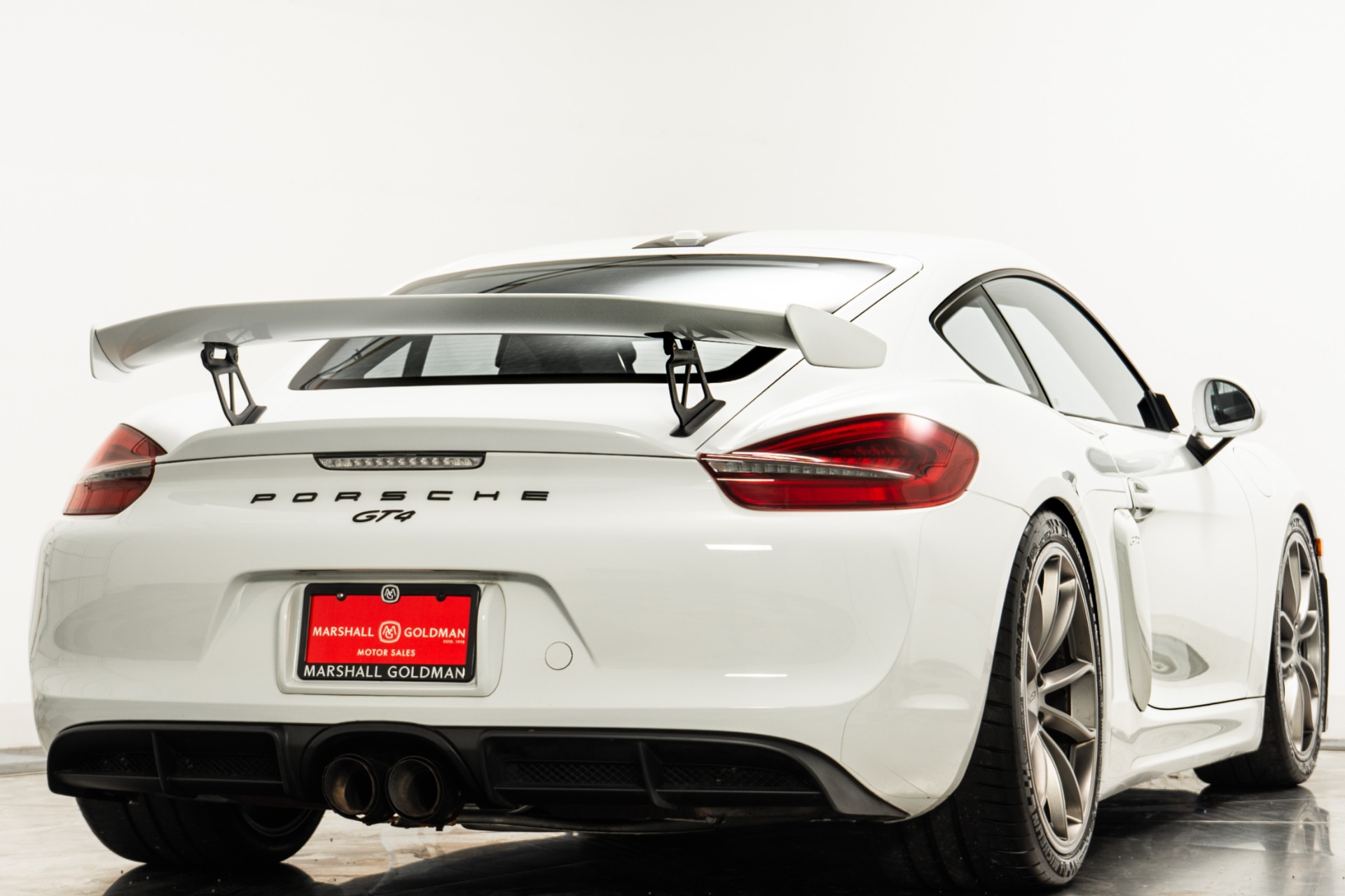 2016 Porsche Cayman GT4 in White over Black interior with only 12,718 miles. This Cayman is loaded with: 3.8 Liter H6 with 385 horsepower, 6 speed manual transmission, 20 inch wheels in satin charcoal, wing supports in black, bixenon headlamps with dynamic lighting, leather interior in Black with Guards Red stitching, carbon fiber racing bucket seats, Porsche PCM with navigation, satellite radio, telephone module, dual zone climate control, Sport Chrono package, brushed aluminum interior trim, Guards Red seat belts, floor mats, navigation, extended range fuel tank, floor mats and much more.
