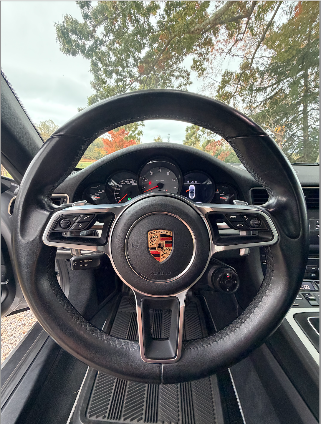 The car is further equipped with 20″ Carrera Sport alloy wheels, a black targa top, LED headlights with PDLS+, Power Steering Plus, heated and ventilated power-adjustable front seats, Lane Change Assist, a back-up camera, parking sensors, a Bose sound system, cruise control, and dual-zone automatic climate control.