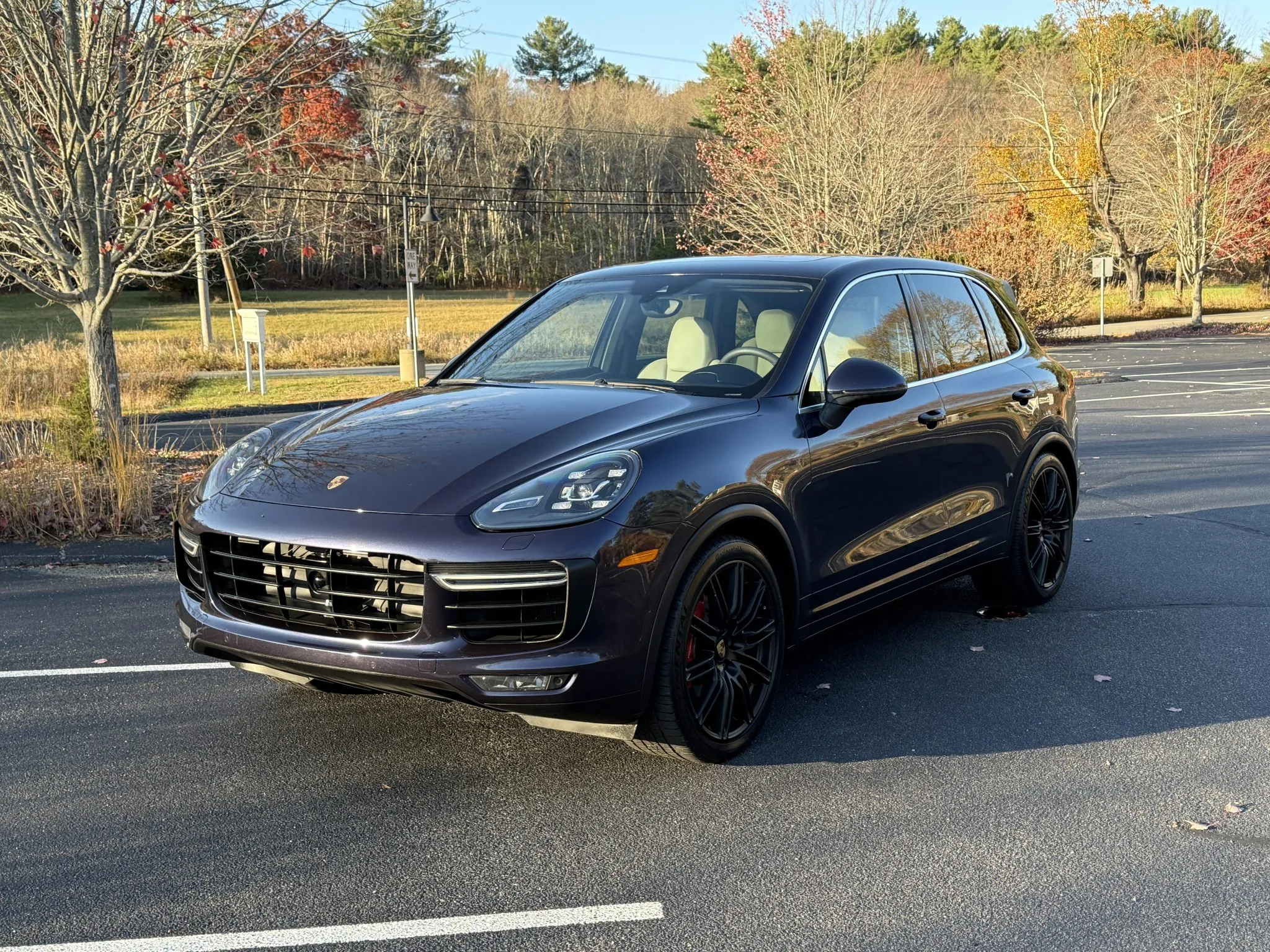 This 2017 Porsche Cayenne Turbo is finished in Purpurite Metallic over Cream and Black leather and was ordered with the Premium Package Plus, PDCC, PTV Plus, adaptive cruise control, and a heated Alcantara steering wheel.
