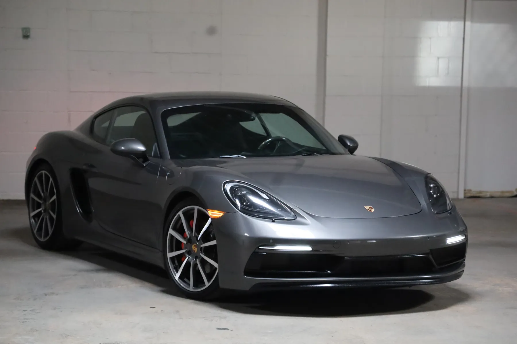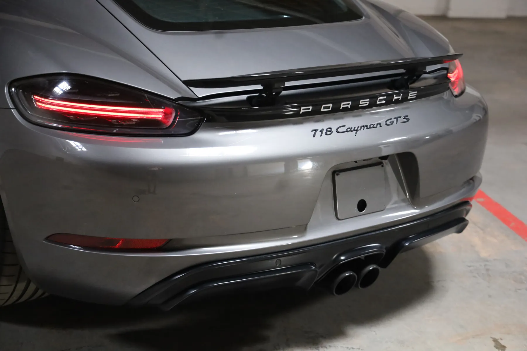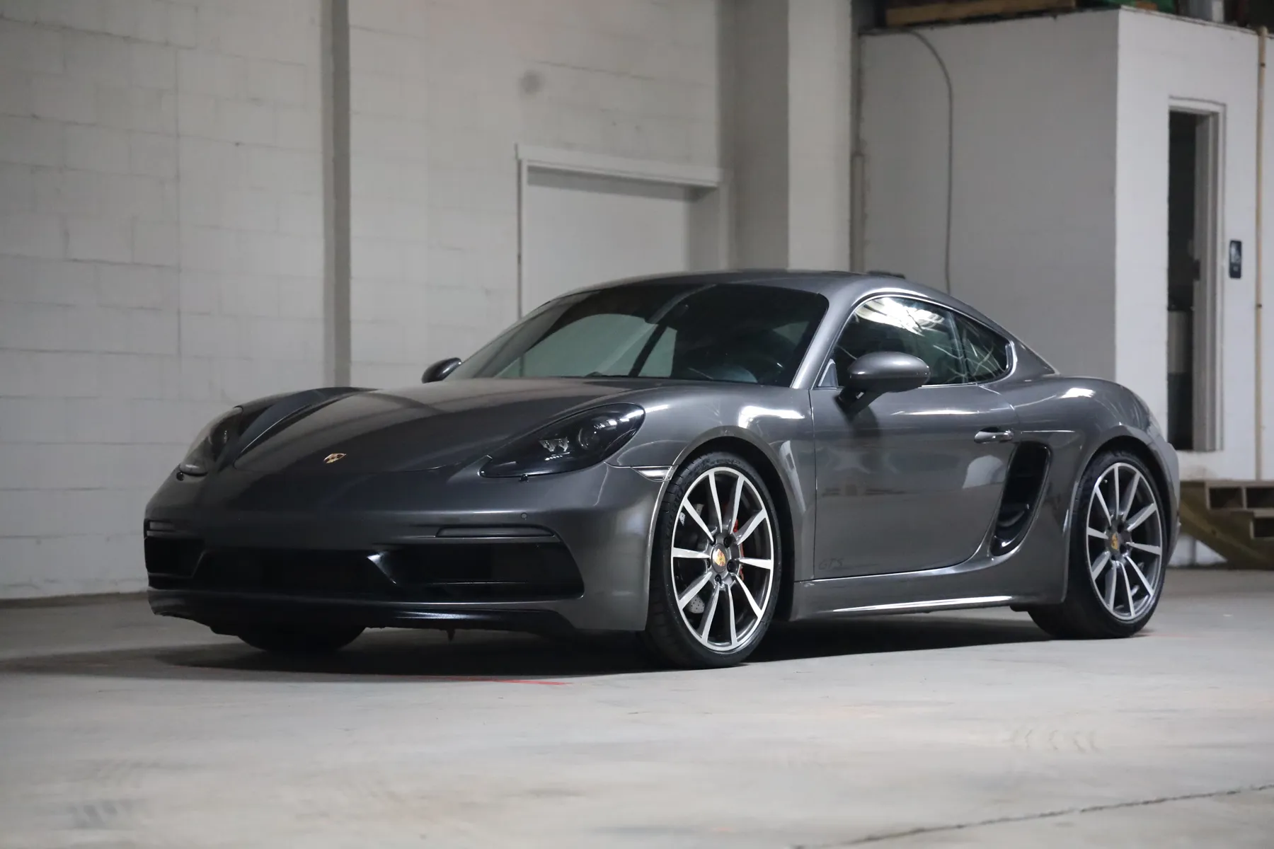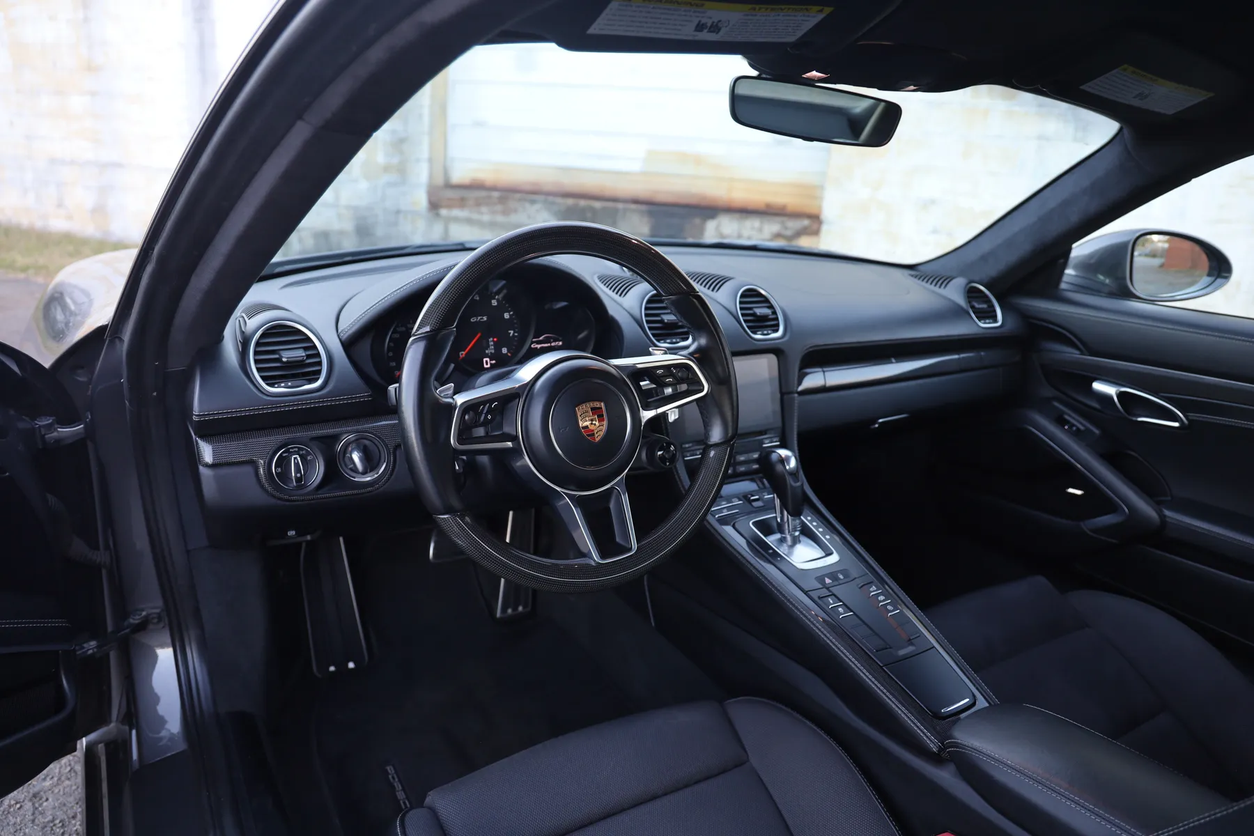 This 2018 Porsche 718 Cayman GTS was specified in Agate Gray Metallic over a Black and Dark Silver leather interior with Sport-Tex accents and carbon-fiber trim.