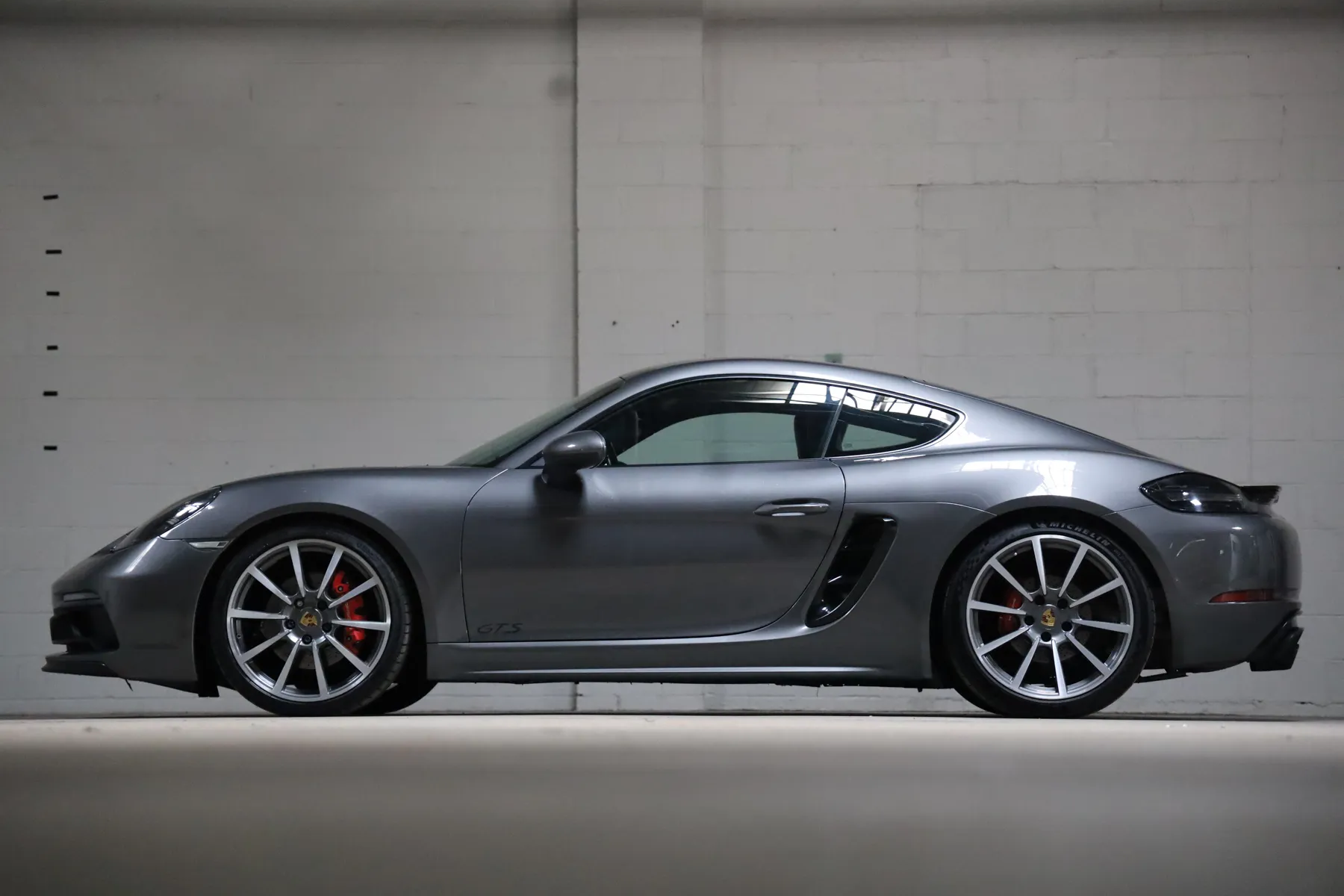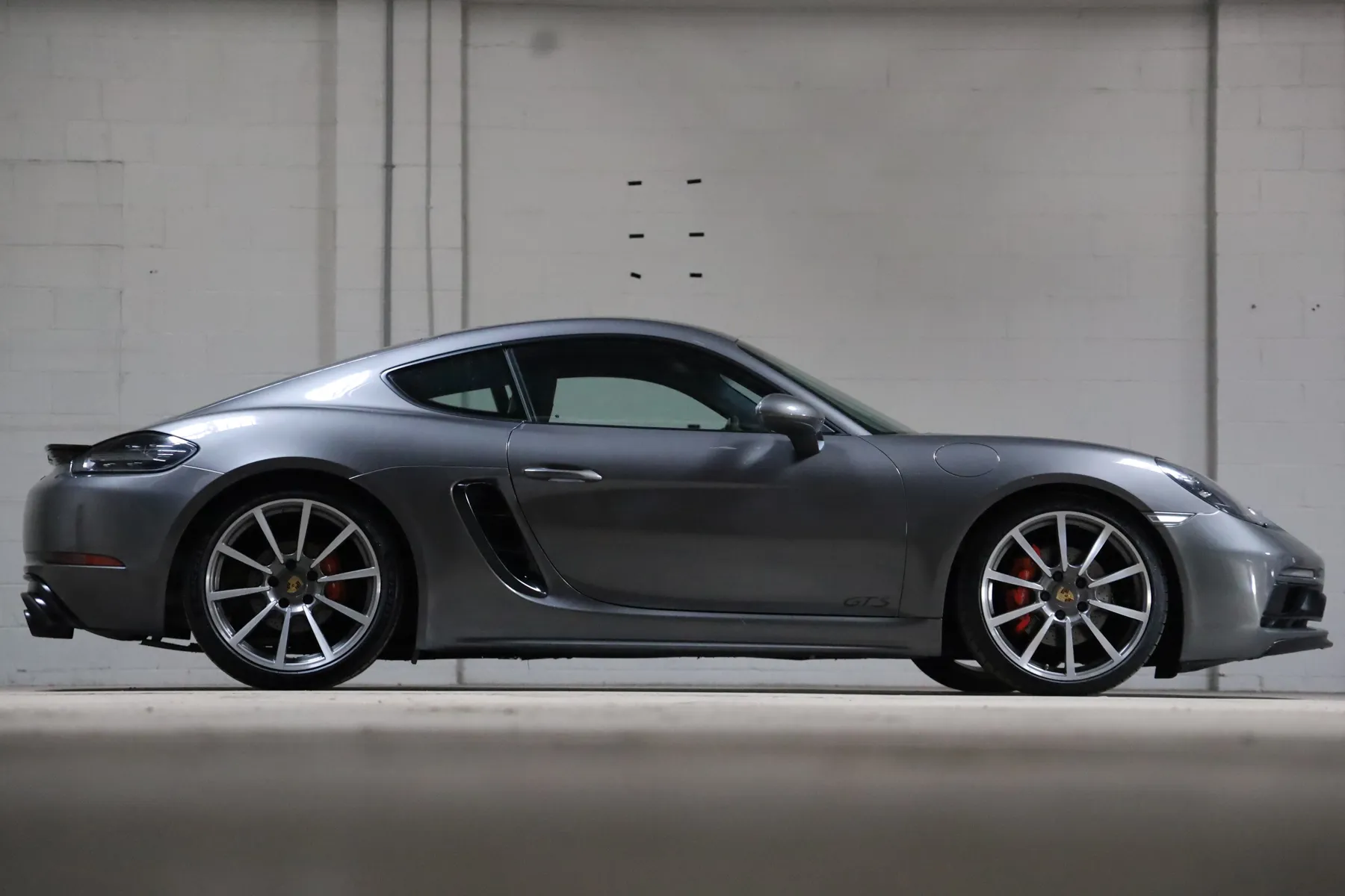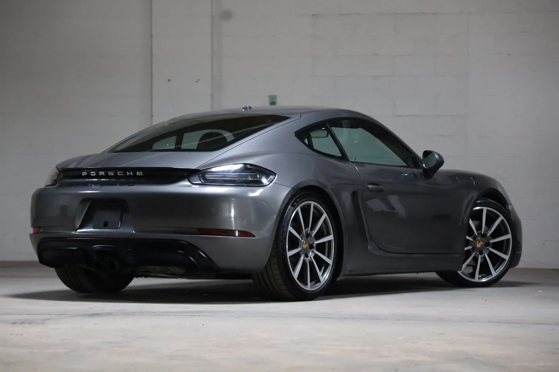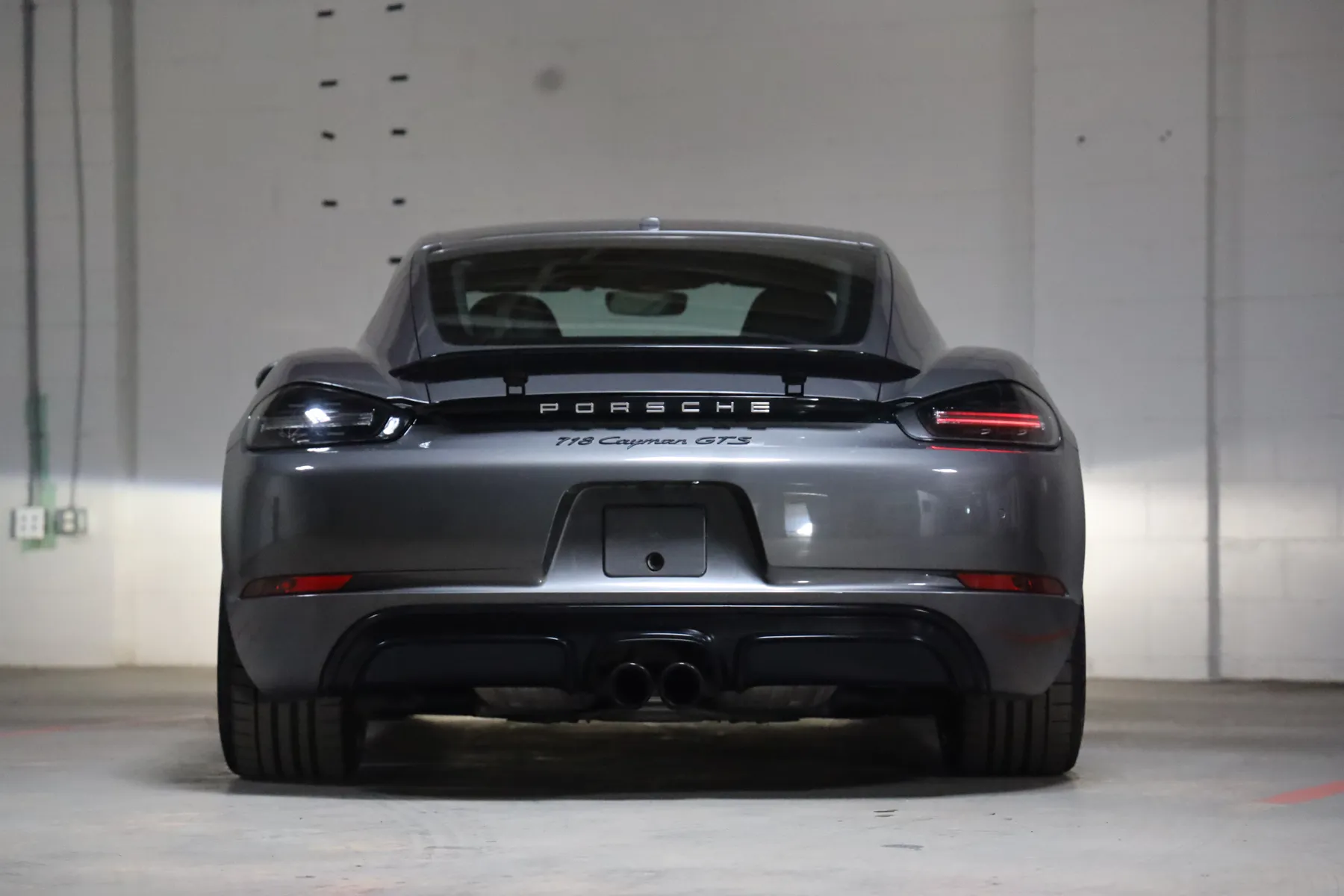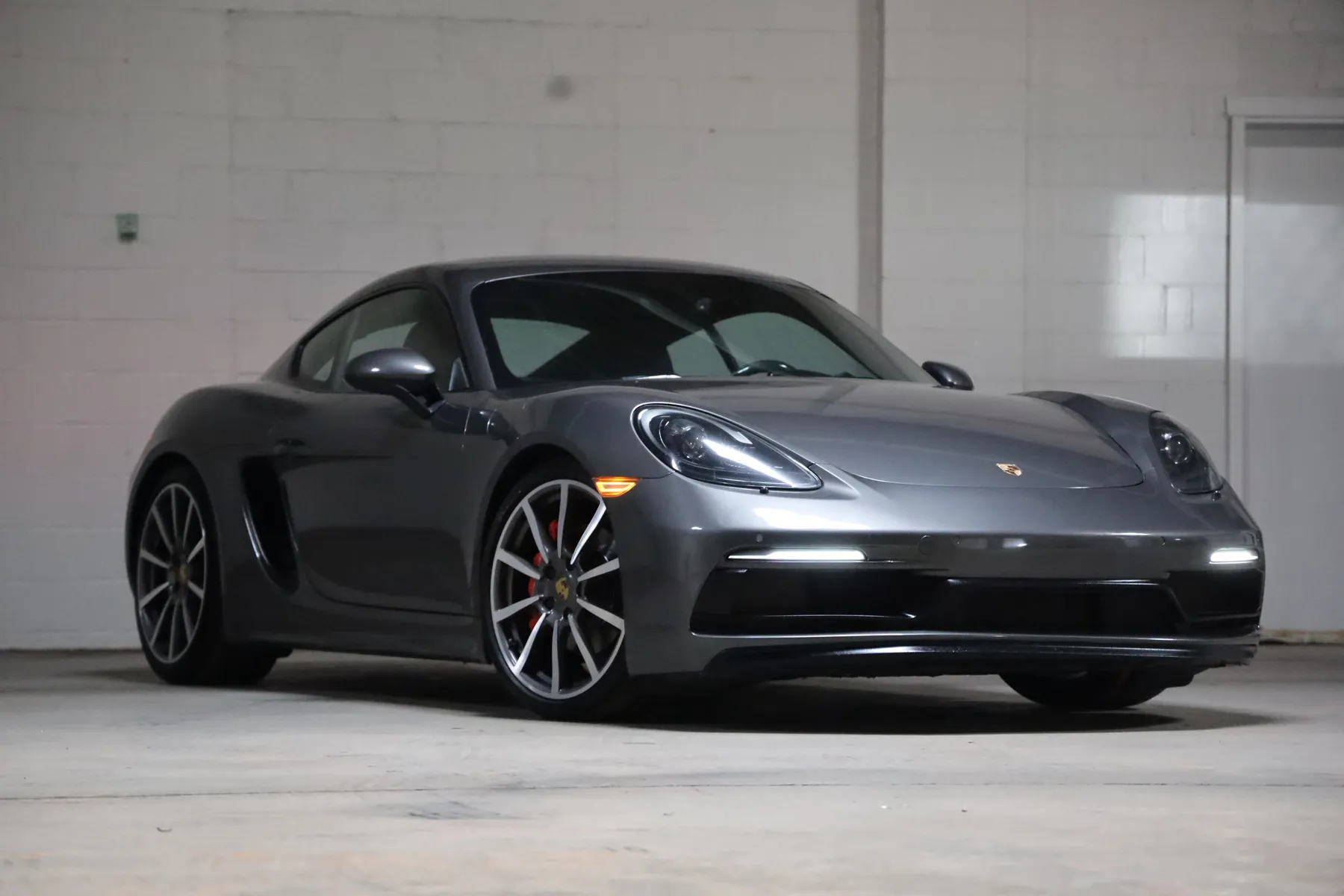 This 2018 Porsche 718 Cayman GTS was specified in Agate Gray Metallic over a Black and Dark Silver leather interior with Sport-Tex accents and carbon-fiber trim.