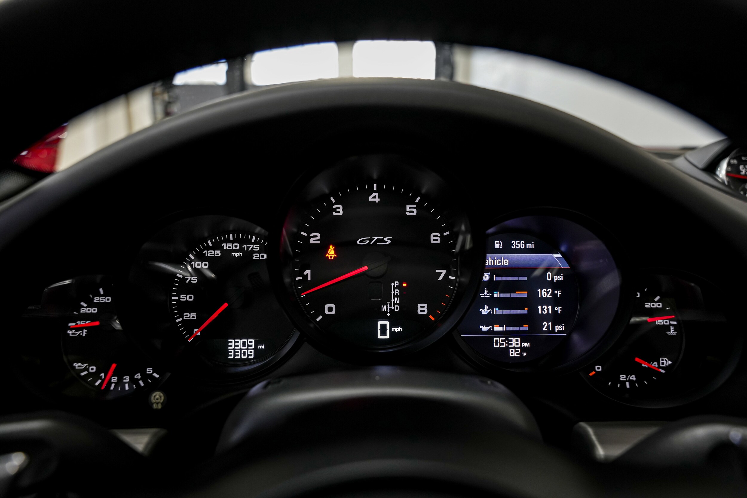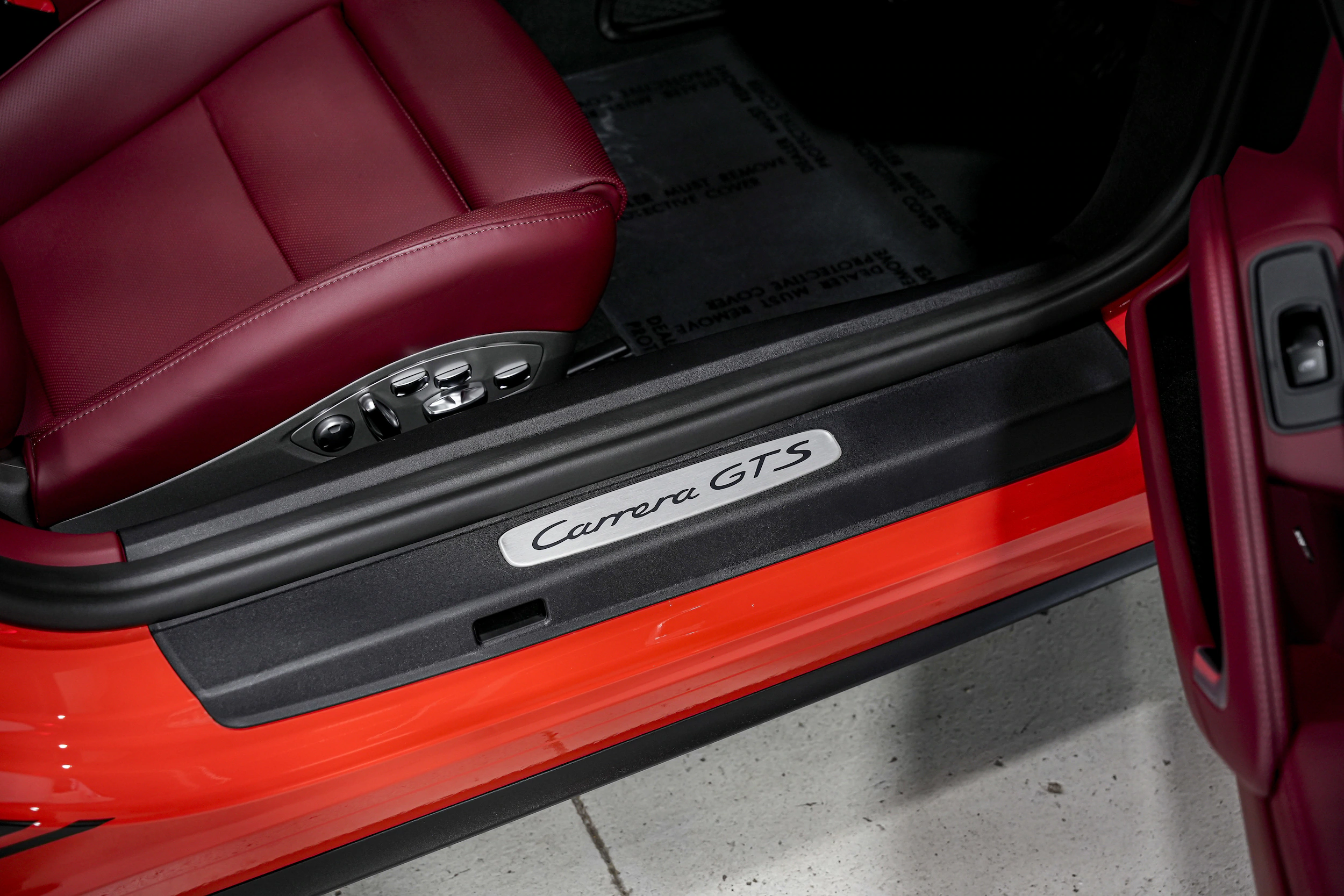 Inside, the two-tone Black and Bordeaux Red leather interior replaces the typical Alcantara found in many GTS models, lending a more luxurious feel. The cabin features a GT Sport steering wheel, carbon fiber gear selector, the Brushed Aluminum Interior Package, and the Bose Surround Sound System. Additional amenities include Voice Control, power-folding exterior mirrors, and a luggage net in the passenger footwell. The Premium Package Plus adds 18-way Adaptive Sport Seats Plus with memory functions, heated and ventilated front seats, Porsche Entry & Drive, auto-dimming mirrors, and the Light Design Package.