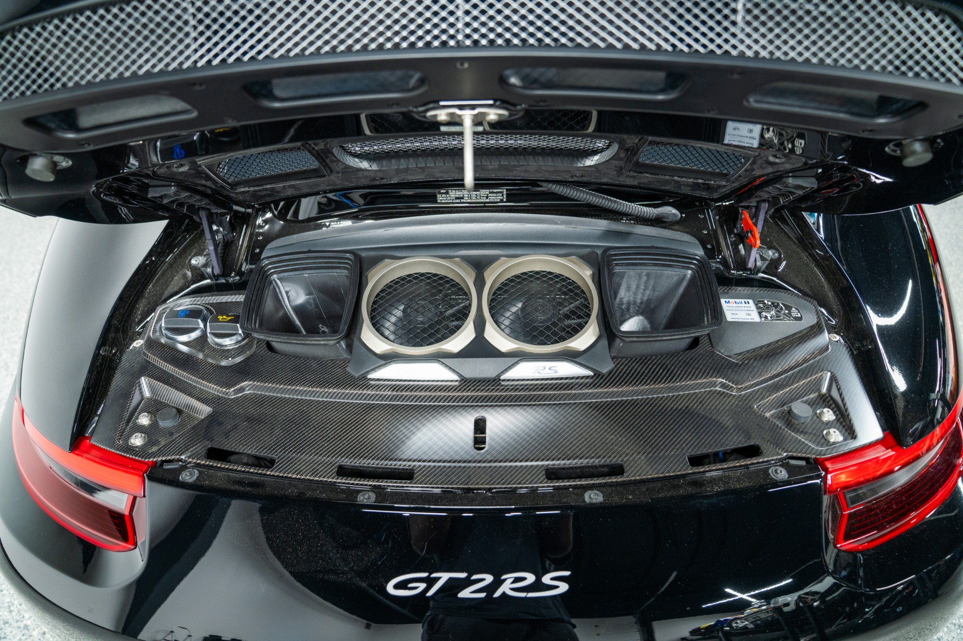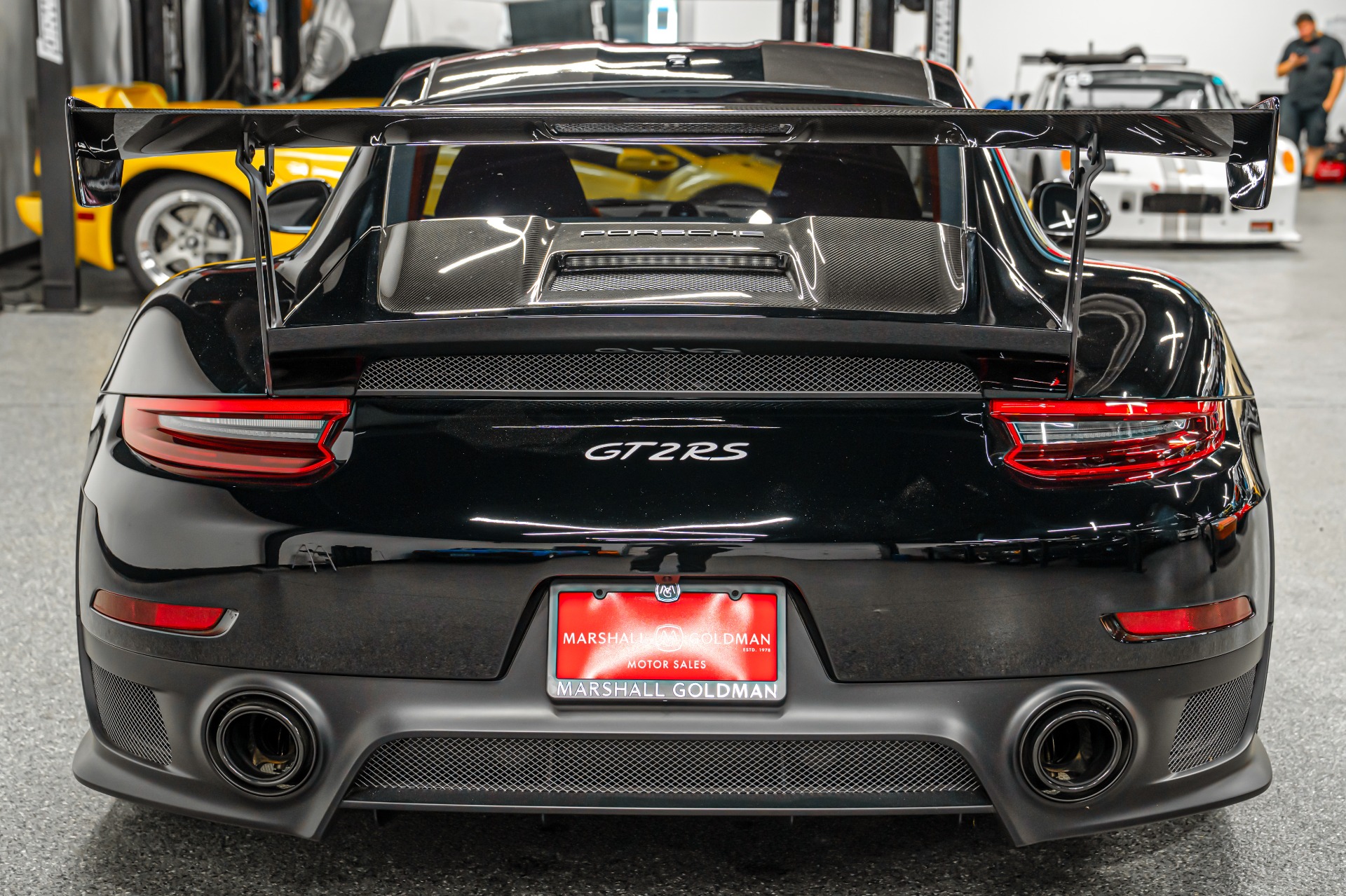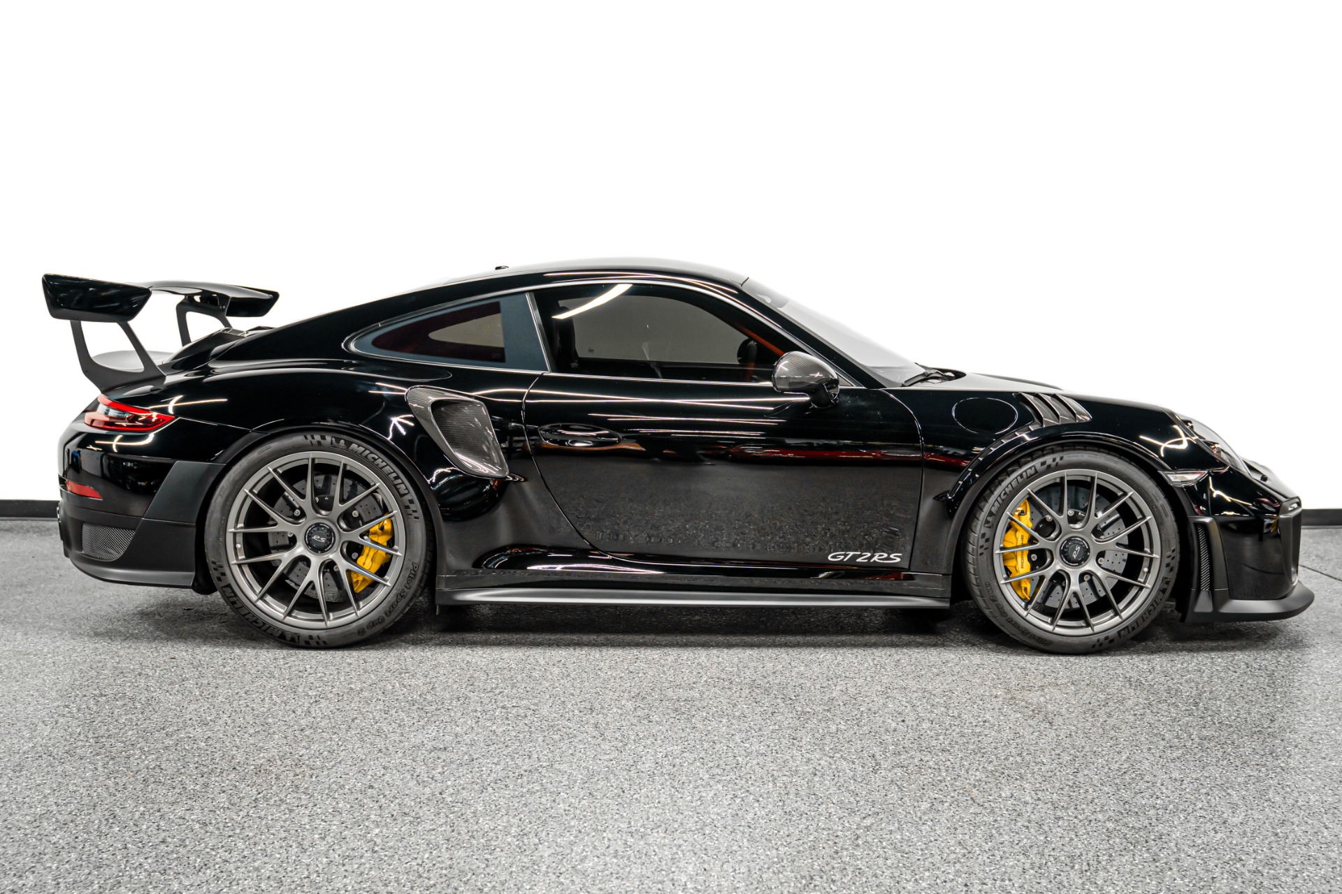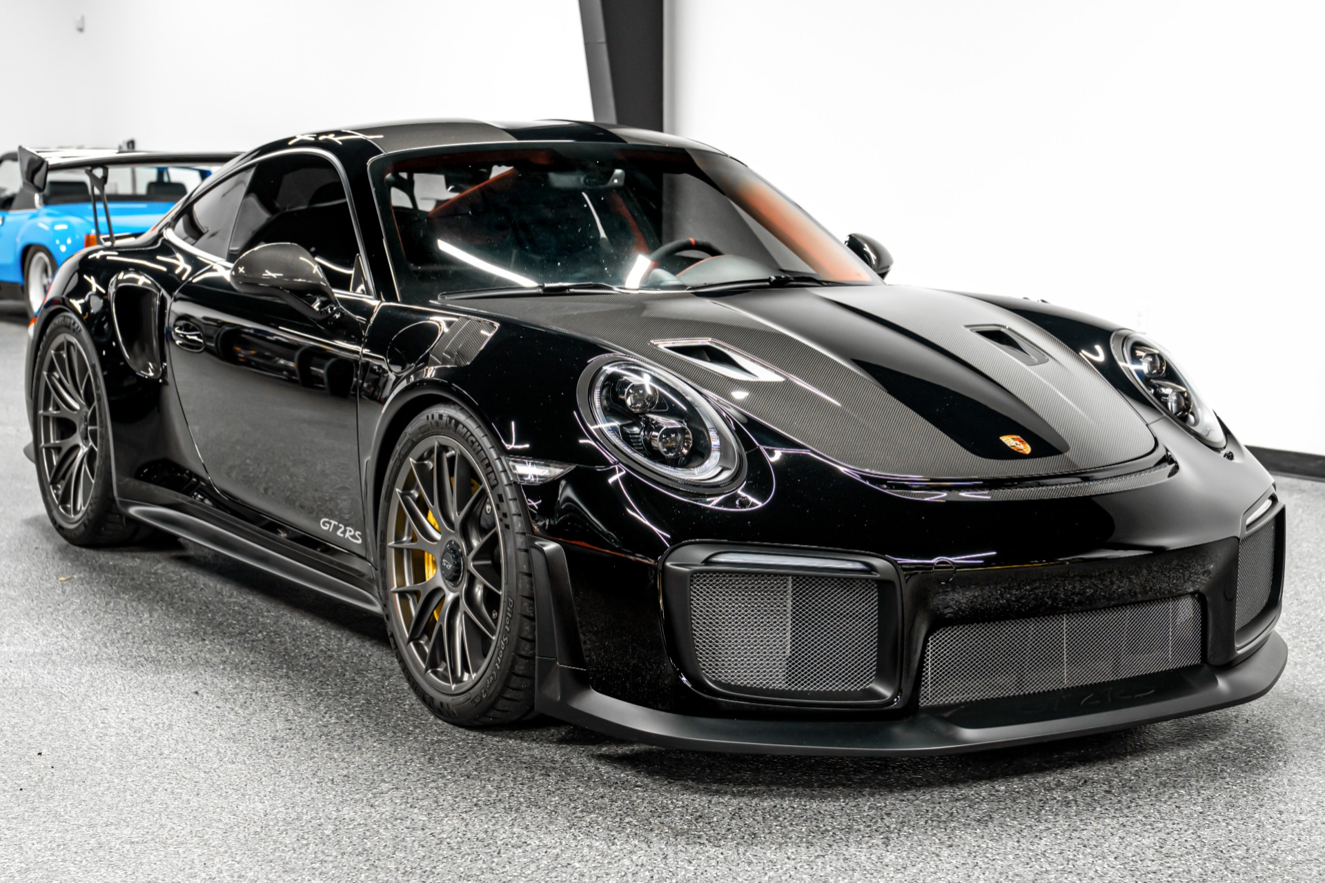 2018 Porsche 911 GT2 RS in Black with Black leather and Alcantara interior and only 1,101 miles. This GT2 RS is loaded with: 3.8 Liter twin turbo flat six with 700 horsepower, 7 speed PDK transmission, 20/21 inch magnesium wheels in satin black, carbon ceramic brakes, Weissach package, front axle lift, LED headlamps in black with dynamic lighting, carbon fiber mirror housings, carbon fiber window triangle trims, carbon fiber fender vents, fire extinguisher, headlight washers in gloss black, auto dimming mirrors, leather interior in Black with Black and Red Alcantara, Porsche PCM with navigation, carbon fiber bucket seats, Bose audio system, seat belts in Guards Red, Sport Chrono package, Alcantara sunvisors, light design package, illuminated carbon fiber sill plates, steering wheel with red 12 o’clock marker, extended range fuel tank and much more.