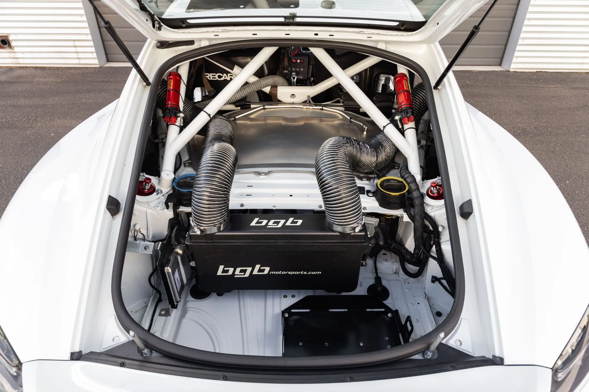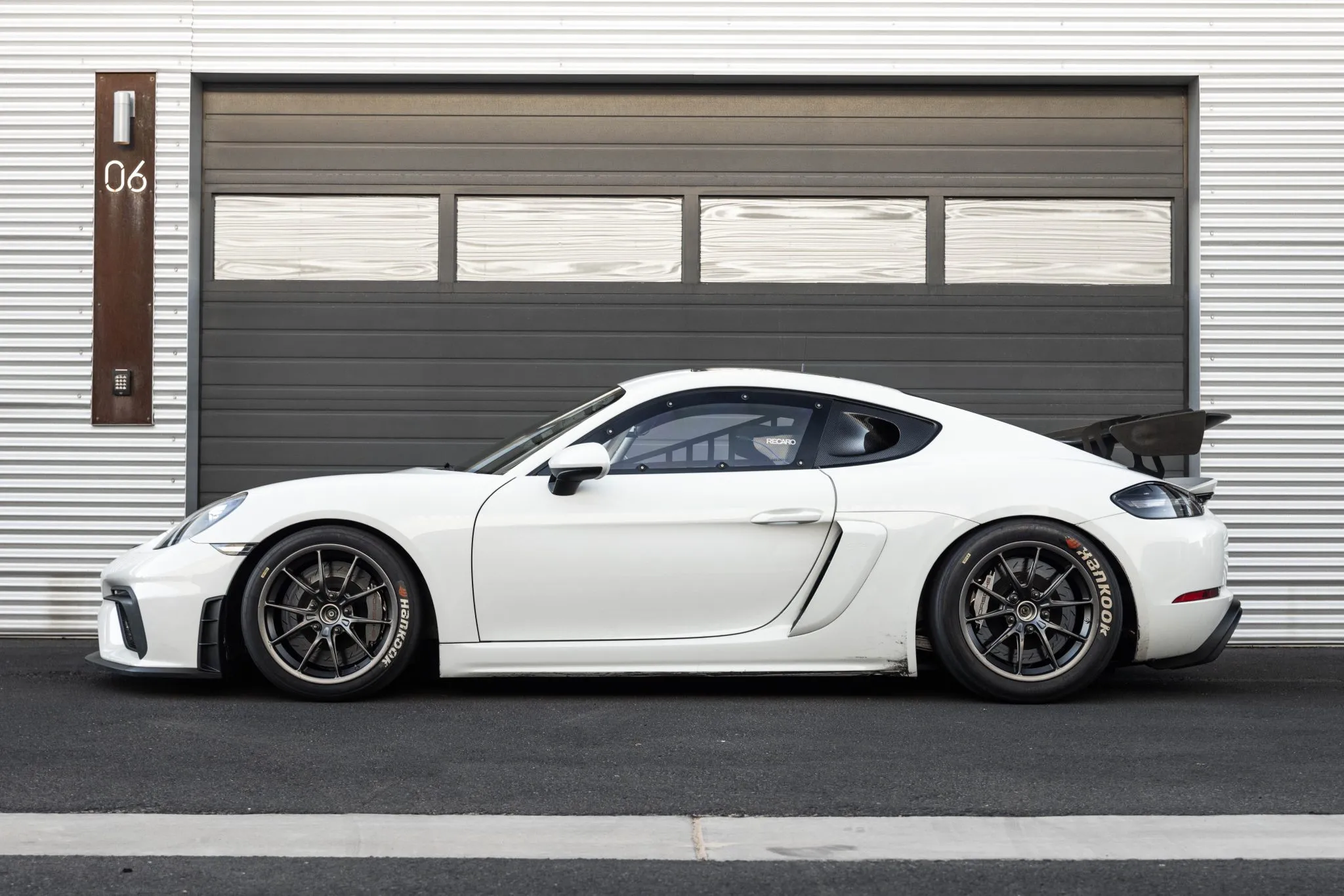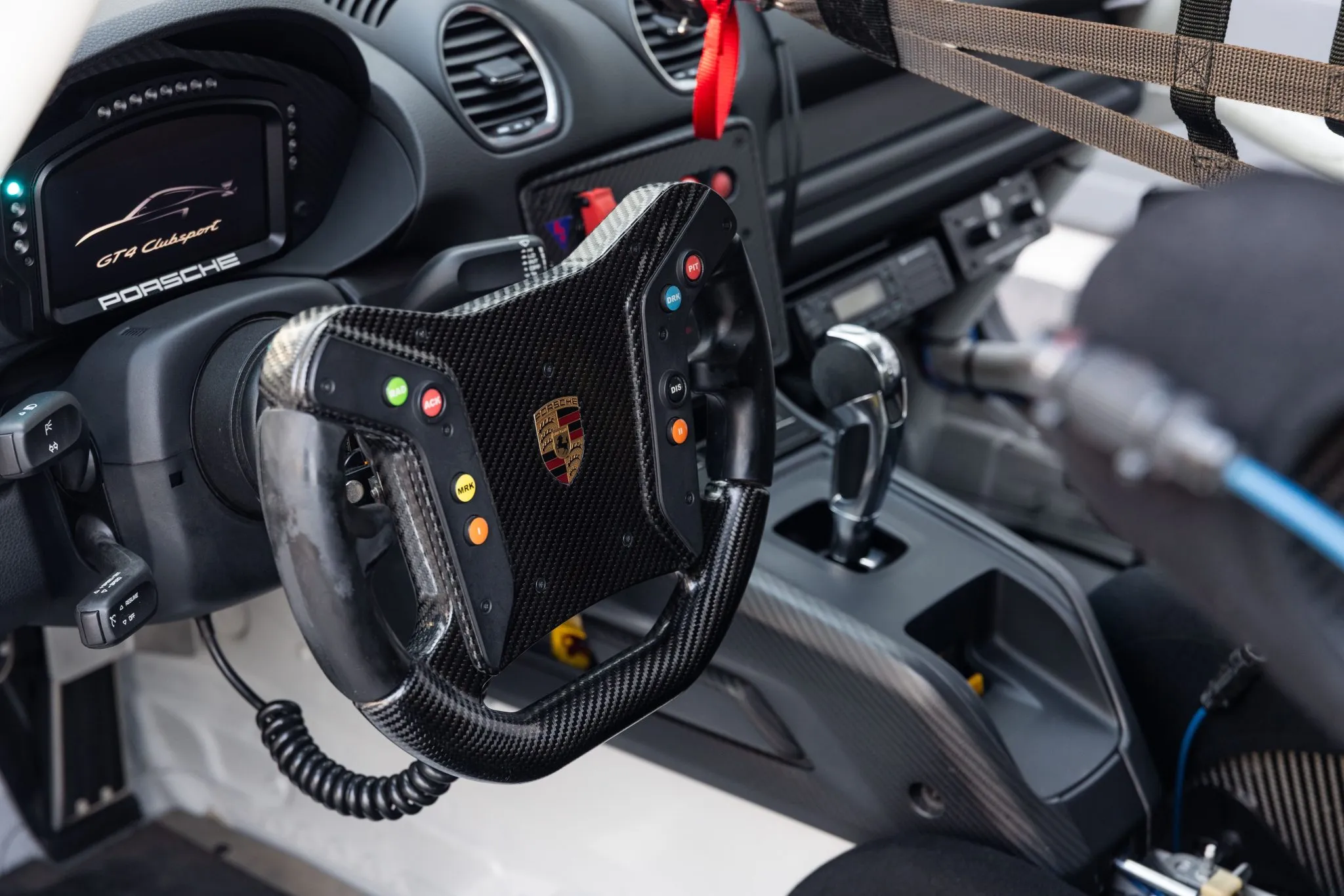 The car is equipped with a six-speed PDK dual-clutch automatic transaxle, a composite rear wing, a roof escape hatch, an air-jack system, anti-lock brakes, 18″ wheels, Hankook racing slicks, adjustable remote-reservoir suspension, racing bucket seats, multi-point harnesses, a roll cage, window nets, a fire-suppression system, and track-oriented electronics including a data logger, a camera system, a lap timer, and radio gear.