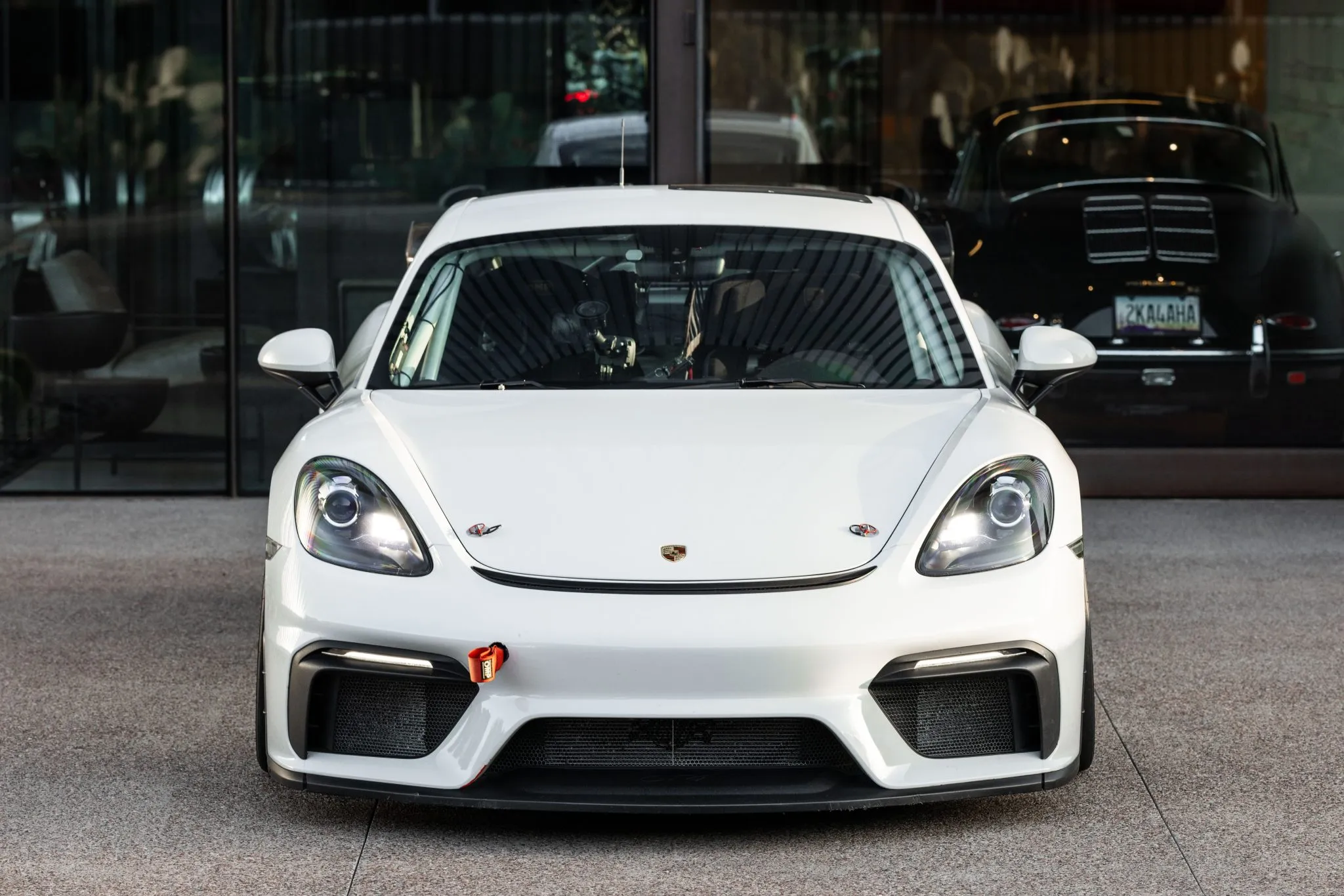 This 2020 Porsche 718 Cayman GT4 is a track-only Trackday model whose 3.8-liter flat-six breathes through a BGB Motorsports intake system with carbon-fiber quarter-window vents.