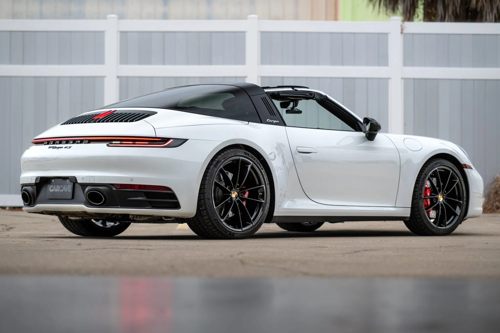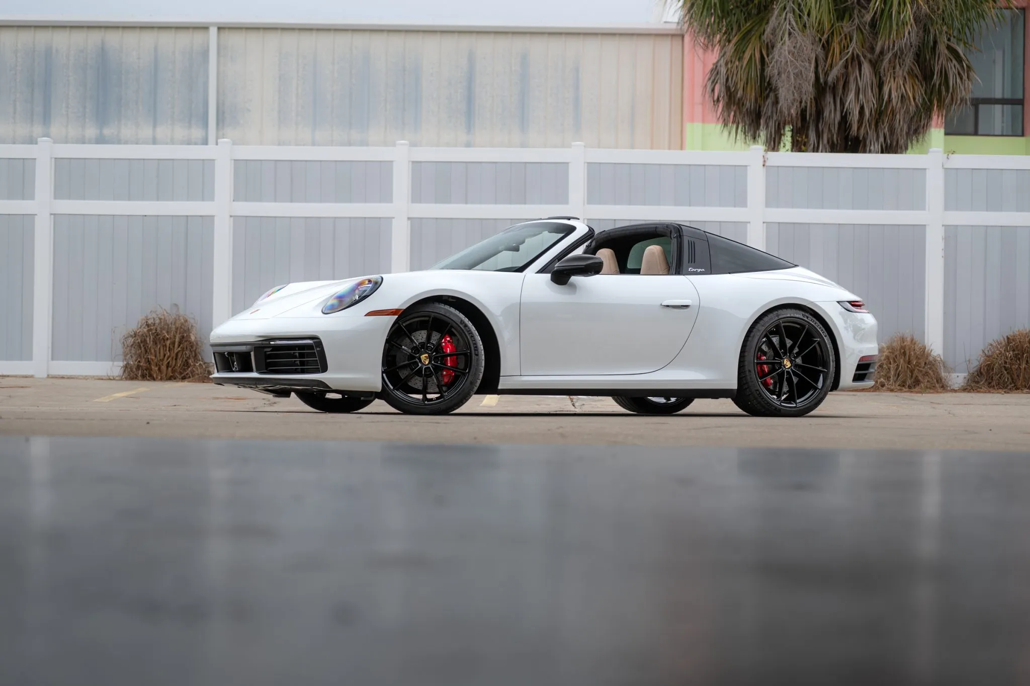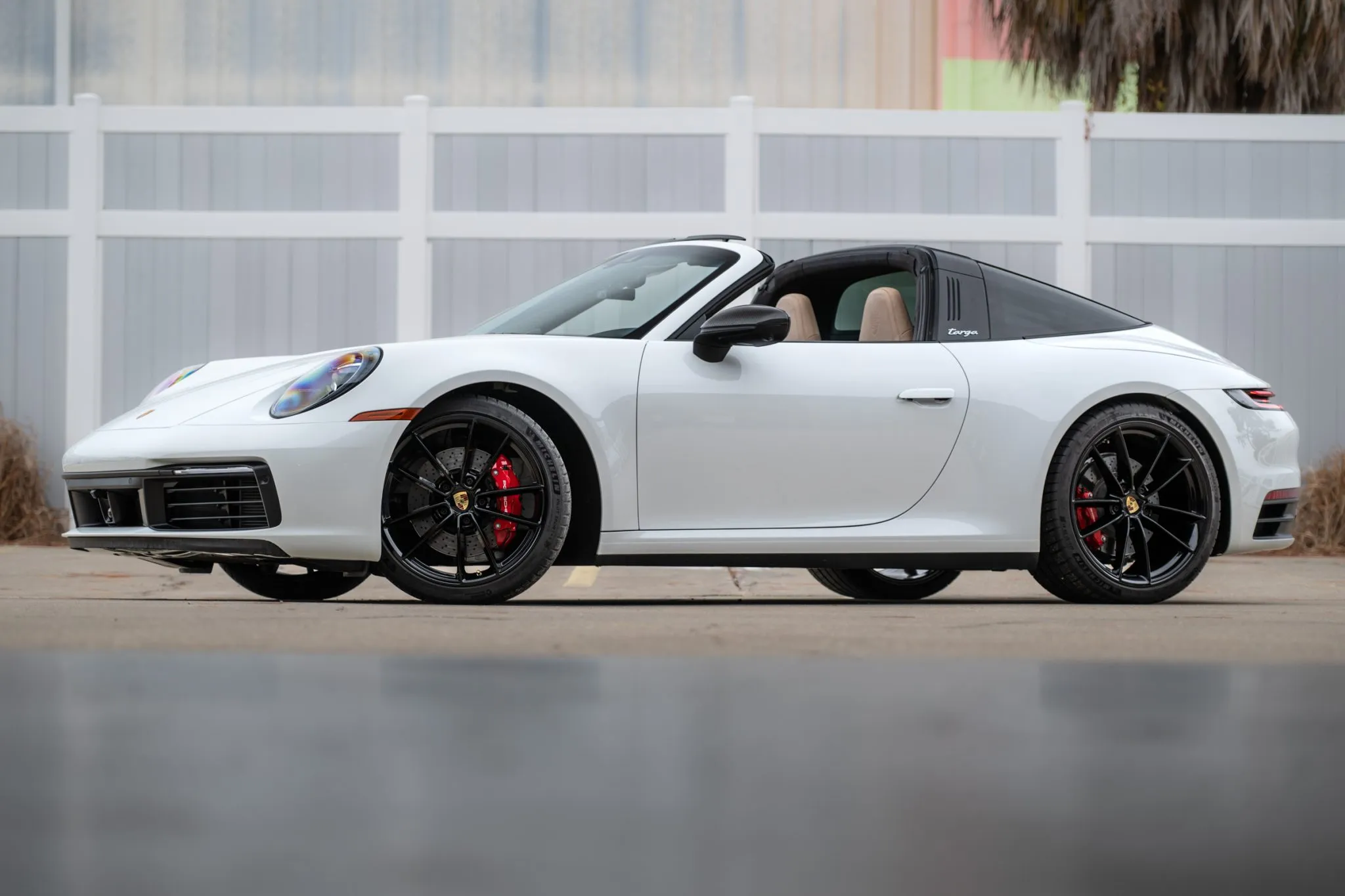 This 2021 Porsche 911 Targa 4S has 11k miles through the owner’s purchase in 2024, and it was optioned from the factory with the Premium, Sport, and Sport Chrono packages. It is finished in White over black and Mojave Beige leather and is powered by a twin-turbocharged 3.0L flat-six that drives all four wheels through an eight-speed PDK dual-clutch automatic transaxle.