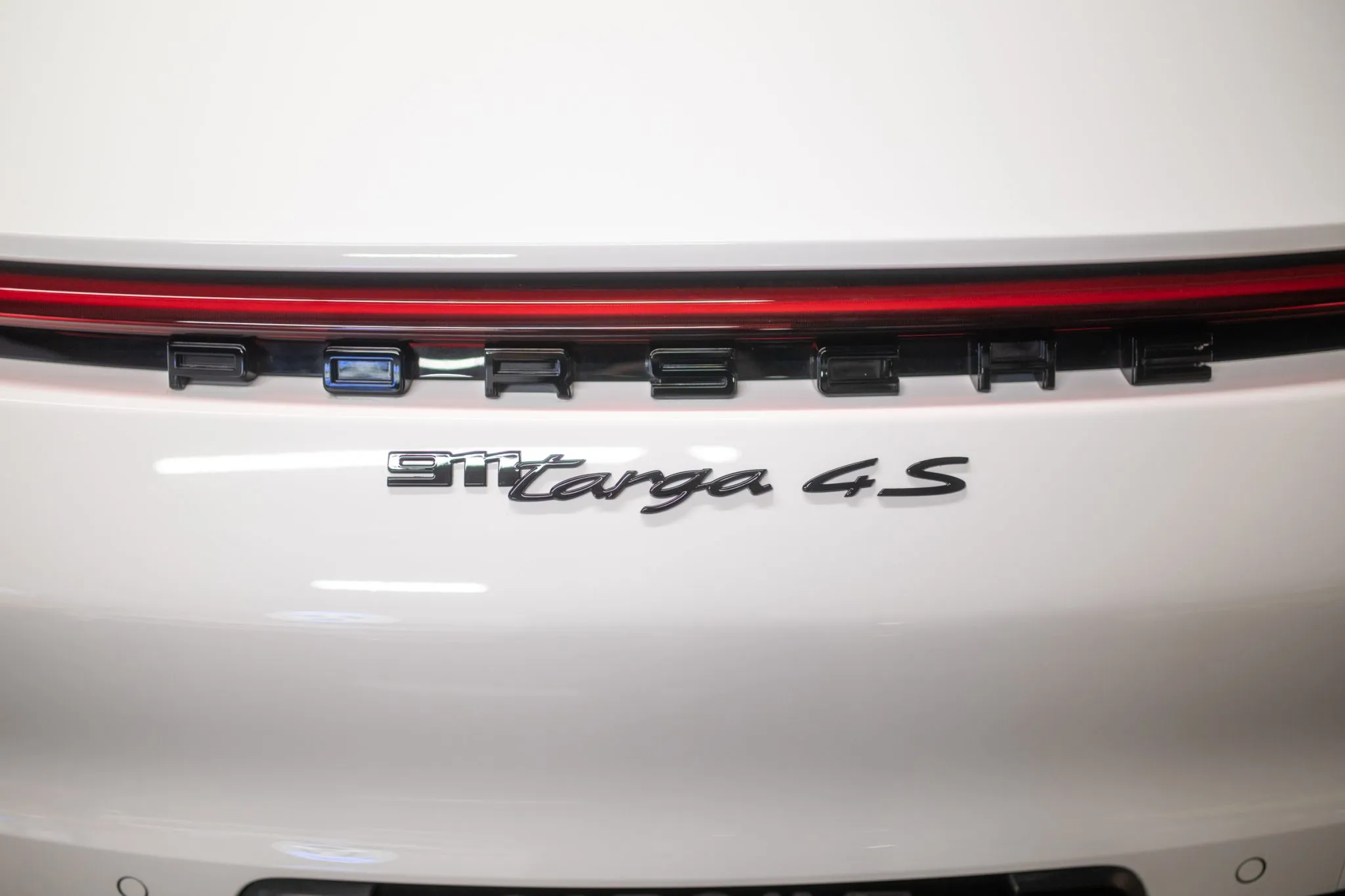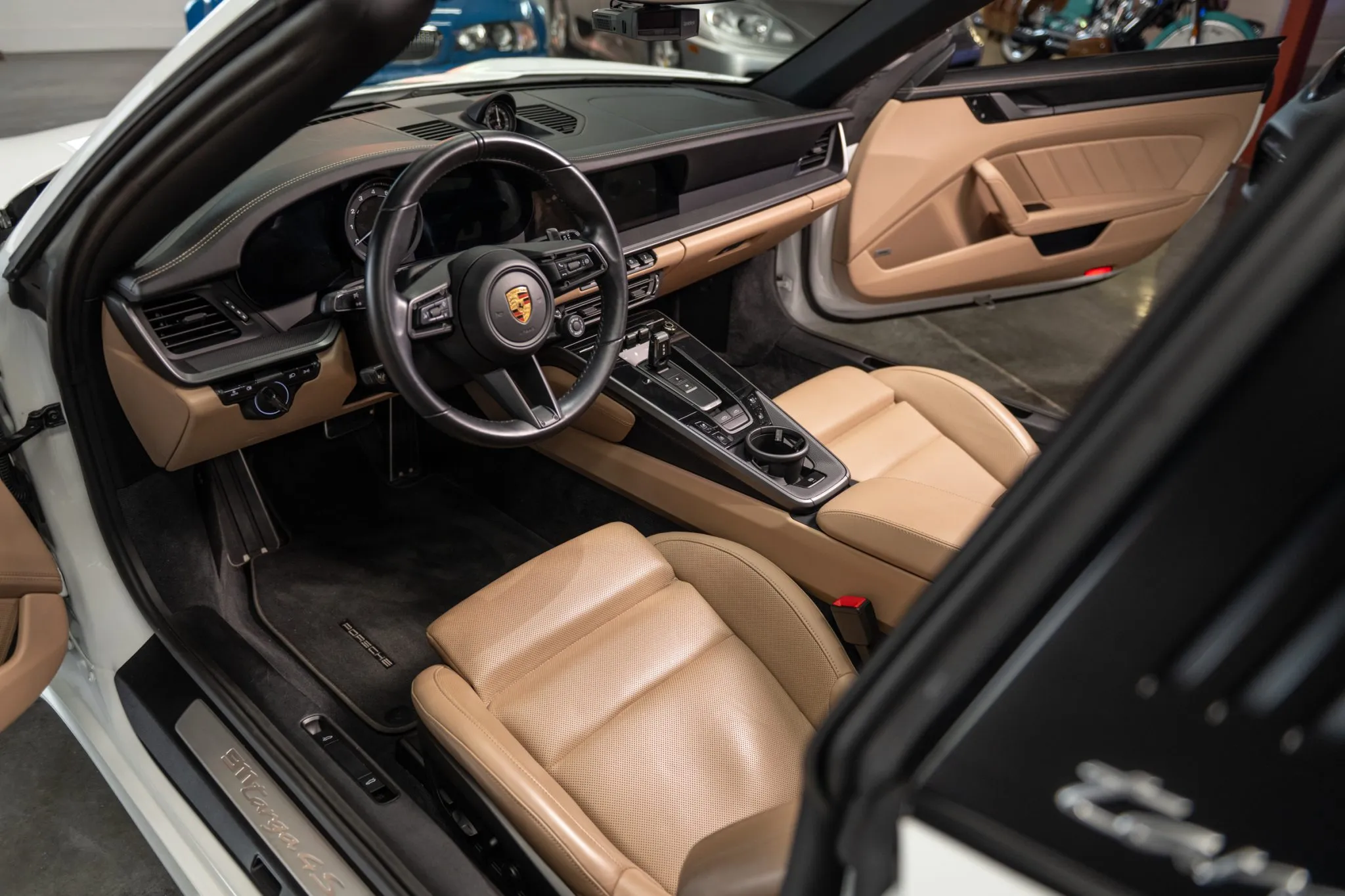 The car is further equipped with a retractable Targa top, LED headlights with PDLS+, Power Steering Plus, a front-axle lift system, 20″ and 21″ Carrera Classic wheels, heated and ventilated power-adjustable front seats, a heated steering wheel, a sport exhaust system, a surround-view camera, a Bose sound system, and Porsche Communication Management with navigation.