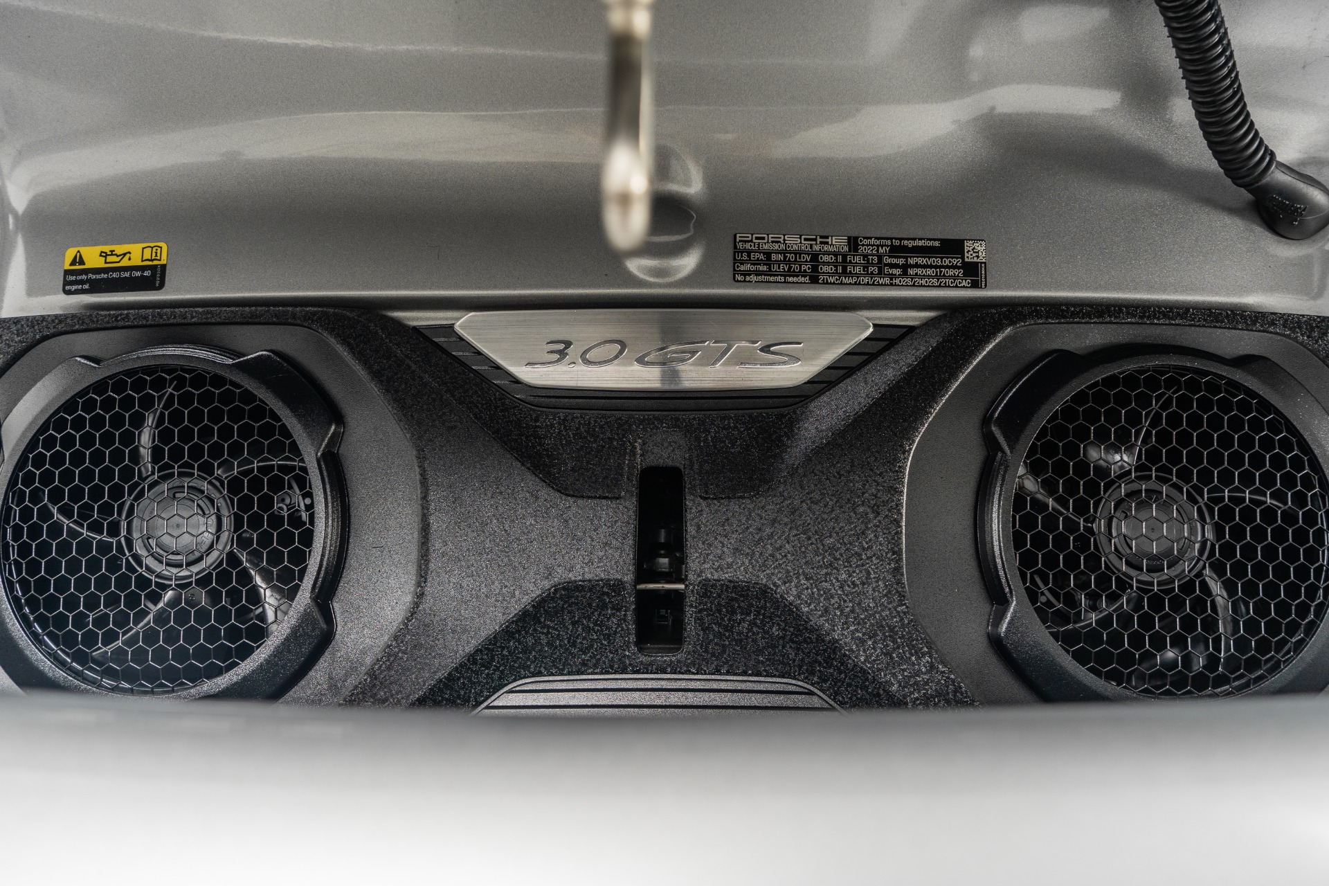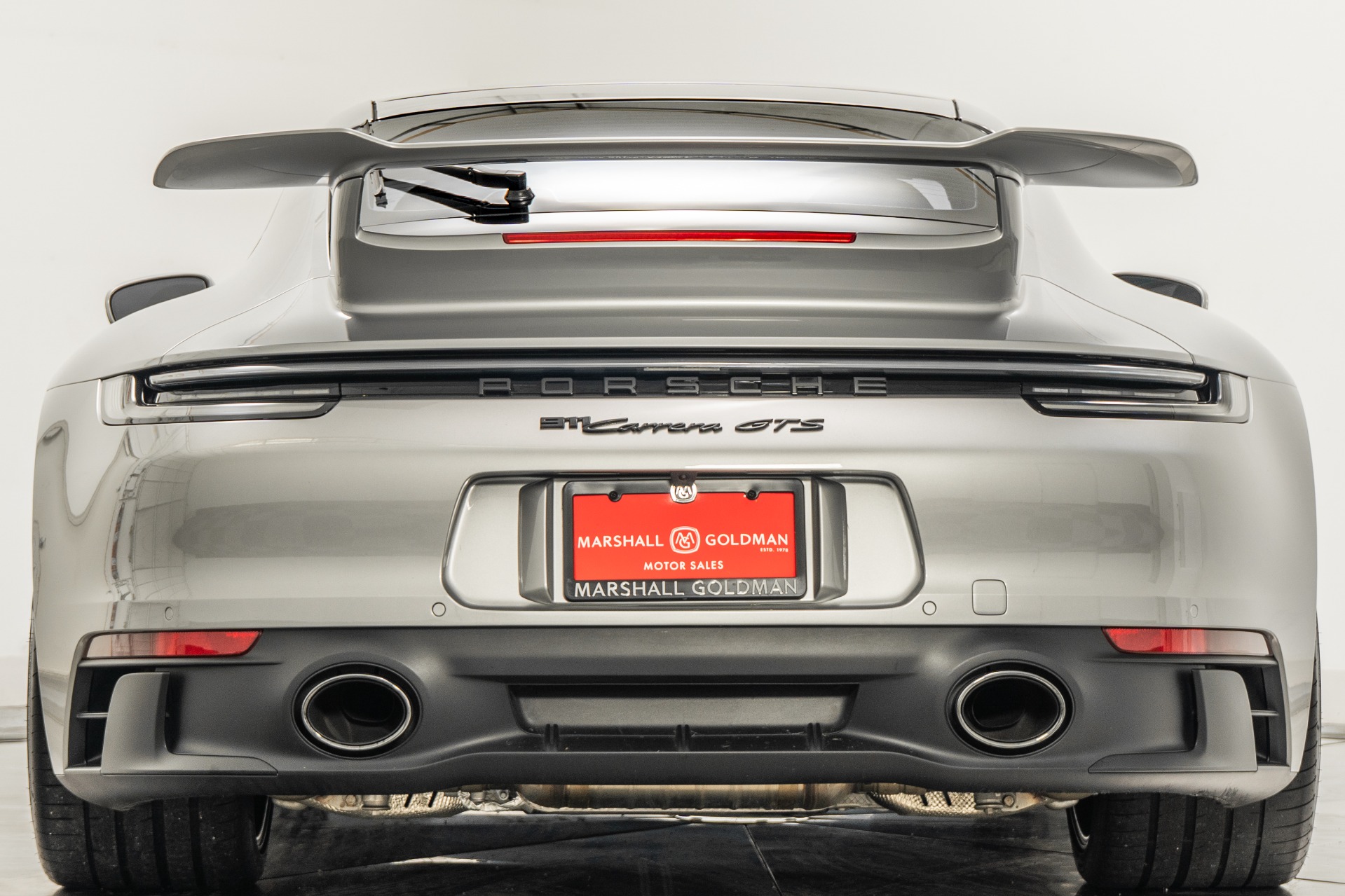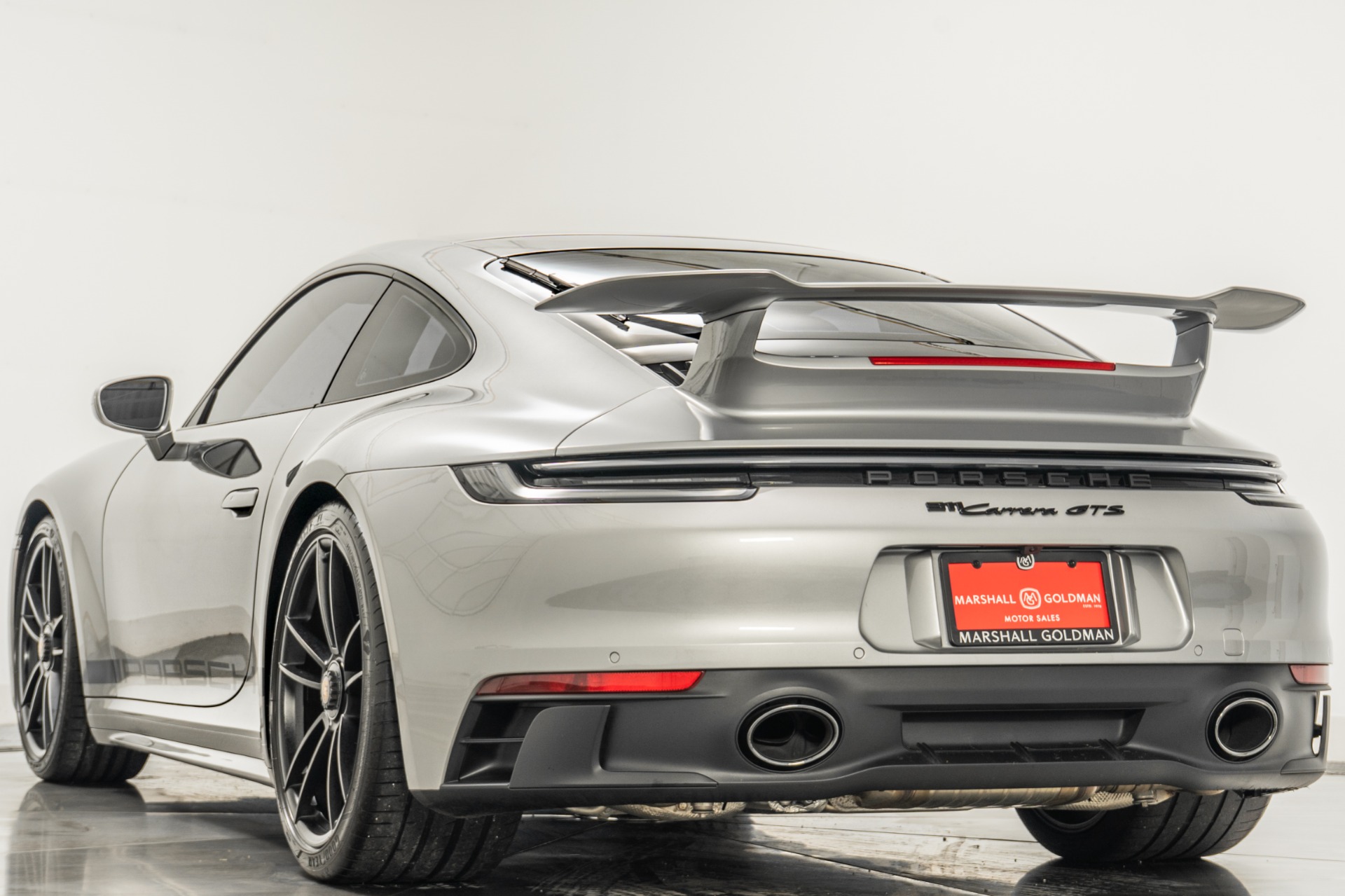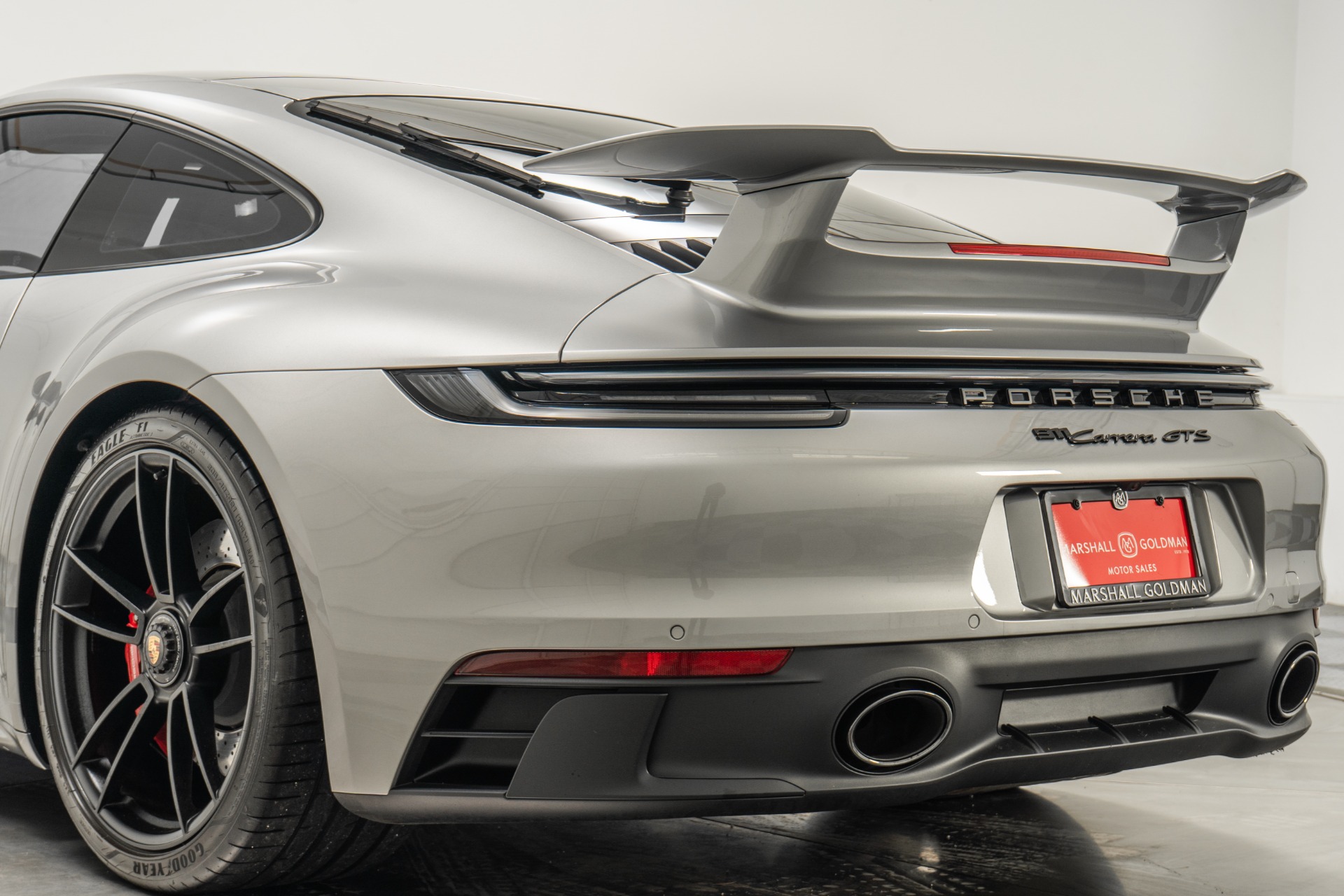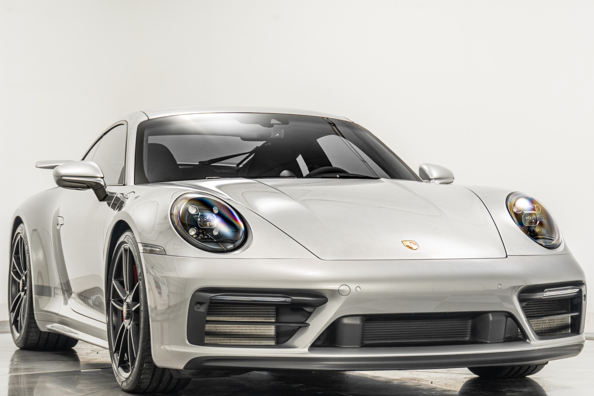 2022 Porsche 911 Carrera 4 GTS in GT Silver Metallic over Black interior with only 2,702 miles.  This GTS is loaded with: 3.0 Liter twin turbo H6 with 473 horsepower, 7 speed manual transmission, 20 inch centerlock wheels in black, red brake calipers, factory Aerokit, SportDesign side skirts, extended range fuel tank, front axle lift, electric slide/tilt sunroof, power folding mirrors with exterior base in body color, rear wiper, full carbon bucket seats with RARE rear seat delete, central tachometer in white, BOSE surround sound system, storage package, ornamental Porsche crest and much more.